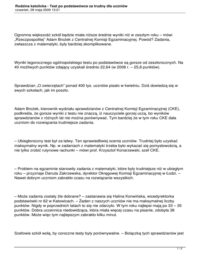Rodzina katolicka - Test po podstawówce za trudny dla uczniów czwartek, 28 maja 2009 13:21 Ogromna większość szkół będzie miała niższe średnie wyniki niż w zeszłym roku – mówi „Rzeczpospolitej” Adam Brożek z Centralnej Komisji Egzaminacyjnej. Powód? Zadania, zwłaszcza z matematyki, były bardziej skomplikowane. Wyniki tegorocznego ogólnopolskiego testu po podstawówce są gorsze od zeszłorocznych. Na 40 możliwych punktów zdający uzyskali średnio 22,64 (w 2008 r. – 25,8 punktów). Sprawdzian „O zwierzętach” ponad 400 tys. uczniów pisało w kwietniu. Dziś dowiedzą się w swych szkołach, jak im poszło. Adam Brożek, kierownik wydziału sprawdzianów z Centralnej Komisji Egzaminacyjnej (CKE), podkreśla, że gorsze wyniki z testu nie znaczą, iż nauczyciele gorzej uczą, bo wyników sprawdzianów z różnych lat nie można porównywać. Tym bardziej że w tym roku CKE dała uczniom do rozwiązania trudniejsze zadania. – Ubiegłoroczny test był za łatwy. Ten sprawiedliwiej ocenia uczniów. Trudniej było uzyskać maksymalny wynik. Np. w zadaniach z matematyki trzeba było wykazać się pomysłowością, a nie tylko zrobić rutynowe rachunki – mówi prof. Krzysztof Konarzewski, szef CKE. – Problem na egzaminie stanowiły zadania z matematyki, które były trudniejsze niż w ubiegłym roku – przyznaje Danuta Zakrzewska, dyrektor Okręgowej Komisji Egzaminacyjnej w Łodzi. – Nawet dobrym uczniom zabrakło czasu na rozwiązanie wszystkich. – Może zadania zostały źle dobrane? – zastanawia się Halina Konwińska, wicedyrektorka podstawówki nr 62 w Katowicach. – Żaden z naszych uczniów nie ma maksymalnej liczby punktów. Nigdy w poprzednich latach to się nie zdarzyło. W tym roku najlepsi mają po 33 – 35 punktów. Dobra uczennica niedowidząca, która miała więcej czasu na pisanie, zdobyła 38 punktów. Może więc tym najlepszym zabrakło kilku minut. Szefowie szkół wolą, by coroczne testy były porównywalne. – Bolączką tych sprawdzianów jest 1/2 Rodzina katolicka - Test po podstawówce za trudny dla uczniów czwartek, 28 maja 2009 13:21 to, że co roku jest inny stopień ich trudności – mówi Stanisław Turek, dyrektor szkoły w Luborzycy koło Krakowa. Szef CKE podkreśla jednak, że umiejętności dzieci się nie zmieniły. Sprawdzian pokazał, że tak jak przed rokiem uczniowie najgorzej radzą sobie z wykorzystywaniem wiedzy w praktyce – w tej części testu na osiem możliwych do zdobycia punktów średnio uzyskali 3,81. Kiepsko wypada pisanie (4,99 na 10 możliwych punktów). Uczniowie dobrzy są za to w czytaniu ze zrozumieniem (7,62 na 10 punktów). W teście lepiej wypadły dzieci z miast niż ze wsi. Co o tegorocznych słabszych wynikach sądzi minister edukacji? – Widocznie pytania były trudniejsze, ale przyjdzie czas na analizę – mówi „Rz” Katarzyna Hall. Taką analizę CKE ma podać w sierpniu. Renata Czeladko Źródło: Rzeczpospolita 2/2