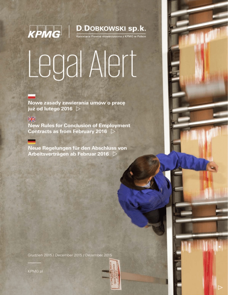 Legal Alert Nowe zasady zawierania umów o pracę już od lutego 2016 New Rules for Conclusion of Employment Contracts as from February 2016 Neue Regelungen für den Abschluss von Arbeitsverträgen ab Februar 2016 Grudzień 2015 / December 2015 / Dezember 2015 KPMG.pl LEGAL ALERT | 2 Nowe zasady zawierania umów o pracę już od lutego 2016 W dniu 22 lutego 2016 r. wejdzie w życie znacząca nowelizacja ustawy z dnia 26 czerwca 1974 r.- Kodeks pracy. Poniżej przedstawiamy najważniejsze zmiany, które mogą mieć istotny wpływ na obowiązki pracodawców zarówno wobec obecnych pracowników, jak i w odniesieniu do umów, które będą zawierane po dniu wejścia w życie nowelizacji. Ograniczenie rodzajów umów o pracę W obecnym stanie prawnym istnieje możliwość zawarcia umowy o pracę na czas nieokreślony, czas określony lub na czas wykonania określonej pracy. Każda z tych umów może być poprzedzona umową o pracę na okres próbny. Ustawodawca zdecydował się na usunięcie z katalogu umów o pracę umowy na czas wykonania określonej pracy. W uzasadnieniu projektu ustawy wskazuje się, że ten rodzaj umowy jest rzadko stosowany w praktyce, a co więcej często budzi wątpliwości, czy dla danego rodzaju pracy dopuszczalne jest zawieranie umowy na czas wykonania określonej pracy czy też należałoby zawrzeć umowę na czas określony. W świetle powyższego uznano, że utrzymanie takiego rodzaju umowy nie wydaje się uzasadnione. Doprecyzowanie regulacji związanych z umową o pracę na okres próbny Nowelizacja precyzuje cel w jakim zawierana jest umowa o pracę na okres próbny (nieprzekraczający 3 miesięcy) – jest nim sprawdzenie kwalifikacji pracownika i możliwości jego zatrudnienia w celu wykonywania określonego rodzaju pracy. Zgodnie z nowymi przepisami, ponowne zawarcie umowy o pracę na okres próbny z tym samym pracownikiem będzie możliwe w następujących przypadkach: 1) jeżeli pracownik miałby być zatrudniony w celu wykonywania innego rodzaju pracy; 2) po upływie co najmniej 3 lat od dnia rozwiązania lub wygaśnięcia poprzedniej umowy o pracę, jeżeli pracownik miałby być zatrudniony w celu wykonywania tego samego rodzaju pracy (w tym przypadku dopuszczalne jest jednokrotne ponowne zawarcie umowy na okres próbny). Zmiany dotyczące zasad zawierania umów o pracę na czas określony oraz zmiany związane z długością okresu wypowiedzenia tych umów Nowe przepisy wprowadzają fundamentalne zmiany dotyczące zawierania umów o pracę na czas określony. Dotychczas ustawa nie precyzowała na jaki okres czasu możliwe jest zawarcie tego rodzaju umowy. W praktyce doprowadziło © 2015 D.Dobkowski spółka komandytowa jest kancelarią prawniczą stowarzyszoną z KPMG w Polsce. Nazwa i logo KPMG są zastrzeżonymi znakami towarowymi bądź znakami towarowymi KPMG International. to do nadużywania przez pracodawców zawierania umów terminowych. Umowy te bardzo często zawierane były na wieloletnie okresy (bez obiektywnego uzasadnienia), podczas gdy uzasadnionym byłoby w takich sytuacjach zawieranie umów o pracę na czas nieokreślony. Nowelizacja wprowadza maksymalny limit czasu, na który będzie mogła zostać zawarta umowa o pracę na czas określony i jednocześnie wskazuje ona maksymalną dopuszczalną łączną liczbę tych umów w ramach wspomnianego limitu. Zgodnie ze znowelizowanym art. 251 § 1 Kodeksu pracy okres zatrudnienia na podstawie umowy o pracę na czas określony, a także łączny okres zatrudnienia na podstawie umów o pracę na czas określony zawieranych między tymi samymi stronami stosunku pracy, nie może przekraczać 33 miesięcy, a łączna liczba tych umów nie może przekraczać trzech. Jeśli limity te zostaną przekroczone, uważa się, że pracownik (odpowiednio od dnia następującego po upływie 33 miesięcy lub od dnia zawarcia czwartej umowy o pracę na czas określony) zatrudniony jest na podstawie umowy o pracę na czas nieokreślony. Nowelizacja przewiduje szereg odstępstw od opisanej wyżej zasady, np. gdy pracodawca wskaże obiektywne przyczyny leżące po jego stronie czy też w celu wykonywania pracy przez okres kadencji, jeżeli służy to zaspokojeniu rzeczywistego okresowego zapotrzebowania i jest niezbędne w tym zakresie w świetle wszystkich okoliczności zawarcia umowy. W określonych w Kodeksie pracy przypadkach pracodawca zobowiązany będzie zawiadomić właściwego okręgowego inspektora pracy o zawarciu umowy, która wykracza poza ustawowy limit czasowy, wraz ze wskazaniem przyczyn jej zawarcia, w terminie 5 dni roboczych od dnia jej zawarcia. Niedopełnienie tego obowiązku stanowić będzie wykroczenie pracodawcy, podlegające grzywnie do 30 000 zł. Co istotne, zawarcie umowy wykraczającej poza ustawowy limit czasowy będzie wymagało odzwierciedlenia w treści umowy okoliczności i obiektywnych przyczyn uzasadniających zawarcie takiej umowy. Ustawodawca znowelizował także przepisy dotyczące wypowiadania umów o pracę na czas określony. Dotychczas, zgodnie z art. 33 Kodeksu pracy, przy zawieraniu umowy o pracę na czas określony, dłuższy niż 6 miesięcy, strony mogły przewidzieć dopuszczalność wcześniejszego rozwiązania umowy za dwutygodniowym wypowiedzeniem. W praktyce doprowadzało to do sytuacji, w której do LEGAL ALERT | 3 pracowników będących de facto w porównywalnych sytuacjach (zatrudnieni na podstawie umowy o pracę na czas nieokreślony i zatrudnieni na podstawie wieloletnich umów o pracę na czas określony) zastosowanie miały odmienne zasady dotyczące okresu wypowiedzenia - w przypadku tych pierwszych okres wypowiedzenia uzależniony był od stażu pracy, a w przypadku tych drugich był to sztywny dwutygodniowy okres wypowiedzenia (o ile strony w ogóle przewidziały taką możliwość). Zgodnie ze znowelizowanymi przepisami, długość okresu wypowiedzenia w przypadku umowy na czas nieokreślony i na czas określony będzie taka sama i zależeć będ