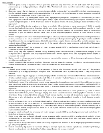 Praca, energia 1. Człowiek pcha paczkę o ciężarze 270N po poziomej podłodze, siłą skierowaną w dół pod kątem 45° do poziomu, przesuwając ją ze stałą prędkością na odległość 9.1m. Współczynnik tarcia o podłoże wynosi 0.2. Jaką pracę wykona człowiek. 2. Skrzynia o masie 14kg jest ciągnięta za pomocą liny po podłodze poziomą siłą F o wartości 40N.w trakcie przemieszczenia o d=0,5m prędkość skrzyni zmalała z od wartości v1=0,6m/s do wartości v=0,2m/s. Wyznacz: a) pracę, wykonaną przez siłę F, b) zmianę energii kinetycznej układu, c) pracę siły tarcia. 3. Niedźwiadek o masie 25kg ześlizguje się po pniu sosny. Jego prędkość początkowa, na wysokości 12m nad Ziemią jest równa zeru, a prędkość w chwili dotarcia do ziemi wynosi 5,6m/s. a) Ile wynosi zmiana energii potencjalnej niedźwiadka? b) Ile wynosi energia kinetyczna w chwili dotarcia do ziemi? c) Ile wynosi średnia siła tarcia, działająca na niedźwiadka w czasie jego ruchu? 4. Strażak o masie 70kg zjeżdża po pionowym słupie o wysokości 4,3m, startując ze stanu spoczynku. a) Załóż, że strażak trzyma słup bardzo lekko, tak że działające między nimi tarcie jest znikomo małe, i oblicz prędkość strażaka w chwili dotarcia na dolny poziom. b) Załóż z kolei, że strażak trzyma się słupa mocniej, tak że działa na niego ze strony słupa skierowana w górę siła tarcia o wartości 500N. Oblicz w tym przypadku prędkość strażaka w chwili dotarcia na dolny poziom. 5. Dziecko ześlizguje się bez tarcia wzdłuż zjeżdżalni na placu zabaw, a ponieważ jest trochę wystraszone, matka przytrzymuje je nieco, działając na nie siłą o wartości F = 100N skierowaną wzdłuż zjeżdżalni w górę. Po przebyciu wzdłuż zjeżdżalni drogi 1,8m dziecko ma energię kinetyczną 30J. Zakładamy, iż na początku dziecko spoczywało a na końcu znajduje się na poziomie ziemi. Oblicz pracę wykonaną przez siłę F. Ile wynosi całkowita praca wykonana nad dzieckiem? Jaką pracę wykonała siła ciężkości? 6. Jaką pracę należy wykonać, aby przesunąć o 2 metry skrzynię o masie 1000 kg po równi pochyłej o kącie nachylenia 45 o. Zaniedbać tarcie skrzyni o równię. 7. Oblicz pracę jaką musi wykonać człowiek chcący przesunąć ciało o masie m=100 kg wzdłuż równi pochyłej o kącie nachylenia 30o na wysokość 10m. Współczynnik tarcia ciała o równię wynosi f=0.1. Jaka część pracy została zużyta na pokonanie siły tarcia? 8. Ciężar o masie m wiszący na sznurku został spuszczony z wysokości d pionowo w dół ze stałym przyspieszeniem równym g/4. Jaką pracę wykonała lina? 9. Kamień o masie 0,5 kg rzucono z wysokości 50 m pod pewnym kątem do poziomu z prędkością początkową v0=10m/s. Kamień upadł na ziemię z prędkością 20m/s. Jaką pracę wykonała siła oporu powietrza? Praca, energia 1. Człowiek pcha paczkę o ciężarze 270N po poziomej podłodze, siłą skierowaną w dół pod kątem 45° do poziomu, przesuwając ją ze stałą prędkością na odległość 9.1m. Współczynnik tarcia o podłoże wynosi 0.2. Jaką pracę wykona człowiek. 2. Skrzynia o masie 14kg jest ciągnięta za pomocą liny po podłodze poziomą siłą F o wartości 40N.w trakcie przemieszczenia o d=0,5m prędkość skrzyni zmalała z od wartości v1=0,6m/s do wartości v=0,2m/s. Wyznacz: a) pracę, wykonaną przez siłę F, b) zmianę energii kinetycznej układu, c) pracę siły tarcia. 3. Niedźwiadek o masie 25kg ześlizguje się po pniu sosny. Jego prędkość początkowa, na wysokości 12m nad Ziemią jest równa zeru, a prędkość w chwili dotarcia do ziemi wynosi 5,6m/s. a) Ile wynosi zmiana energii potencjalnej niedźwiadka? b) Ile wynosi energia kinetyczna w chwili dotarcia do ziemi? c) Ile wynosi średnia siła tarcia, działająca na niedźwiadka w czasie jego ruchu? 4. Strażak o masie 70kg zjeżdża po pionowym słupie o wysokości 4,3m, startując ze stanu spoczynku. a) Załóż, że strażak trzyma słup bardzo lekko, tak że działające między nimi tarcie jest znikomo małe, i oblicz prędkość strażaka w chwili dotarcia na dolny poziom. b) Załóż z kolei, że strażak trzyma się słupa mocniej, tak że działa na niego ze strony słupa skierowana w górę siła tarcia o wartości 500N. Oblicz w tym przypadku prędkość strażaka w chwili dotarcia na dolny poziom. 5. Dziecko ześlizguje się bez tarcia wzdłuż zjeżdżalni na placu zabaw, a ponieważ jest trochę wystraszone, matka przytrzymuje je nieco, działając na nie siłą o wartości F = 100N skierowaną wzdłuż zjeżdżalni w górę. Po przebyciu wzdłuż zjeżdżalni drogi 1,8m dziecko ma energię kinetyczną 30J. Zakładamy, iż na początku dziecko spoczywało a na końcu znajduje się na poziomie ziemi. Oblicz pracę wykonaną przez siłę F. Ile wynosi całkowita praca wykonana nad dzieckiem? Jaką pracę wykonała siła ciężkości? 6. Jaką pracę należy wykonać, aby przesunąć o 2 metry skrzynię o masie 1000 kg po równi pochyłej o kącie nachylenia 45 o. Zaniedbać tarcie skrzyni o równię. 7. Oblicz pracę jaką musi wykonać człowiek chcący przesunąć ciało o masie m=100 kg wzdłuż równi pochyłej o kącie nachylenia 30o na wysokość 10m. Współczynnik tarcia ciała o równię wynosi f=0.1. Jaka część pracy została zużyta na pokonanie siły tarcia? 8. Ciężar o masie m wiszący na sznurku został spuszczony z wysokości d pionowo w dół ze stałym przyspieszeniem równym g/4. Jaką pracę wykonała lina? 9. Kamień o masie 0,5 kg rzucono z wysokości 50 m pod pewnym kątem do poziomu z prędkością początkową v0=10m/s. Kamień upadł na ziemię z prędkością 20m/s. Jaką pracę wykonała siła oporu powietrza?