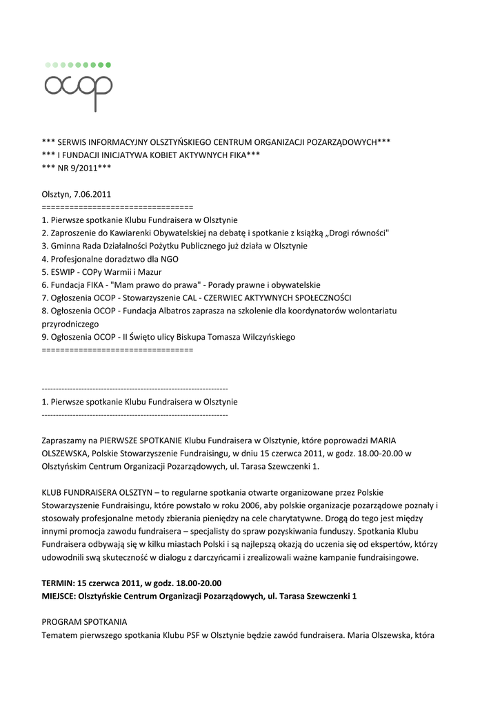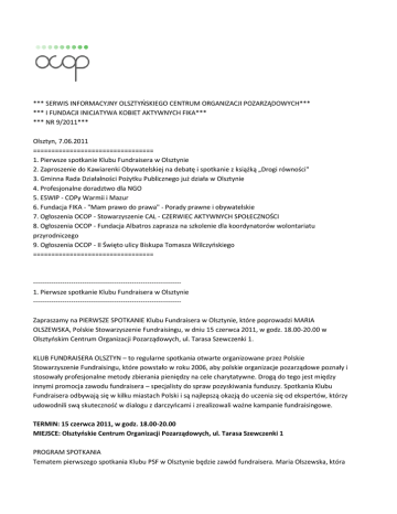 *** SERWIS INFORMACYJNY OLSZTYOSKIEGO CENTRUM ORGANIZACJI POZARZĄDOWYCH*** *** I FUNDACJI INICJATYWA KOBIET AKTYWNYCH FIKA*** *** NR 9/2011*** Olsztyn, 7.06.2011 ================================= 1. Pierwsze spotkanie Klubu Fundraisera w Olsztynie 2. Zaproszenie do Kawiarenki Obywatelskiej na debatę i spotkanie z książką „Drogi równości" 3. Gminna Rada Działalności Pożytku Publicznego już działa w Olsztynie 4. Profesjonalne doradztwo dla NGO 5. ESWIP - COPy Warmii i Mazur 6. Fundacja FIKA - "Mam prawo do prawa" - Porady prawne i obywatelskie 7. Ogłoszenia OCOP - Stowarzyszenie CAL - CZERWIEC AKTYWNYCH SPOŁECZNOŚCI 8. Ogłoszenia OCOP - Fundacja Albatros zaprasza na szkolenie dla koordynatorów wolontariatu przyrodniczego 9. Ogłoszenia OCOP - II Święto ulicy Biskupa Tomasza Wilczyoskiego ================================= -----------------------------------------------------------------1. Pierwsze spotkanie Klubu Fundraisera w Olsztynie -----------------------------------------------------------------Zapraszamy na PIERWSZE SPOTKANIE Klubu Fundraisera w Olsztynie, które poprowadzi MARIA OLSZEWSKA, Polskie Stowarzyszenie Fundraisingu, w dniu 15 czerwca 2011, w godz. 18.00-20.00 w Olsztyoskim Centrum Organizacji Pozarządowych, ul. Tarasa Szewczenki 1. KLUB FUNDRAISERA OLSZTYN – to regularne spotkania otwarte organizowane przez Polskie Stowarzyszenie Fundraisingu, które powstało w roku 2006, aby polskie organizacje pozarządowe poznały i stosowały profesjonalne metody zbierania pieniędzy na cele charytatywne. Drogą do tego jest między innymi promocja zawodu fundraisera – specjalisty do spraw pozyskiwania funduszy. Spotkania Klubu Fundraisera odbywają się w kilku miastach Polski i są najlepszą okazją do uczenia się od ekspertów, którzy udowodnili swą skutecznośd w dialogu z darczyocami i zrealizowali ważne kampanie fundraisingowe. TERMIN: 15 czerwca 2011, w godz. 18.00-20.00 MIEJSCE: Olsztyoskie Centrum Organizacji Pozarządowych, ul. Tarasa Szewczenki 1 PROGRAM SPOTKANIA Tematem pierwszego spotkania Klubu PSF w Olsztynie będzie zawód fundraisera. Maria Olszewska, która ukooczyła roczne szkolenie fundraisingowe i jako jedna z pierwszych w Polsce uzyskała Polski Certyfikat Fundraisingu, przedstawi ideę i zasady profesjonalnego zbierania pieniędzy na działalnośd organizacji pozarządowych i instytucji publicznych. Spotkanie jest współorganizowane w ramach projektu „COPy Warmii i Mazur. Sied Centrów Organizacji Pozarządowych Województwa Warmiosko-Mazurskiego” przez Związek Stowarzyszeo „Razem w Olsztynie”. Obowiązuje rezerwacja miejsc. Zgłoszenia mailem na adres: [email protected] zaproszenie.pdf Dodatkowe informacje: Polskie Stowarzyszenie Fundraisingu tel. 12 423 80 07 OCOP, tel. 503 680 500 --------------------------------------------------------------------2. Zaproszenie do Kawiarenki Obywatelskiej na debatę i spotkanie z książką „Drogi równości" --------------------------------------------------------------------Serdecznie zapraszamy do Kawiarenki Obywatelskiej na debatę i spotkanie z książką „Drogi równości Izabela Jaruga-Nowacka – polityczka, feministka, działaczka lewicy, które odbędzie się 14 czerwca (wtorek) godz. 17-19 w Olsztyoskim Centrum Organizacji Pozarządowych ul. Tarasa Szewczenki 1. Książka została wydana przez Fundację Przestrzenie Dialogu w pierwszą rocznicę tragicznej śmierci Izabeli Jarugi-Nowackiej w katastrofie pod Smoleoskiem. Napisana przez jej przyjaciół i współpracowników, traktuje o dorobku politycznym i społecznym tej wybitnej postaci, wicepremierze i ministrze polityki społecznej, posłance, feministce i obrooczyni praw człowieka. Podczas dyskusji w Olsztynie rozmawiad będziemy o stanie współpracy pomiędzy społeczeostwem obywatelek i obywateli, a wybieranymi przez nas ludźmi polityki. Czy naprawdę oddziela nas mur? Jak powinniśmy działad, by relacje pomiędzy klasą polityczną, władzą i „zwykłymi ludźmi” cechowała współpraca i wzajemna zrozumienie? - oto wybrane zagadnienia naszego spotkania. W spotkaniu udział wezmą: Zuzanna Dąbrowska – współredaktorka książki i autorka tekstów, dziennikarka, współpracowniczka Izy w Biurze Pełnomocnika Rządu ds. Równego Statusu Kobiet i Mężczyzn; Katarzyna Kądziela – współredaktorka książki i autorka tekstów, działaczka feministyczna, bliska współpracowniczka Izy w latach 2001-2010; Piotr Janiszewski - Fundacja Forum Dialogu Publicznego; Monika Falej - Olsztyoskie Centrum Organizacji Pozarządowych. Osoby uczestniczące w spotkaniu otrzymają egzemplarz książki. Więcej informacji na stronach: www.przestrzeniedialogu.org plakat_a3_olsztyn.pdf do pobrania >> Spotkanie współorganizują: Wydawca: Fundacja Przestrzenie Dialogu Partner projektu: Fundacja im. Róży Luksemburg Partner lokalny: Związek Stowarzyszeo "Razem w Olsztynie" prowadzący Olsztyoskie Centrum Organizacji Pozarządowych Spotkanie jest organizowane w ramach projektu „COPy Warmii i Mazur. Sieć Centrów Organizacji Pozarządowych Województwa Warmiosko-Mazurskiego” przez Związek Stowarzyszeo „Razem w Olsztynie”. --------------------------------------------------------------------3. Gminna Rada Działalności Pożytku Publicznego już działa w Olsztynie --------------------------------------------------------------------Prezydent Miasta Olsztyn powołał Gminną Radę Działalności Pożytku Publicznego będącą organem konsultacyjnym i opiniodawczym w sprawach związanych z działalnością organizacji pozarządowych oraz innych podmiotów wymienionych w art. 3. ust. 3 ustawy z dnia 24 kwietnia 2003 roku o działalności pożytku publicznego i o wolontariacie. 14. czerwca odbędzie się pierwsze posiedzenie Rady, na którym członkowie wybiorą spośród siebie przewodniczącego, a także omówią plan pracy na 2011 rok. Skład Rady: 1. Monika Falej – przedstawicielka organizacji pozarządowych 2.