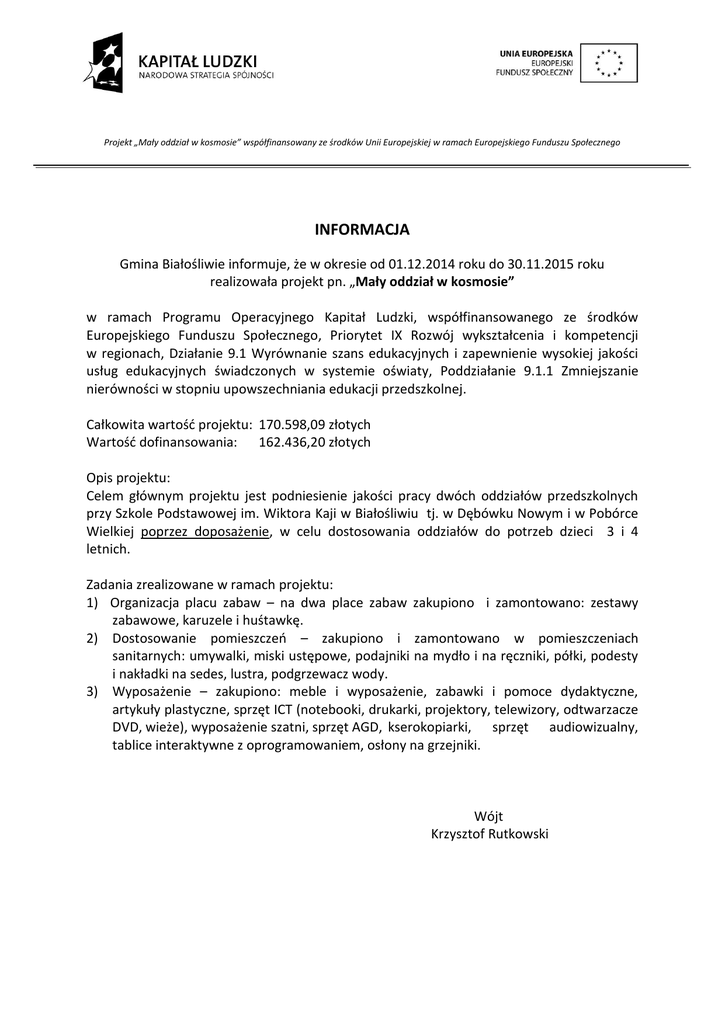Projekt „Mały oddział w kosmosie” współfinansowany ze środków Unii Europejskiej w ramach Europejskiego Funduszu Społecznego INFORMACJA Gmina Białośliwie informuje, że w okresie od 01.12.2014 roku do 30.11.2015 roku realizowała projekt pn. „Mały oddział w kosmosie” w ramach Programu Operacyjnego Kapitał Ludzki, współfinansowanego ze środków Europejskiego Funduszu Społecznego, Priorytet IX Rozwój wykształcenia i kompetencji w regionach, Działanie 9.1 Wyrównanie szans edukacyjnych i zapewnienie wysokiej jakości usług edukacyjnych świadczonych w systemie oświaty, Poddziałanie 9.1.1 Zmniejszanie nierówności w stopniu upowszechniania edukacji przedszkolnej. Całkowita wartość projektu: 170.598,09 złotych Wartość dofinansowania: 162.436,20 złotych Opis projektu: Celem głównym projektu jest podniesienie jakości pracy dwóch oddziałów przedszkolnych przy Szkole Podstawowej im. Wiktora Kaji w Białośliwiu tj. w Dębówku Nowym i w Pobórce Wielkiej poprzez doposażenie, w celu dostosowania oddziałów do potrzeb dzieci 3 i 4 letnich. Zadania zrealizowane w ramach projektu: 1) Organizacja placu zabaw – na dwa place zabaw zakupiono i zamontowano: zestawy zabawowe, karuzele i huśtawkę. 2) Dostosowanie pomieszczeń – zakupiono i zamontowano w pomieszczeniach sanitarnych: umywalki, miski ustępowe, podajniki na mydło i na ręczniki, półki, podesty i nakładki na sedes, lustra, podgrzewacz wody. 3) Wyposażenie – zakupiono: meble i wyposażenie, zabawki i pomoce dydaktyczne, artykuły plastyczne, sprzęt ICT (notebooki, drukarki, projektory, telewizory, odtwarzacze DVD, wieże), wyposażenie szatni, sprzęt AGD, kserokopiarki, sprzęt audiowizualny, tablice interaktywne z oprogramowaniem, osłony na grzejniki. Wójt Krzysztof Rutkowski