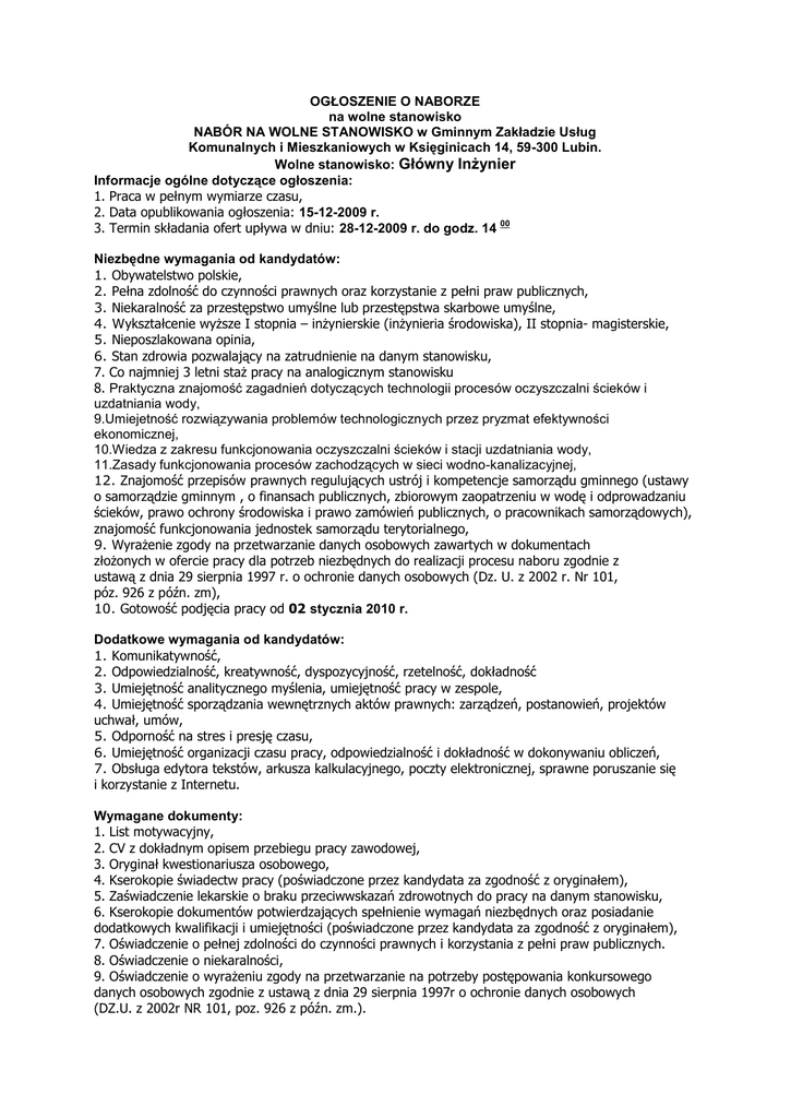 OGŁOSZENIE O NABORZE na wolne stanowisko NABÓR NA WOLNE STANOWISKO w Gminnym Zakładzie Usług Komunalnych i Mieszkaniowych w Księginicach 14, 59-300 Lubin. Wolne stanowisko: Główny Inżynier Informacje ogólne dotyczące ogłoszenia: 1. Praca w pełnym wymiarze czasu, 2. Data opublikowania ogłoszenia: 15-12-2009 r. 00 3. Termin składania ofert upływa w dniu: 28-12-2009 r. do godz. 14 Niezbędne wymagania od kandydatów: 1. Obywatelstwo polskie, 2. Pełna zdolność do czynności prawnych oraz korzystanie z pełni praw publicznych, 3. Niekaralność za przestępstwo umyślne lub przestępstwa skarbowe umyślne, 4. Wykształcenie wyższe I stopnia – inżynierskie (inżynieria środowiska), II stopnia- magisterskie, 5. Nieposzlakowana opinia, 6. Stan zdrowia pozwalający na zatrudnienie na danym stanowisku, 7. Co najmniej 3 letni staż pracy na analogicznym stanowisku 8. Praktyczna znajomość zagadnień dotyczących technologii procesów oczyszczalni ścieków i uzdatniania wody, 9.Umiejetność rozwiązywania problemów technologicznych przez pryzmat efektywności ekonomicznej, 10.Wiedza z zakresu funkcjonowania oczyszczalni ścieków i stacji uzdatniania wody, 11.Zasady funkcjonowania procesów zachodzących w sieci wodno-kanalizacyjnej, 12. Znajomość przepisów prawnych regulujących ustrój i kompetencje samorządu gminnego (ustawy o samorządzie gminnym , o finansach publicznych, zbiorowym zaopatrzeniu w wodę i odprowadzaniu ścieków, prawo ochrony środowiska i prawo zamówień publicznych, o pracownikach samorządowych), znajomość funkcjonowania jednostek samorządu terytorialnego, 9. Wyrażenie zgody na przetwarzanie danych osobowych zawartych w dokumentach złożonych w ofercie pracy dla potrzeb niezbędnych do realizacji procesu naboru zgodnie z ustawą z dnia 29 sierpnia 1997 r. o ochronie danych osobowych (Dz. U. z 2002 r. Nr 101, póz. 926 z późn. zm), 10. Gotowość podjęcia pracy od 02 stycznia 2010 r. Dodatkowe wymagania od kandydatów: 1. Komunikatywność, 2. Odpowiedzialność, kreatywność, dyspozycyjność, rzetelność, dokładność 3. Umiejętność analitycznego myślenia, umiejętność pracy w zespole, 4. Umiejętność sporządzania wewnętrznych aktów prawnych: zarządzeń, postanowień, projektów uchwał, umów, 5. Odporność na stres i presję czasu, 6. Umiejętność organizacji czasu pracy, odpowiedzialność i dokładność w dokonywaniu obliczeń, 7. Obsługa edytora tekstów, arkusza kalkulacyjnego, poczty elektronicznej, sprawne poruszanie się i korzystanie z Internetu. Wymagane dokumenty: 1. List motywacyjny, 2. CV z dokładnym opisem przebiegu pracy zawodowej, 3. Oryginał kwestionariusza osobowego, 4. Kserokopie świadectw pracy (poświadczone przez kandydata za zgodność z oryginałem), 5. Zaświadczenie lekarskie o braku przeciwwskazań zdrowotnych do pracy na danym stanowisku, 6. Kserokopie dokumentów potwierdzających spełnienie wymagań niezbędnych oraz posiadanie dodatkowych kwalifikacji i umiejętności (poświadczone przez kandydata za zgodność z oryginałem), 7. Oświadczenie o pełnej zdolności do czynności prawnych i korzystania z pełni praw publicznych. 8. Oświadczenie o niekaralności, 9. Oświadczenie o wyrażeniu zgody na przetwarzanie na potrzeby postępowania konkursowego danych osobowych zgodnie z ustawą z dnia 29 sierpnia 1997r o ochronie danych osobowych (DZ.U. z 2002r NR 101, poz. 926 z późn. zm.). Zakres wykonywanych zadań na stanowisku: 1.Organizowanie pracy oraz nadzór nad prawidłową eksploatacją sieci i urządzeń wodnokanalizacyjnych, 2.Opracowywanie planów techniczno-ekonomicznych remontów sieci wodno-kanalizacyjnych, 3.Organizacja i bieżący nadzór nad właściwa praca obiektów oczyszczalni ścieków i stacji uzdatniania wody, przepompownie ścieków, hydrofornie, lokalne punkty tłoczne, 4.Optymalizacja technologii na oczyszczalniach ścieków i stacji uzdatniania wody, 5.Opracowywanie obowiązującej sprawozdawczości i statystyki, 6.Stosowanie w praktyce przepisów w zakresie ochrony środowiska, Miejsce składania ofert: Dokumenty aplikacyjne należy składać lub przesłać w terminie do 28 grudnia 2009r. do godz. 1400 pod adresem: Gminny Zakład Usług Komunalnych i Mieszkaniowych Księginice 14 59-300 Lubin Sekretariat Zakładu w zamkniętych kopertach z dopiskiem: Nabór na wolne stanowisko „Główny Inżynier” Uwaga: Aplikacje, które wpłyną do zakładu po wyżej określonym terminie nie będą rozpatrywane. Kandydaci zakwalifikowani zostaną poinformowani telefonicznie o terminie rozmowy kwalifikacyjnej. Informacja o wyniku naboru będzie umieszczona na stronie internetowej Biuletynu Informacji Publicznej (www. bip.ug.lubin.dolnośląskie.pl) oraz na tablicy informacyjnej w siedzibie Gminnego Zakładu Usług Komunalnych i Mieszkaniowych w Księginicach 14. Dyrektor Gminnego Zakładu Usług Komunalnych i Mieszkaniowych /-/Bożena Kuśnierz