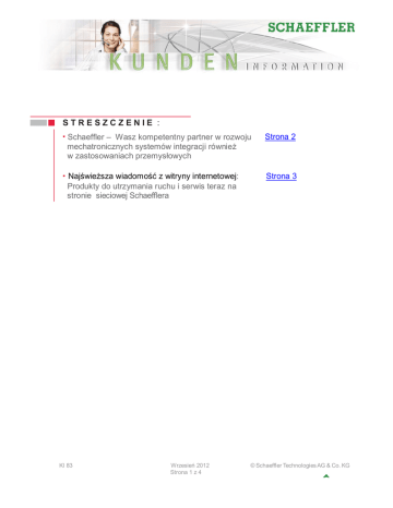 STRESZCZENIE : · Schaeffler – Wasz kompetentny partner w rozwoju mechatronicznych systemów integracji równie w zastosowaniach przemys owych Strona 2 · Naj wie sza wiadomo z witryny internetowej: Produkty do utrzymania ruchu i serwis teraz na stronie sieciowej Schaefflera Strona 3 KI 83 Wrzesie 2012 Strona 1 z 4 © Schaeffler Technologies AG & Co. KG Schaeffler – Wasz kompetentny partner w rozwoju mechatronicznych systemów integracji równie w zastosowaniach przemys owych yska toczne i prowadnice liniowe stanowi g ówne sk adowe techniki nap dowej. Pracuj one w centrum ruchu, dlatego te tworz naturalny punkt odniesienia do integrowania dalszych czynno ci pomiarowych, regulacji i sterowania. Mechatroniczny system integracji to jednak znacznie wi cej ni tylko po czenie najlepszych komponentów w jedn ca . Rozstrzygaj cym dla funkcjonowania ca ci jest w ciwe dostrojenie poszczególnych elementów. Lagereinheit für OP-Deckenstative mit Hamulec elektromagnetyczny Grupa Schaeffler ma dziesi ciolecia do wiadcze Lekko biegu- yska suportu z sensorami, zintegrowane w nap dzie rowerów elektrycznych za sob w zakresie satysfakcjonuj cego integrowania elektroniki, sensoryki i sk adowych nap du w rodowisku ysk tocznych i prowadnic liniowych. Wspólnie z naszymi filiami, jak specjali ci od nap dów bezpo rednich IDAM i silnymi partnerami w dziedzinie sensoryki i elektroniki, jak Continental AG, firma Schaeffler mo e osi gn wszelkie kwalifikacje niezb dne do integracji elektroniki z mechanik . Broszura „Mechatroniczne systemy integracyjne. Wasza szansa, nasze wiadczenia“ (PMS) daje krótki przegl d naszego potencja u i kwalifikacji w mechatronicznych systemach integracji w zastosowaniach przemys owych. Link Wasz partner do rozmów z dzia u sprzeda y firmy Schaeffler oraz eksperci od mechatroniki w technice zastosowa ch tnie przedyskutuj z Wami mo liwe koncepcje, jak mo na dalej optymalizowa rozwi zania mechatroniczne w Waszych zastosowaniach. KI 83 Wrzesie 2012 Strona 2 z 4 Publikacja „Mechatroniczne systemy integracyjne. Wasza szansa, nasze wiadczenia“ (PMS) © Schaeffler Technologies AG & Co. KG Naj wie sza wiadomo z witryny internetowej: produkty do utrzymania ruchu i serwis teraz na stronach internetowych Schaefflera Od 01.08.2012 wyroby do utrzymania ruchu i serwis firmy Schaeffler s teraz w pe ni obecne równie na stronach internetowych Schaefflera (www.schaeffler.de/.com/.es). Przedtem informacje te mo na by o znale nie w sieci centralnej ale na rozmaitych platformach. Nowe elementy menu pod has ami „Wyroby i serwis“ („Produkte & Services“ ) „Wyroby INA/FAG“ („INA/FAG Produkte“) zawieraj wszystkie istotne informacje dotycz ce wyrobów i us ug w zakresie monta u i demonta u, smarowania, osiowania, monitorowania jak te regeneracji ysk tocznych. Na odno nych stronach o wyrobie i w Mediatece Schaefflera stoj do dyspozycji stosowne publikacje , jak przyk adowo aktualny Katalog utrzymania IS1, i softwerowe programy do pobrania. Tre – dost pna dotychczas w niemieckim, angielskim i hiszpa skim – zostanie w przysz osci rozszerzona o dalsze wersje zykowe. Wszystkie informacje odno nie serwisu przemys owego i przemys owego rynku wtórnego mo na znale pod www.schaeffler.de/services wzgl dnie www.schaeffler.de/aftermarket. KI 83 Wrzesie 2012 Strona 3 z 4 © Schaeffler Technologies AG & Co. KG W sprawie dalszych informacji i zapyta prosimy zwraca si do Waszego biura sprzeda y Schaefflera. KI 83 Wrzesie 2012 Strona 4 z 4 © Schaeffler Technologies AG & Co. KG