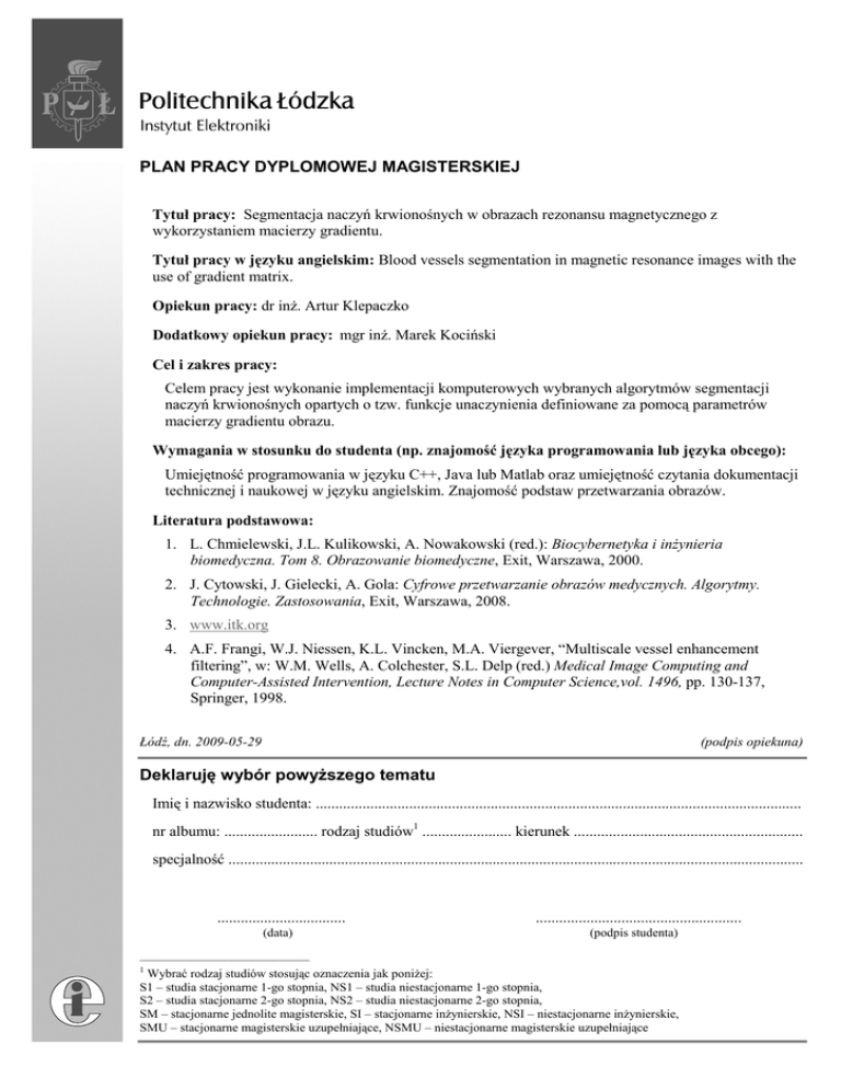 PLAN PRACY DYPLOMOWEJ MAGISTERSKIEJ Tytuł pracy: Segmentacja naczyń krwionośnych w obrazach rezonansu magnetycznego z wykorzystaniem macierzy gradientu. Tytuł pracy w języku angielskim: Blood vessels segmentation in magnetic resonance images with the use of gradient matrix. Opiekun pracy: dr inŜ. Artur Klepaczko Dodatkowy opiekun pracy: mgr inŜ. Marek Kociński Cel i zakres pracy: Celem pracy jest wykonanie implementacji komputerowych wybranych algorytmów segmentacji naczyń krwionośnych opartych o tzw. funkcje unaczynienia definiowane za pomocą parametrów macierzy gradientu obrazu. Wymagania w stosunku do studenta (np. znajomość języka programowania lub języka obcego): Umiejętność programowania w języku C++, Java lub Matlab oraz umiejętność czytania dokumentacji technicznej i naukowej w języku angielskim. Znajomość podstaw przetwarzania obrazów. Literatura podstawowa: 1. L. Chmielewski, J.L. Kulikowski, A. Nowakowski (red.): Biocybernetyka i inŜynieria biomedyczna. Tom 8. Obrazowanie biomedyczne, Exit, Warszawa, 2000. 2. J. Cytowski, J. Gielecki, A. Gola: Cyfrowe przetwarzanie obrazów medycznych. Algorytmy. Technologie. Zastosowania, Exit, Warszawa, 2008. 3. www.itk.org 4. A.F. Frangi, W.J. Niessen, K.L. Vincken, M.A. Viergever, “Multiscale vessel enhancement filtering”, w: W.M. Wells, A. Colchester, S.L. Delp (red.) Medical Image Computing and Computer-Assisted Intervention, Lecture Notes in Computer Science,vol. 1496, pp. 130-137, Springer, 1998. Łódź, dn. 2009-05-29 (podpis opiekuna) Deklaruję wybór powyŜszego tematu Imię i nazwisko studenta: ............................................................................................................................. nr albumu: ........................ rodzaj studiów1 ....................... kierunek ........................................................... specjalność .................................................................................................................................................... ................................. (data) ..................................................... (podpis studenta) –––––––––––––––––––––––– 1 Wybrać rodzaj studiów stosując oznaczenia jak poniŜej: S1 – studia stacjonarne 1-go stopnia, NS1 – studia niestacjonarne 1-go stopnia, S2 – studia stacjonarne 2-go stopnia, NS2 – studia niestacjonarne 2-go stopnia, SM – stacjonarne jednolite magisterskie, SI – stacjonarne inŜynierskie, NSI – niestacjonarne inŜynierskie, SMU – stacjonarne magisterskie uzupełniające, NSMU – niestacjonarne magisterskie uzupełniające