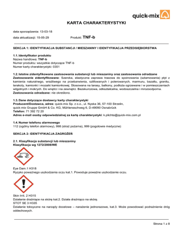 KARTA CHARAKTERYSTYKI data sporządzenia: 13-03-18 data aktualizacji: 15-05-29 Produkt: TNF-b SEKCJA 1: IDENTYFIKACJA SUBSTANCJI / MIESZANINY I IDENTYFIKACJA PRZEDSIĘBIORSTWA 1.1. Identyfikator produktu Nazwa handlowa: TNF-b Numer produktu: wszystkie dotyczące TNF-b Numer karty charakterystyki: 0351 1.2. Istotne zidentyfikowane zastosowania substancji lub mieszaniny oraz zastosowania odradzane Zastosowanie zidentyfikowane: Szeroka, elastyczna zaprawa trasowa do spoinowania (szlamowania) płyt z kamienia naturalnego, wrażliwego na przebarwienia, szlifowanych i polerowanych, marmuru, bazaltu, granitu, terakoty, kamionki i mozaiki kamionkowej. Stosowana na tarasy, balkony, podłoża ogrzewane i w pomieszczeniach wilgotnych i mokrych. Do wnętrz i na zewnątrz. Bezskurczowa, odkształcalna, wodoszczelna i mrozoodporna. Zastosowania odradzane: nie określono. 1.3. Dane dotyczące dostawcy karty charakterystyki Producent/Dostawca, adres: quick-mix Sp. z o.o., ul. Nyska 36, 57-100 Strzelin, quick-mix Gruppe GmbH & Co. KG, Mühleneschweg 6, D-49090 Osnabrück Telefon: 71 392 72 20 Adres e-mail osoby odpowiedzialnej za kartę charakterystyki: [email protected] 1.4. Numer telefonu alarmowego 112 (ogólny telefon alarmowy), 998 (straż pożarna), 999 (pogotowie medyczne) SEKCJA 2: IDENTYFIKACJA ZAGROŻEŃ 2.1. Klasyfikacja substancji lub mieszaniny Klasyfikacja wg 1272/2008/WE Eye Dam.1 H318 Ryzyko poważnego uszkodzenia oczu kat.1. Powoduje poważne uszkodzenie oczu. Skin Irrit. 2 H315 Działanie drażniące na skórę kat.2. Działa drażniąco na skórę. STOT SE 3 H335 Działanie toksyczne na narządy docelowe – narażenie jednorazowe, kat.3. Może powodować podrażnienie dróg oddechowych. Strona 1 z 8 KARTA CHARAKTERYSTYKI data sporządzenia: 13-03-18 data aktualizacji: 15-05-29 Produkt: TNF-b 2.2. Elementy oznakowania Piktogramy określające rodzaj zagrożenia i hasło ostrzegawcze Niebezpieczeństwo Nazwy niebezpiecznych składników umieszczonych na etykiecie Zawiera: Cement portlandzki Zwroty wskazujące rodzaj zagrożenia H315 - działa drażniąco na skórę H318 - powoduje poważne uszkodzenie oczu H335 - może powodować podrażnienie dróg oddechowych Zwroty wskazujące środki ostrożności P101 - w razie konieczności zasięgnięcia porady lekarza należy pokazać pojemnik lub etykietę P102 - chronić przed dziećmi P103 - przed użyciem przeczytać etykietę P261 - unikać wdychania pyłu/dymu/gazu/mgły/par/rozpylonej cieczy P271 - stosować wyłącznie na zewnątrz lub w dobrze wentylowanym pomieszczeniu P280 - stosować rękawice ochronne/odzież ochronną/ochronę oczu/ochronę twarzy P302+P352 - w przypadku kontaktu ze skórą: umyć dużą ilością wody z mydłem P304+P340 - w przypadku dostania się do dróg oddechowych: wyprowadzić lub wynieść poszkodowanego na świeże powietrze i zapewnić warunki do odpoczynku w pozycji umożliwiającej swobodne oddychanie P305+P351+P338 - w przypadku dostania się do oczu: ostrożnie płukać wodą przez kilka minut. Wyjąć soczewki kontaktowe, jeżeli są i można je łatwo usunąć. Nadal płukać. P310 - natychmiast skontaktować się z ośrodkiem zatruć lub lekarzem P332+P313 - w przypadku wystąpienia podrażnienia skóry: zasięgnąć porady/ zgłosić się pod opiekę lekarza P362 - zanieczyszczoną odzież zdjąć i wyprać przed ponownym użyciem P501 - zawartość/pojemnik usuwać zgodnie z lokalnymi/regionalnymi/narodowymi/międzynarodowymi przepisami 2.3. Inne zagrożenia Oznaczenie zagrożenia „drażniący” nie dotyczy suchego produktu. Zagrożenie to występuje przy zetknięciu z wilgocią/wodą (reakcja zasadowa). Niska zawartość chromianu wg TRGS 613. Zawartość chromu VI zredukowana do poziomu < 2ppm. Zawarte w produkcie substancje nie spełniają kryteriów PBT lub vPvB zgodnie z załącznikiem XIII Rozporządzenia REACH. SEKCJA 3: SKŁAD / INFORMACJA O SKŁADNIKACH 3.1. Substancje Nie dotyczy. 3.2. Mieszaniny Strona 2 z 8 KARTA CHARAKTERYSTYKI data sporządzenia: 13-03-18 data aktualizacji: 15-05-29 Cement portlandzki Produkt: TNF-b Nr WE EINECS 266-043-4 Nr CAS 65997-15-1 Klasyfikacja wg 1272/2008/WE Zakres stężeń Eye Dam.1 H318 Skin Irrit.2 H315 STOT SE 3 H335 10 – 25% Substancja z określoną na poziomie wspólnotowym i krajowym wartością najwyższego dopuszczalnego stężenia w środowisku pracy. Pełen tekst zwrotów H przytoczony został w sekcji 16 karty. SEKCJA 4: ŚRODKI PIERWSZEJ POMOCY 4.1. Opis środków pierwszej pomocy W kontakcie ze skórą: Zdjąć natychmiast części garderoby zabrudzone produktem. Skórę natychmiast spłukać wodą i mydłem. W wypadku przedłużającego się podrażnienia skóry skonsultować się z lekarzem. W kontakcie z oczami: Przez kilka minut płukać oczy z odchyloną powieką pod bieżącą wodą. Skonsultować się z lekarzem. W przypadku spożycia: Nie wywoływać wymiotów. Wypłukać usta wodą. Natychmiast skontaktować się z lekarzem – pokazać opakowanie lub etykietę. Po narażeniu drogą oddechową: Zapewnić dostęp świeżego powietrza. Skontaktować się z lekarzem. 4.2. Najważniejsze ostre i opóźnione objawy oraz skutki narażenia W kontakcie ze skórą: brak danych W kontakcie z oczami: brak danych W przypadku spożycia: brak danych Po narażeniu drogą oddechową: brak danych 4.3. Wskazania dotyczące wszelkiej natychmiastowej pomocy lekarskiej i szczególnego postępowania z poszkodowanym Decyzję o sposobie postępowania ratunkowego podejmuje lekarz po dokładnej ocenie stanu poszkodowanego. SEKCJA 5: POSTĘPOWANIE W PRZYPADKU POŻARU 5.1. Środki gaśnicze Odpowiednie środki gaśnicze: środki gaśnicze zależą od warunków otoczenia. Niewłaściwe środki gaśnicze: pełny strumień wody 5.2. Szczególne zagrożenia związane z substancją lub mieszaniną Podczas spalania nie powstają niebezpieczne produkty. 5.3. Informacje dla straży pożarnej Produkt jest drażniący, w przypadku dużego zapylenia w miejscu pożar
