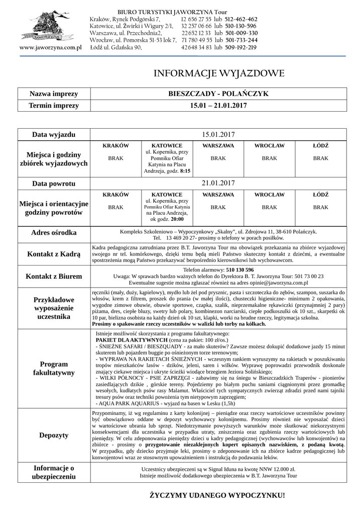 www.jaworzyna.com.pl BIURO TURYSTYKI JAWORZYNA Tour Kraków, Rynek Podgórski 7, 12 656 27 55 lub 512-462-462 Katowice, ul. Żwirki i Wigury 2/1, 32 257 06 66 lub 510-130-596 Warszawa, ul. Przechodnia2, 22 652 12 33 lub 501-009-330 Wrocław, ul. Pomorska 51-53 lok 7, 71 780 49 55 lub 501-733-244 Łódź ul. Gdańska 90, 42 648 34 83 lub 509-192-219 INFORMACJE WYJAZDOWE Nazwa imprezy BIESZCZADY - POLAŃCZYK Termin imprezy 15.01 – 21.01.2017 Data wyjazdu 15.01.2017 KRAKÓW Miejsca i godziny zbiórek wyjazdowych BRAK KATOWICE ul. Kopernika, przy Pomniku Ofiar Katynia na Placu Andrzeja, godz. 8:15 Data powrotu Miejsca i orientacyjne godziny powrotów WARSZAWA WROCŁAW ŁÓDŹ BRAK BRAK BRAK 21.01.2017 KRAKÓW KATOWICE ul. Kopernika, przy WARSZAWA WROCŁAW ŁÓDŹ BRAK Pomniku Ofiar Katynia BRAK BRAK BRAK na Placu Andrzeja, ok godz. 20:00 Adres ośrodka Kompleks Szkoleniowo – Wypoczynkowy „Skalny”, ul. Zdrojowa 11, 38-610 Polańczyk. Tel. 13 469 20 27- prosimy o telefony w porach posiłków. Kontakt z Kadrą Kadra pedagogiczna zatrudniana przez B.T. Jaworzyna Tour ma obowiązek przekazania na zbiórce wyjazdowej swojego nr tel. komórkowego, dzięki temu będą mieli Państwo skuteczny kontakt z dziećmi, a ewentualne spostrzeżenia mogą Państwo przekazywać bezpośrednio kierownikowi lub wychowawcom. Kontakt z Biurem Telefon alarmowy: 510 130 596 Uwaga: W sprawach bardzo ważnych telefon do Dyrektora B. T. Jaworzyna Tour: 501 73 00 23 Ewentualne sugestie można zgłaszać również na adres [email protected] Przykładowe wyposażenie uczestnika ręczniki (mały, duży, kąpielowy), mydło lub żel pod prysznic, pasta i szczoteczka do zębów, szampon, suszarka do włosów, krem z filtrem, proszek do prania (w małej ilości), chusteczki higieniczne- minimum 2 opakowania, wygodne zimowe obuwie, obuwie sportowe, czapka, szalik, nieprzemakalne rękawiczki (przynajmniej 2 pary) piżama, dres, ciepłe bluzy, swetry lub polary, kombinezon narciarski, ciepłe podkoszulki ok 10 szt., skarpetki ok 10 par, bielizna osobista na każdy dzień ok 10 szt, klapki, worki na brudne rzeczy, legitymacja szkolna. Prosimy o spakowanie rzeczy uczestników w walizki lub torby na kółkach. Program fakultatywny Istnieje możliwość skorzystania z programu fakultatywnego: PAKIET DLA AKTYWNYCH (cena za pakiet: 100 zł/os.) - ŚNIEŻNE SAFARI / BIESZQUADY - za mało skuterów? Zawsze możesz dokupić dodatkowe jazdy 15 minut skuterem lub pojazdem buggie po ośnieżonym torze terenowym; - WYPRAWA NA RAKIETACH ŚNIEŻNYCH - wczesnym rankiem wyruszymy na rakietach w poszukiwaniu tropów mieszkańców lasów - dzików, jeleni, saren i wilków. Wyprawę poprowadzi przewodnik doskonale znający ciekawe miejsca i ukryte ścieżki wiodące brzegiem Jeziora Solińskiego; - WILKI PÓŁNOCY - PSIE ZAPRZĘGI - zabawimy się na śniegu w Bieszczadzkich Traperów - pionierów zasiedlających dzikie , górskie tereny. Pojedziemy po białym puchu saniami ciągnionymi przez gromadkę wesołych, kudłatych psów rasy Malamut. Właściciel tych sympatycznych zwierząt zdradzi przed nami tajniki tresury psów oraz techniki powożenia tym nietypowym zaprzęgiem; - AQUA PARK AQUARIUS - wyjazd na basen w Lesku (1,5h) Depozyty Przypominamy, iż wg regulaminu z karty kolonijnej – pieniądze oraz rzeczy wartościowe uczestników powinny być obowiązkowo oddane w depozyt wychowawcy kolonijnemu. Prosimy również nie wyposażać dzieci w wartościowe ubrania lub sprzęt. Niedotrzymanie powyższych warunków może skutkować niekorzystnymi konsekwencjami dla uczestnika w przypadku utraty, zniszczenia oraz zgubienia rzeczy wartościowych lub pieniędzy. W celu zdeponowania pieniędzy dzieci u kadry pedagogicznej (wychowawców lub konwojentów) na zbiórce - prosimy o przygotowanie niezaklejonych kopert opisanych nazwiskiem, z podaną kwotą. W przypadku, gdy dziecko przyjmuje leki, prosimy o zdeponowanie ich na zbiórce kadrze pedagogicznej lub konwojentowi wraz ze stosownym upoważnieniem i instrukcją do podawania leków. Informacje o ubezpieczeniu Uczestnicy ubezpieczeni są w Signal Iduna na kwotę NNW 12.000 zł. Istnieje możliwość dodatkowego ubezpieczenia w B.T. Jaworzyna Tour ŻYCZYMY UDANEGO WYPOCZYNKU!