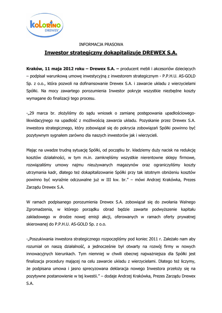 INFORMACJA PRASOWA Inwestor strategiczny dokapitalizuje DREWEX S.A. Kraków, 11 maja 2012 roku – Drewex S.A. – producent mebli i akcesoriów dziecięcych – podpisał warunkową umowę inwestycyjną z inwestorem strategicznym - P.P.H.U. AS-GOLD Sp. z o.o., która pozwoli na dofinansowanie Drewex S.A. i zawarcie układu z wierzycielami Spółki. Na mocy zawartego porozumienia Inwestor pokryje wszystkie niezbędne koszty wymagane do finalizacji tego procesu. -„29 marca br. złożyliśmy do sądu wniosek o zamianę postępowania upadłościowegolikwidacyjnego na upadłość z możliwością zawarcia układu. Pozyskanie przez Drewex S.A. inwestora strategicznego, który zobowiązał się do pokrycia zobowiązań Spółki powinno być pozytywnym sygnałem zarówno dla naszych inwestorów jak i wierzycieli. Mając na uwadze trudną sytuację Spółki, od początku br. kładziemy duży nacisk na redukcję kosztów działalności, w tym m.in. zamknęliśmy wszystkie nierentowne sklepy firmowe, rozwiązaliśmy umowy najmu nieużywanych magazynów oraz ograniczyliśmy koszty utrzymania kadr, dlatego też dokapitalizowanie Spółki przy tak istotnym obniżeniu kosztów powinno być wyraźnie odczuwalne już w III kw. br.” – mówi Andrzej Krakówka, Prezes Zarządu Drewex S.A. W ramach podpisanego porozumienia Drewex S.A. zobowiązał się do zwołania Walnego Zgromadzenia, w którego porządku obrad będzie zawarte podwyższenie kapitału zakładowego w drodze nowej emisji akcji, oferowanych w ramach oferty prywatnej skierowanej do P.P.H.U. AS-GOLD Sp. z o.o. -„Poszukiwania inwestora strategicznego rozpoczęliśmy pod koniec 2011 r. Zależało nam aby rozumiał on naszą działalność, a jednocześnie był otwarty na rozwój firmy w nowych innowacyjnych kierunkach. Tym niemniej w chwili obecnej najważniejsza dla Spółki jest finalizacja procedury mającej na celu zawarcie układu z wierzycielami. Dlatego też liczymy, że podpisana umowa i jasno sprecyzowana deklaracja nowego Inwestora przełoży się na pozytywne postanowienie w tej kwestii.” – dodaje Andrzej Krakówka, Prezes Zarządu Drewex S.A. Zgodnie z zwartym porozumieniem P.P.H.U. AS-GOLD Sp. z o.o. zobowiązała się do dokapitalizowania Drewex S.A. w formie gotówkowej, w kwocie niezbędnej do realizacji układu z wierzycielami Spółki, lecz nie niższej niż 1 mln zł. -„Informacja o złożeniu wniosku o zamianę postępowania upadłościowego-likwidacyjnego na upadłość z możliwością zawarcia układu została pozytywnie odebrana przez naszych wierzycieli. Dlatego też, porozumienie zawarte z P.P.H.U. AS-GOLD Sp. z o.o. będziemy chcieli także wykorzystać do rozmów z bankami w zakresie renegocjacji warunków obsługi zaciągniętych kredytów.” – mówi Andrzej Krakówka, Prezes Zarządu Drewex S.A. *** Drewex S.A. – producent mebli i akcesoriów dla dzieci i niemowląt. Od 1993 roku firma zajmuje się produkcją łóżeczek dla dzieci i niemowląt. Od początku 2000 roku firma rozpoczęła produkcję artykułów pościelowych do swych wyrobów stolarskich (łóżeczek dziecinnych).W skład tego działu wchodzi produkcja pościeli dziecięcej (poszwy, poszewki, poduszki, kołdry) oraz akcesoriów pościelowych (ochraniacze do łóżeczek, rożki, baldachimy, przyborniki, torby na pieluchy, zasłony, abażury na lampy wiszące i stojące, materace do łóżeczek, pledy, artykuły dekoracyjne nad szufladę w łóżeczkach dziecinnych). Następnie od 2003 roku nastąpiło uruchomienie kolejnej linii produktów, tj. produkcji odzieży dla dzieci i niemowląt. Przez okres 12 miesięcy wypracowano i wypromowano markę handlową PePe wraz z własną ofertą handlową, która przedstawiana jest dwa razy do roku potencjalnym odbiorcom. W 2006 roku marka handlowa PePe została zastąpiona marką handlową Kolorino. Aktualnie firma produkuje szeroki wachlarz wyrobów niezbędnych do wyposażenia dzieci i niemowląt w meble, pościel i ubiory, które tworzą harmonijne zestawy i komplety z motywami przewodnimi dla każdej z kolekcji. http://www.gpw.drewex.com