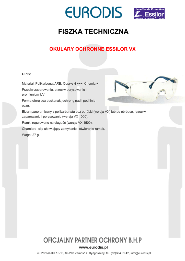 OKULARY OCHRONNE ESSILOR VX OPIS: Materiał: Polikarbonat ARB, Odpryski +++, Chemia + Przeciw zaparowaniu, przeciw porysowaniu i promieniom UV Forma oferująca doskonałą ochronę nad i pod linią oczu. Ekran panoramiczny z polikarbonatu bez obróbki (wersja VX) lub po obróbce, rpzeciw zaparowaniu i porysowaniu (wersja VX 1000). Ramki regulowane na długość (wersja VX 1500). Charniere- clip ułatwiający zamykanie i otwieranie ramek. Waga: 27 g.