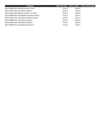 Produkty Cena (brutto) Cena (netto) Moxie 530824 Girlz Głowa do czesania - blond 75,00 zł 60,98 zł Moxie 519751 Girlz Lalka Kellan z pupilem 55,00 zł 44,72 zł Moxie 530831 Girlz Głowa do czesania - brunetka 75,00 zł 60,98 zł Moxie 530800 Girlz Lalka Sophina w szkolnym ubiorze 47,00 zł 38,21 zł Moxie 530817 Girlz Lalka Kellan w szkolnym ubiorze 47,00 zł 38,21 zł Moxie 528869 Girlz Lalka Avery w płaszczu 75,00 zł 60,98 zł Moxie 528883 Girlz Lalka Bryten w płaszczu 75,00 zł 60,98 zł Moxie 528876 Girlz Lalka Sophina w płaszczu 75,00 zł 60,98 zł Cena promocyjna