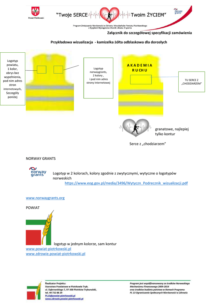 Załącznik do szczegółowej specyfikacji zamówienia Przykładowa wizualizacja - kamizelka żółta odblaskowa dla dorosłych Logotyp powiatu, 1 kolor, obrys bez wypełnienia, pod nim adres stron internetowych, Szczegóły poniżej Logotyp norwaygrants, 2 kolory , i pod nim adres strony internetowej AKADEMIA R U CH U TU SERCE Z „CHODZIARZEM” granatowe, najlepiej tylko kontur Serce z „chodziarzem” NORWAY GRANTS Logotyp w 2 kolorach, kolory zgodnie z zwytycznymi, wytyczne o logotypów norweskich https://www.eog.gov.pl/media/3496/Wytyczn_Podrecznik_wizualizacji.pdf www.norwaygrants.org POWIAT logotyp w jednym kolorze, sam kontur www.powiat-piotrkowski.pl www.zdrowie.powiat-piotrkowski.pl