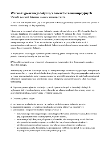 Warunki gwarancji dotyczące towarów konsumpcyjnych Warunki gwarancji dotyczące towarów konsumpcyjnych. 1. FUJIFILM Europe GmbH (Sp. z o.o.) Oddział w Polsce gwarantuje sprawne działanie sprzętu w okresie 12 miesięcy od daty sprzedaży. Ujawnione w tym czasie niesprawne działanie sprzętu, niezawinione przez Użytkownika, będzie usuwane bezpłatnie przez autoryzowany serwis Fujifilm. W terminie do 14 dni roboczych Zgłaszający zostanie powiadomiony o przyjęciu lub powodach odrzucenia reklamacji. Naprawa zostanie wykonana w terminie do 30 dni roboczych od daty dostarczenia sprzętu do autoryzowanego serwisu. Okres ten może ulec wydłużeniu w przypadku konieczności sprowadzenia części spoza terytorium Polski. Zakres terytorialny ochrony gwarancyjnej stanowi obszar Rzeczypospolitej Polskiej. 2. Kupującemu przysługuje wymiana sprzętu na nowy, jeżeli autoryzowany serwis stwierdzi na piśmie, że usunięcie wady nie jest możliwe. 3.Warunkiem rozpatrzenia reklamacji jako naprawy gwarancyjnej jest dostarczenie sprzętu z dowodem zakupu. Reklamujący powinien dostarczyć sprzęt do autoryzowanego serwisu w oryginalnym, kompletnym opakowaniu fabrycznym. W razie braku kompletnego opakowania fabrycznego ryzyko uszkodzenia w czasie transportu do i z autoryzowanego serwisu ponosi Reklamujący. W razie braku zasadności reklamacji (sprzęt sprawny), klient może zostać obciążony kosztami transportu i/lub ekspertyzy technicznej. 4. Naprawa gwarancyjna nie obejmuje czynności przewidzianych w instrukcji obsługi, do wykonania których zobowiązany jest użytkownik we własnym zakresie i na własny koszt, np.: sprawdzenie działania, konserwacja, wymiana baterii, itp. 5. Gwarancją nie są objęte: a) mechaniczne uszkodzenia sprzętu i wywołane nimi niesprawne działanie sprzętu, b) czyszczenie sprzętu, wewnętrznych zabrudzeń wizjera, obiektywu lub matrycy, c) uszkodzenia i niesprawne działanie sprzętu wynikłe z: • niewłaściwego lub niezgodnego z instrukcją użytkowania, przechowywania, konserwacji (np. zapiaszczenie lub zalanie płynem, wylanie baterii), • samowolnych (dokonywanych przez użytkownika, nie autoryzowany serwis lub inne nieupoważnione osoby) napraw, przeróbek lub innych zmian konstrukcyjnych, • użytkowania sprzętu niesprawnego, powodującego powiększenie uszkodzeń, • podłączenia aparatu do niesprawnego urządzenia elektronicznego lub niespełniającego wymogów wymienionych w instrukcji obsługi aparatu. d) aparaty, z których został usunięty nr seryjny umożliwiający identyfikację e) akcesoria typu: paski nośne, osłony, baterie i akumulatory 6. Sprzęt sprawny przysłany do autoryzowanego serwisu, a zgłaszany jako niesprawny z powodu nie zaznajomienia się z instrukcją obsługi, bądź np. używaniem niewłaściwych baterii, będzie odsyłany na koszt Reklamującego. 7. Gwarancja nie wyłącza, nie ogranicza ani nie zawiesza uprawnień Kupującego wynikających z niezgodności towaru z umową.