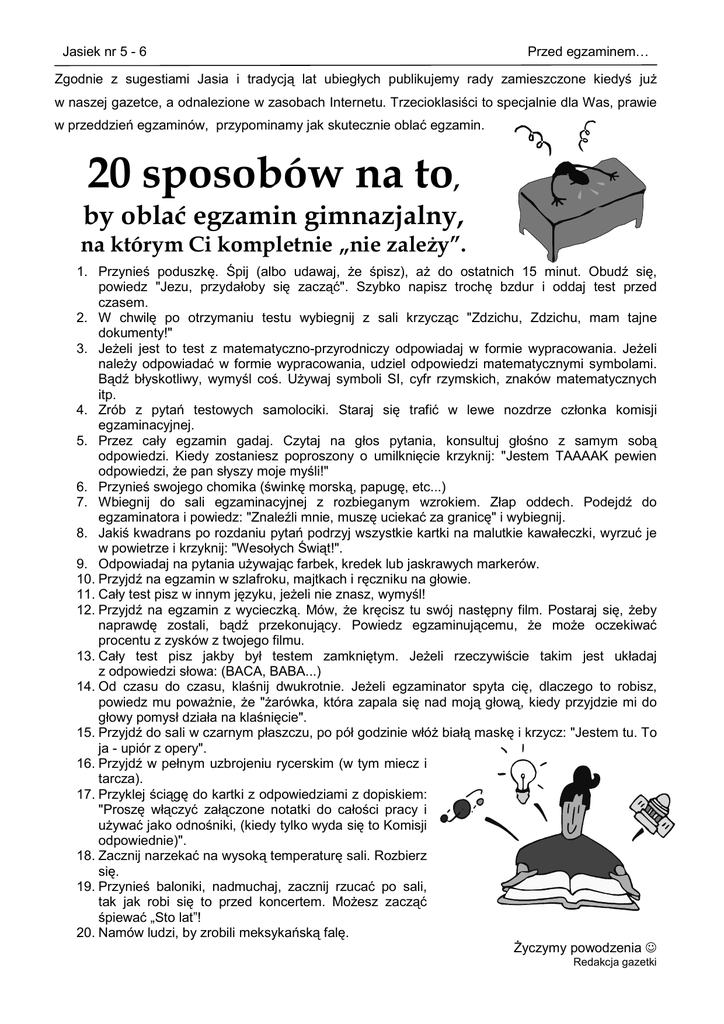 Jasiek nr 5 - 6 Zgodnie z sugestiami Jasia i tradycj Przed egzaminem… lat ubieg ych publikujemy rady zamieszczone kiedy ju! w naszej gazetce, a odnalezione w zasobach Internetu. Trzecioklasi ci to specjalnie dla Was, prawie w przeddzie( egzaminów, przypominamy jak skutecznie obla* egzamin. 20 sposobów na to, by obla egzamin gimnazjalny, na którym Ci kompletnie „nie zale y”. 1. Przynie poduszk,. -pij (albo udawaj, !e pisz), a! do ostatnich 15 minut. Obud1 si,, powiedz "Jezu, przyda oby si, zacz *". Szybko napisz troch, bzdur i oddaj test przed czasem. 2. W chwil, po otrzymaniu testu wybiegnij z sali krzycz c "Zdzichu, Zdzichu, mam tajne dokumenty!" 3. Je!eli jest to test z matematyczno-przyrodniczy odpowiadaj w formie wypracowania. Je!eli nale!y odpowiada* w formie wypracowania, udziel odpowiedzi matematycznymi symbolami. B d1 b yskotliwy, wymy l co . U!ywaj symboli SI, cyfr rzymskich, znaków matematycznych itp. 4. Zrób z pyta( testowych samolociki. Staraj si, trafi* w lewe nozdrze cz onka komisji egzaminacyjnej. 5. Przez ca y egzamin gadaj. Czytaj na g os pytania, konsultuj g o no z samym sob odpowiedzi. Kiedy zostaniesz poproszony o umilkni,cie krzyknij: "Jestem TAAAAK pewien odpowiedzi, !e pan s yszy moje my li!" 6. Przynie swojego chomika ( wink, morsk , papug,, etc...) 7. Wbiegnij do sali egzaminacyjnej z rozbieganym wzrokiem. Z ap oddech. Podejd1 do egzaminatora i powiedz: "Znale1li mnie, musz, ucieka* za granic," i wybiegnij. 8. Jaki kwadrans po rozdaniu pyta( podrzyj wszystkie kartki na malutkie kawa eczki, wyrzu* je w powietrze i krzyknij: "Weso ych -wi t!". 9. Odpowiadaj na pytania u!ywaj c farbek, kredek lub jaskrawych markerów. 10. Przyjd1 na egzamin w szlafroku, majtkach i r,czniku na g owie. 11. Ca y test pisz w innym j,zyku, je!eli nie znasz, wymy l! 12. Przyjd1 na egzamin z wycieczk . Mów, !e kr,cisz tu swój nast,pny film. Postaraj si,, !eby naprawd, zostali, b d1 przekonuj cy. Powiedz egzaminuj cemu, !e mo!e oczekiwa* procentu z zysków z twojego filmu. 13. Ca y test pisz jakby by testem zamkni,tym. Je!eli rzeczywi cie takim jest uk adaj z odpowiedzi s owa: (BACA, BABA...) 14. Od czasu do czasu, kla nij dwukrotnie. Je!eli egzaminator spyta ci,, dlaczego to robisz, powiedz mu powa!nie, !e "!arówka, która zapala si, nad moj g ow , kiedy przyjdzie mi do g owy pomys dzia a na kla ni,cie". 15. Przyjd1 do sali w czarnym p aszczu, po pó godzinie w ó! bia mask, i krzycz: "Jestem tu. To ja - upiór z opery". 16. Przyjd1 w pe nym uzbrojeniu rycerskim (w tym miecz i tarcza). 17. Przyklej ci g, do kartki z odpowiedziami z dopiskiem: "Prosz, w czy* za czone notatki do ca o ci pracy i u!ywa* jako odno niki, (kiedy tylko wyda si, to Komisji odpowiednie)". 18. Zacznij narzeka* na wysok temperatur, sali. Rozbierz si,. 19. Przynie baloniki, nadmuchaj, zacznij rzuca* po sali, tak jak robi si, to przed koncertem. Mo!esz zacz * piewa* „Sto lat”! 20. Namów ludzi, by zrobili meksyka(sk fal,. Hyczymy powodzenia Redakcja gazetki