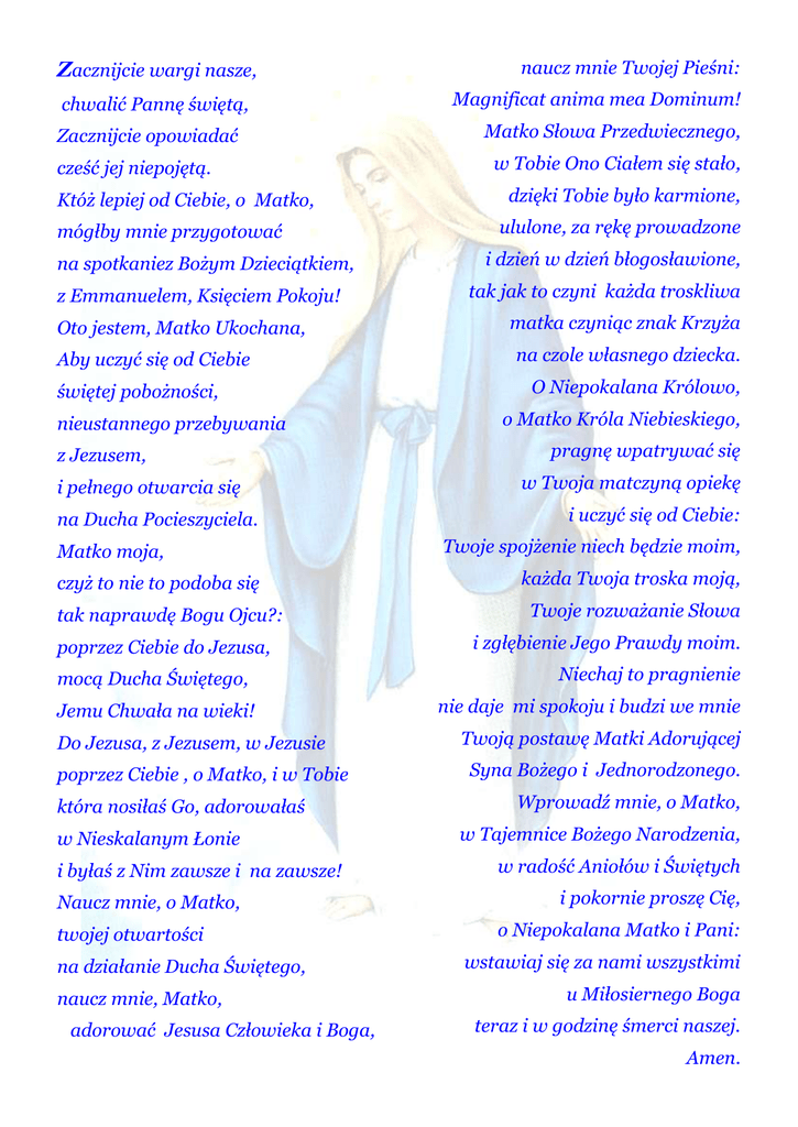 Zacznijcie wargi nasze, chwalić Pannę świętą, Zacznijcie opowiadać cześć jej niepojętą. Któż lepiej od Ciebie, o Matko, mógłby mnie przygotować na spotkaniez Bożym Dzieciątkiem, z Emmanuelem, Księciem Pokoju! Oto jestem, Matko Ukochana, Aby uczyć się od Ciebie świętej pobożności, nieustannego przebywania z Jezusem, i pełnego otwarcia się na Ducha Pocieszyciela. Matko moja, czyż to nie to podoba się tak naprawdę Bogu Ojcu?: poprzez Ciebie do Jezusa, mocą Ducha Świętego, Jemu Chwała na wieki! Do Jezusa, z Jezusem, w Jezusie poprzez Ciebie , o Matko, i w Tobie która nosiłaś Go, adorowałaś w Nieskalanym Łonie i byłaś z Nim zawsze i na zawsze! Naucz mnie, o Matko, twojej otwartości na działanie Ducha Świętego, naucz mnie, Matko, adorować Jesusa Człowieka i Boga, naucz mnie Twojej Pieśni: Magnificat anima mea Dominum! Matko Słowa Przedwiecznego, w Tobie Ono Ciałem się stało, dzięki Tobie było karmione, ululone, za rękę prowadzone i dzień w dzień błogosławione, tak jak to czyni każda troskliwa matka czyniąc znak Krzyża na czole własnego dziecka. O Niepokalana Królowo, o Matko Króla Niebieskiego, pragnę wpatrywać się w Twoja matczyną opiekę i uczyć się od Ciebie: Twoje spojżenie niech będzie moim, każda Twoja troska moją, Twoje rozważanie Słowa i zgłębienie Jego Prawdy moim. Niechaj to pragnienie nie daje mi spokoju i budzi we mnie Twoją postawę Matki Adorującej Syna Bożego i Jednorodzonego. Wprowadź mnie, o Matko, w Tajemnice Bożego Narodzenia, w radość Aniołów i Świętych i pokornie proszę Cię, o Niepokalana Matko i Pani: wstawiaj się za nami wszystkimi u Miłosiernego Boga teraz i w godzinę śmerci naszej. Amen.