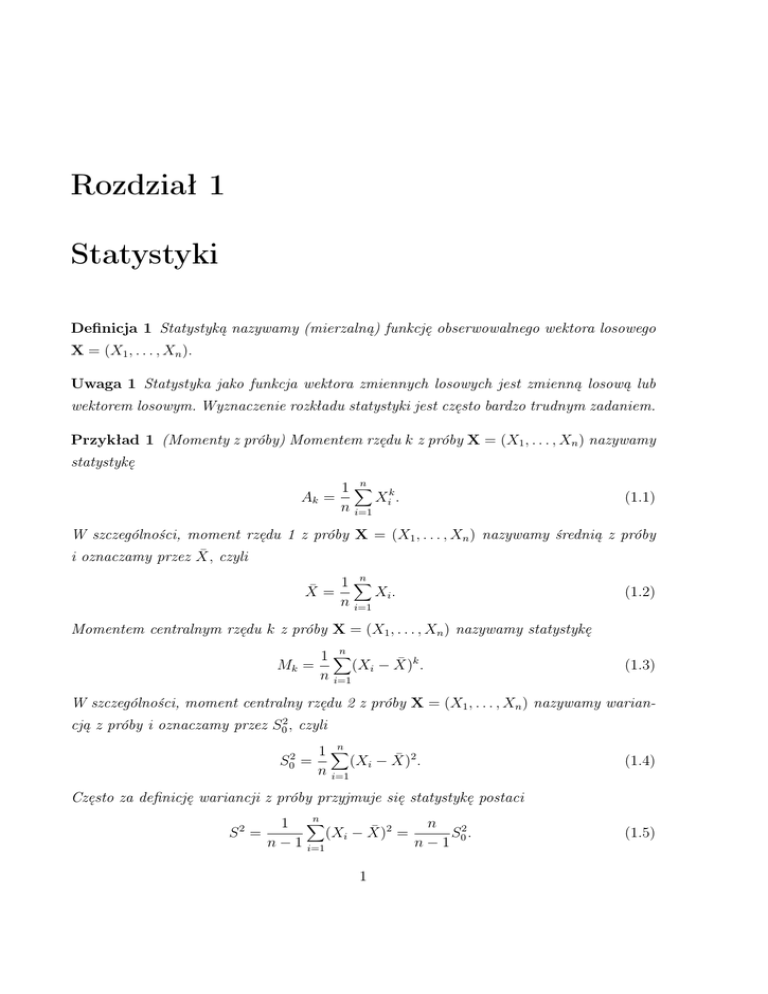 Przykład 1 (Momenty z próby) Momentem rzędu k z próby X = (X1 , . . . , Xn ) nazywamy