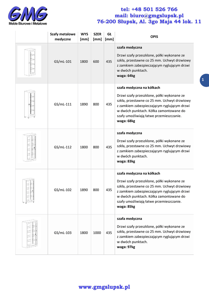Szafy metalowe medyczne WYS [mm] SZER GŁ [mm] [mm] OPIS szafa medyczna GS/mL-101 1800 600 435 Drzwi szafy przeszklone, półki wykonane ze szkła, przestawne co 25 mm. Uchwyt drzwiowy z zamkiem zabezpieczającym ryglującym drzwi w dwóch punktach. waga: 64kg szafa medyczna na kółkach GS/mL-111 1890 800 435 Drzwi szafy przeszklone, półki wykonane ze szkła, przestawne co 25 mm. Uchwyt drzwiowy z zamkiem zabezpieczającym ryglującym drzwi w dwóch punktach. Kółka zamontowane do szafy umożliwiają łatwe przemieszczanie. waga: 68kg szafa medyczna GS/mL-112 1800 800 435 Drzwi szafy przeszklone, półki wykonane ze szkła, przestawne co 25 mm. Uchwyt drzwiowy z zamkiem zabezpieczającym ryglującym drzwi w dwóch punktach. waga: 83kg szafa medyczna na kółkach GS/mL-102 1890 800 435 Drzwi szafy przeszklone, półki wykonane ze szkła, przestawne co 25 mm. Uchwyt drzwiowy z zamkiem zabezpieczającym ryglującym drzwi w dwóch punktach. Kółka zamontowane do szafy umożliwiają łatwe przemieszczanie. waga: 85kg szafa medyczna GS/mL-103 1800 1000 435 Drzwi szafy przeszklone, półki wykonane ze szkła, przestawne co 25 mm. Uchwyt drzwiowy z zamkiem zabezpieczającym ryglującym drzwi w dwóch punktach. waga: 97kg 1 Szafy metalowe medyczne WYS [mm] SZER GŁ [mm] [mm] OPIS szafa medyczna na kółkach GS/mL-113 1890 1000 435 Drzwi szafy przeszklone, półki wykonane ze szkła, przestawne co 25 mm. Uchwyt drzwiowy z zamkiem zabezpieczającym ryglującym drzwi w dwóch punktach. Kółka zamontowane do szafy umożliwiają łatwe przemieszczanie. waga: 103kg szafa medyczna GS/mL-114 1800 800 435 Drzwi szafy przeszklone, półki wykonane ze szkła, przestawne co 25 mm. Dolna półka zabudowana - drzwi wykonane z blachy. Uchwyt drzwiowy z zamkiem zabezpieczającym ryglującym drzwi w dwóch punktach. waga: 75kg szafa medyczna na kółkach GS/mL-104 1890 800 435 Drzwi szafy przeszklone, półki wykonane ze szkła, przestawne co 25 mm. Dolna półka zabudowana - drzwi wykonane z blachy. Uchwyt drzwiowy z zamkiem zabezpieczającym ryglującym drzwi w dwóch punktach. Kółka zamontowane do szafy umożliwiają łatwe przemieszczanie. waga: 82kg szafa medyczna GS/mL-115 1800 800 435 Drzwi szafy oraz ściany przeszklone, półki wykonane ze szkła, przestawne co 25 mm. Uchwyt drzwiowy z zamkiem zabezpieczającym ryglującym drzwi w dwóch punktach. waga: 100kg szafa medyczna na kółkach GS/mL-105 1890 800 435 Drzwi szafy oraz ściany przeszklone, półki wykonane ze szkła, przestawne co 25 mm. Uchwyt drzwiowy z zamkiem zabezpieczającym ryglującym drzwi w dwóch punktach. Kółka zamontowane do szafy umożliwiają łatwe przemieszczanie. waga: 104kg 2 Szafy metalowe medyczne WYS [mm] SZER GŁ [mm] [mm] OPIS Podstawa GS/mLpodstawa 150 600 800 1000 434 nogi do szaf medycznych wykonana z kształtownika zamkniętego czworokątnego. Podnosi szafy o 150 mm. Nogi wyposażone w stopki z tworzywa, nie niszczące podłogi. Szafka wisząca GSzL-101 500 400 250 z jednymi drzwiami z uchwytem i zatrzaskiem magnetycznym, wewnątrz dwie półki wykonane ze szkła. waga: 12kg Szafka wisząca GSzL-102 500 GSzL-103 800 1000 250 z drzwiami przesuwnymi. Drzwi i półki wykonane ze szkła. waga: 18kg ; 20kg Szafka przyłóżkowa GSzP-1 800 420 420 wyposażona w: - szufladę na prowadnicach rolkowych - blat - szafkę z uchwytem waga: 20kg Szafka przyłóżkowa GSzL-201 800 610 420 wyposażona w szufladę, w drzwiach szafki uchwyt i zatrzask magnetyczny. Szafka symetryczna – szuflada i szafka otwierają się z obu stron. Blaty z powłoką melaminową białą. Kółka umożliwiają łatwe przemieszczanie szafki, a blokada dwóch z nich zabezpiecza przed niepożądanym przemieszczaniem się szafki. Blat z regulowaną wysokością położenia oraz możliwością swobodnego obrotu, wysunięcia i położenia. waga: 30kg 3 Szafy metalowe medyczne WYS [mm] SZER GŁ [mm] [mm] OPIS Szafka przyłóżkowa GSzL-201o 945 595 415 z odchylanym blatem, szuflada na prowadnicach ślizgowych, w drzwiach szafki uchwyt i zatrzask magnetyczny. Blaty z powłoką melaminową. Blat z regulowaną wysokością położenia oraz możliwością swobodnego obrotu, wysunięcia i położenia za pomocą pneumatycznego mechanizmu. Możliwość regulowania kąta nachylenia blatu w zależności od potrzeb. waga: 33kg Stoliki GStL-101 GStL103 880 1000 1400 600 wykonane z blachy i profili metalowych. Kółka przy nogach stolików umożliwiają przemieszczanie stolika i ustawianie go w dowolnym miejscu. Wszystkie kółka skrętne, dwa z nich – z blokadą, zabezpieczającą przed przemieszczaniem się stolika. waga: 21kg 26kg Stoliki GStL-102 GStL104 880 1000 1400 600 wykonane z blachy i profili metalowych. Kółka przy nogach stolików umożliwiają przemieszczanie stolika i ustawianie go w dowolnym miejscu. Wszystkie kółka skrętne, dwa z nich – z blokadą, zabezpieczającą przed przemieszczaniem się stolika. waga: 15kg 18kg Stolik GStL-201 920 1380 400 600 wykonany z blachy i profili metalowych. Kółka przy nogach stolika umożliwiają przemieszczanie stolika i ustawianie go w dowolnym miejscu. Wszystkie kółka skrętne, dwa z nich – z blokadą, zabezpieczającą przed przemieszczaniem się stolika. Wysokość stolika regulowana – min. 920 mm, max 1370 mm. waga: 9kg 4 Szafy metalowe medyczne WYS [mm] SZER GŁ [mm] [mm] OPIS Przesuwana szafka – asystor GSzL-303 810 500 540 wyposażona w skrętne kółka antystatyczne. Blat wykonany z konglomeratu kwarcowogranitowego lub blat wykonany z Durconu waga: 50kg 5