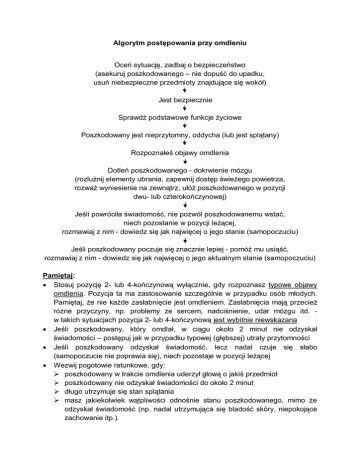 Algorytm postępowania przy omdleniu Oceń sytuację, zadbaj o bezpieczeństwo (asekuruj poszkodowanego – nie dopuść do upadku, usuń niebezpieczne przedmioty znajdujące się wokół) Jest bezpiecznie Sprawdź podstawowe funkcje życiowe Poszkodowany jest nieprzytomny, oddycha (lub jest splątany) Rozpoznałeś objawy omdlenia Dotleń poszkodowanego - dokrwienie mózgu (rozluźnij elementy ubrania, zapewnij dostęp świeżego powietrza, rozważ wyniesienie na zewnątrz, ułóż poszkodowanego w pozycji dwu- lub czterokończynowej) Jeśli powróciła świadomość, nie pozwól poszkodowanemu wstać, niech pozostanie w pozycji leżącej, rozmawiaj z nim - dowiedz się jak najwięcej o jego stanie (samopoczuciu) Jeśli poszkodowany poczuje się znacznie lepiej - pomóż mu usiąść, rozmawiaj z nim - dowiedz się jak najwięcej o jego aktualnym stanie (samopoczuciu) Pamiętaj: Stosuj pozycję 2- lub 4-kończynową wyłącznie, gdy rozpoznasz typowe objawy omdlenia. Pozycja ta ma zastosowanie szczególnie w przypadku osób młodych. Pamiętaj, że nie każde zasłabnięcie jest omdleniem. Zasłabnięcia mają przecież różne przyczyny, np. problemy ze sercem, nadciśnienie, udar mózgu itd. w takich sytuacjach pozycja 2- lub 4-kończynową jest wybitnie niewskazana Jeśli poszkodowany, który omdlał, w ciągu około 2 minut nie odzyskał świadomości – postępuj jak w przypadku typowej (głębszej) utraty przytomności Jeśli poszkodowany odzyskał świadomość, lecz nadal czuje się słabo (samopoczucie nie poprawia się), niech pozostaje w pozycji leżącej Wezwij pogotowie ratunkowe, gdy: poszkodowany w trakcie omdlenia uderzył głową o jakiś przedmiot poszkodowany nie odzyskał świadomości do około 2 minut długo utrzymuje się stan splątania masz jakiekolwiek wątpliwości odnośnie stanu poszkodowanego, mimo że odzyskał świadomość (np. nadal utrzymująca się bladość skóry, niepokojące zachowanie itp.).