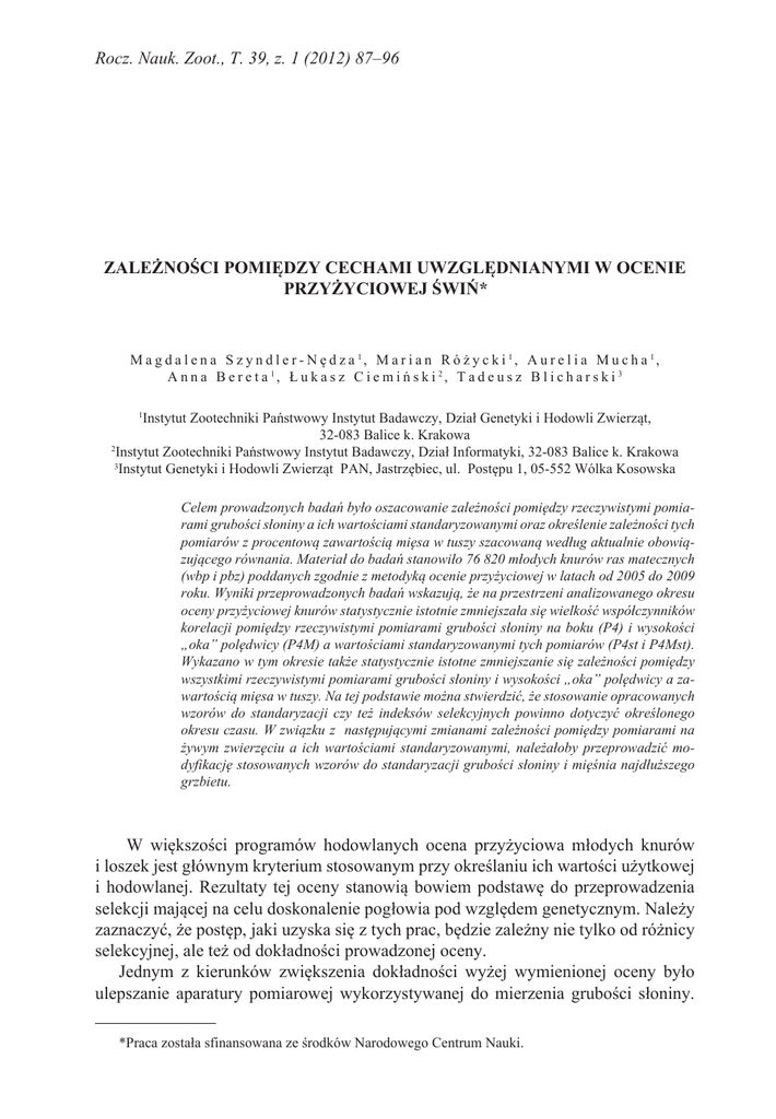 Rocz. Nauk. Zoot., T. 39, z. 1 (2012) 87–96 ZALEŻNOŚCI POMIĘDZY CECHAMI UWZGLĘDNIANYMI W OCENIE PRZYŻYCIOWEJ ŚWIŃ* M a g d a l e n a S z y n d l e r - N ę d z a 1, M a r i a n R ó ż y c k i 1, A u r e l i a M u c h a 1, A n n a B e r e t a 1, Ł u k a s z C i e m i ń s k i 2, T a d e u s z B l i c h a r s k i 3 Instytut Zootechniki Państwowy Instytut Badawczy, Dział Genetyki i Hodowli Zwierząt, 32-083 Balice k. Krakowa 2 Instytut Zootechniki Państwowy Instytut Badawczy, Dział Informatyki, 32-083 Balice k. Krakowa 3 Instytut Genetyki i Hodowli Zwierząt PAN, Jastrzębiec, ul. Postępu 1, 05-552 Wólka Kosowska 1 Celem prowadzonych badań było oszacowanie zależności pomiędzy rzeczywistymi pomiarami grubości słoniny a ich wartościami standaryzowanymi oraz określenie zależności tych pomiarów z procentową zawartością mięsa w tuszy szacowaną według aktualnie obowiązującego równania. Materiał do badań stanowiło 76 820 młodych knurów ras matecznych (wbp i pbz) poddanych zgodnie z metodyką ocenie przyżyciowej w latach od 2005 do 2009 roku. Wyniki przeprowadzonych badań wskazują, że na przestrzeni analizowanego okresu oceny przyżyciowej knurów statystycznie istotnie zmniejszała się wielkość współczynników korelacji pomiędzy rzeczywistymi pomiarami grubości słoniny na boku (P4) i wysokości „oka” polędwicy (P4M) a wartościami standaryzowanymi tych pomiarów (P4st i P4Mst). Wykazano w tym okresie także statystycznie istotne zmniejszanie się zależności pomiędzy wszystkimi rzeczywistymi pomiarami grubości słoniny i wysokości „oka” polędwicy a zawartością mięsa w tuszy. Na tej podstawie można stwierdzić, że stosowanie opracowanych wzorów do standaryzacji czy też indeksów selekcyjnych powinno dotyczyć określonego okresu czasu. W związku z następującymi zmianami zależności pomiędzy pomiarami na żywym zwierzęciu a ich wartościami standaryzowanymi, należałoby przeprowadzić modyfikację stosowanych wzorów do standaryzacji grubości słoniny i mięśnia najdłuższego grzbietu. W większości programów hodowlanych ocena przyżyciowa młodych knurów i loszek jest głównym kryterium stosowanym przy określaniu ich wartości użytkowej i hodowlanej. Rezultaty tej oceny stanowią bowiem podstawę do przeprowadzenia selekcji mającej na celu doskonalenie pogłowia pod względem genetycznym. Należy zaznaczyć, że postęp, jaki uzyska się z tych prac, będzie zależny nie tylko od różnicy selekcyjnej, ale też od dokładności prowadzonej oceny. Jednym z kierunków zwiększenia dokładności wyżej wymienionej oceny było ulepszanie aparatury pomiarowej wykorzystywanej do mierzenia grubości słoniny. Praca została sfinansowana ze środków Narodowego Centrum Nauki. 88 M. Szyndler-Nędza i in. Początkowo stosowano suwmiarki igłowe, które szybko zamieniono na bezinwazyjne aparaty ultradźwiękowe. Pierwszym urządzeniem ultradźwiękowym stosowanym na szeroką skalę był aparat firmy Krautkramer, typ USM–2F. Kolejnym był aparat typu Piglog 105 SFK- Technology, który stosowany jest do chwili obecnej. Jednocześnie należy zaznaczyć, że aby jeszcze dokładniej mierzyć otłuszczenie i umięśnienie tusz świń testuje się inne urządzenia wykorzystujące nowe technologie, w tym aparaty ultrasonograficzne (Cisneros i in., 1996; Moeller i in., 1998; Vilchez i Chavez, 1998; Tyra i in., 2011). Drugim kierunkiem doskonalenia oceny przyżyciowej było poszukiwanie odpowiednich cech, które powinny charakteryzować się wysokimi współczynnikami odziedziczalności i powinny być skorelowane z umięśnieniem zwierząt (Schinckel i in., 2001; Klimas i in., 2004; Szyndler-Nędza i in., 2010 b). Z uwagi na to, że pomiarom poddawane są zwierzęta w różnej masie ciała i wieku powinno się dokonywać standaryzacji cech uwzględnianych w ocenie, co umożliwi porównywanie tych zwierząt. W Polsce wprowadzono ocenę przyżyciową do praktyki w 1973 roku. Od tego czasu dokonano w niej szeregu zmian metodycznych. Zasadniczą zmianę metodyczną wprowadzono w 1995 roku, polegała ona na modyfikacji indeksu selekcyjnego knurów oraz równania do szacowania mięsności, w którym oprócz pomiarów grubości słoniny uwzględniono także wysokość mięśnia najdłuższego grzbietu. W 2004 roku wprowadzono kolejną modyfikację metody mającą na celu zwiększenie jej dokładności poprzez dostosowanie do aktualnego stanu populacji świń. Polegała ona na wprowadzeniu nowych wzorów i równań do standaryzacji przyrostu dziennego oraz szacowania procentowej zawartości mięsa w tuszy świń. Wprowadzono także standaryzację pomiarów grubości słoniny i wysokości mięśnia polędwicy na stałą masę ciała – 110 kg oraz standaryzację równania szacującego procentową zawartość mięsa w tuszy na stały wiek – 180. dzień życia zwierząt (Szyndler-Nędza i in., 2010 a). Celem prowadzonych badań było oszacowanie współczynników korelacji pomiędzy pomiarami rzeczywistymi grubości słoniny a ich wartościami standaryzowanymi oraz określenie zależności tych pomiarów z procentową zawartością mięsa w tuszy szacowaną według aktualnie obowiązującego równania. Materiał i metody Materiał do badań stanowiło 76 820 młodych knurów ras matecznych (wbp i pbz) poddanych zgodnie z metodyką ocenie przyżyciowej (Eckert i Szyndler-Nędza, 2011) w okresie od 2005 do 2009 roku. W tabeli 1 przedstawiono liczbę knurów w poszczególnych latach. W badaniach uwzględniono następujące cechy: 1 – grubość słoniny za ostatnim żebrem, 3 cm od linii środkowej grzbietu (P2), określana na żywym zwierzęciu ; 2 – grubość słoniny za ostatnim żebrem, 8 cm od linii środkowej grzbietu (P4), określana na żywym zwierzęciu; Zależności pomiędzy cechami oceny przyżyciowej świń 89 3 – wysokość mięśnia polędwicy za ostatnim żebrem, 8 cm od linii środkowej grzbietu (P4M), określana n