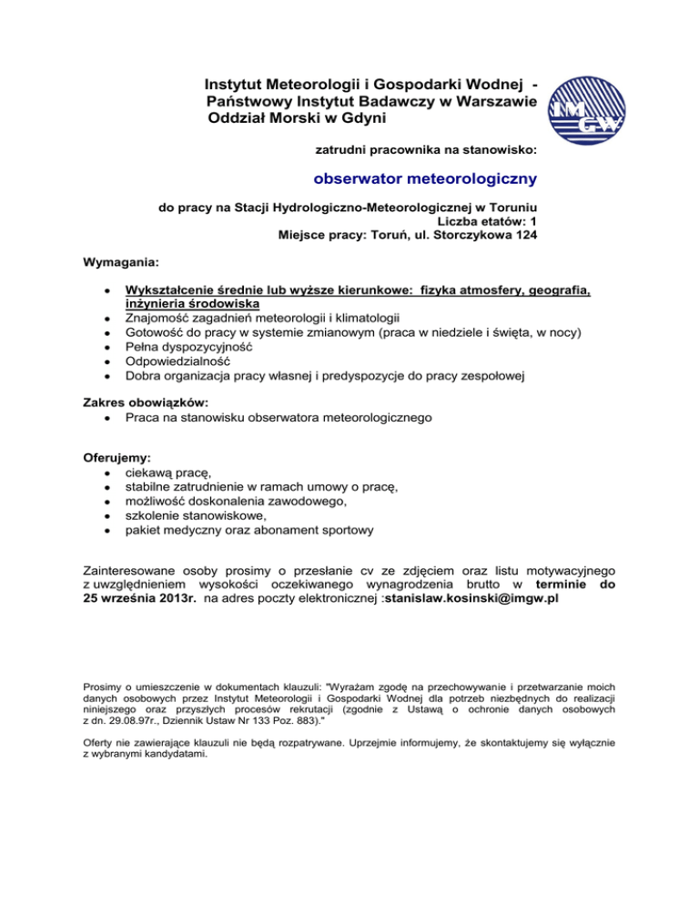 Instytut Meteorologii i Gospodarki Wodnej Państwowy Instytut Badawczy w Warszawie Oddział Morski w Gdyni zatrudni pracownika na stanowisko: obserwator meteorologiczny do pracy na Stacji Hydrologiczno-Meteorologicznej w Toruniu Liczba etatów: 1 Miejsce pracy: Toruń, ul. Storczykowa 124 Wymagania: Wykształcenie średnie lub wyższe kierunkowe: fizyka atmosfery, geografia, inżynieria środowiska Znajomość zagadnień meteorologii i klimatologii Gotowość do pracy w systemie zmianowym (praca w niedziele i święta, w nocy) Pełna dyspozycyjność Odpowiedzialność Dobra organizacja pracy własnej i predyspozycje do pracy zespołowej Zakres obowiązków: Praca na stanowisku obserwatora meteorologicznego Oferujemy: ciekawą pracę, stabilne zatrudnienie w ramach umowy o pracę, możliwość doskonalenia zawodowego, szkolenie stanowiskowe, pakiet medyczny oraz abonament sportowy Zainteresowane osoby prosimy o przesłanie cv ze zdjęciem oraz listu motywacyjnego z uwzględnieniem wysokości oczekiwanego wynagrodzenia brutto w terminie do 25 września 2013r. na adres poczty elektronicznej :[email protected] Prosimy o umieszczenie w dokumentach klauzuli: "Wyrażam zgodę na przechowywanie i przetwarzanie moich danych osobowych przez Instytut Meteorologii i Gospodarki Wodnej dla potrzeb niezbędnych do realizacji niniejszego oraz przyszłych procesów rekrutacji (zgodnie z Ustawą o ochronie danych osobowych z dn. 29.08.97r., Dziennik Ustaw Nr 133 Poz. 883)." Oferty nie zawierające klauzuli nie będą rozpatrywane. Uprzejmie informujemy, że skontaktujemy się wyłącznie z wybranymi kandydatami.