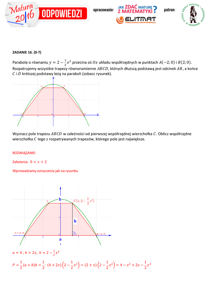 ZADANIE 16. (0-7) Parabola o równaniu przecina oś układu współrzędnych w punktach i Rozpatrujemy wszystkie trapezy równoramienne , których dłuższą podstawą jest odcinek i krótszej podstawy leżą na paraboli (zobacz rysunek). . , a końce Wyznacz pole trapezu w zależności od pierwszej współrzędnej wierzchołka . Oblicz współrzędne wierzchołka tego z rozpatrywanych trapezów, którego pole jest największe. ROZWIĄZANIE: Założenia: Wprowadzamy oznaczenia jak na rysunku , , Największe pole trapez przyjmuje dla Obliczamy drugą współrzędną punktu więc