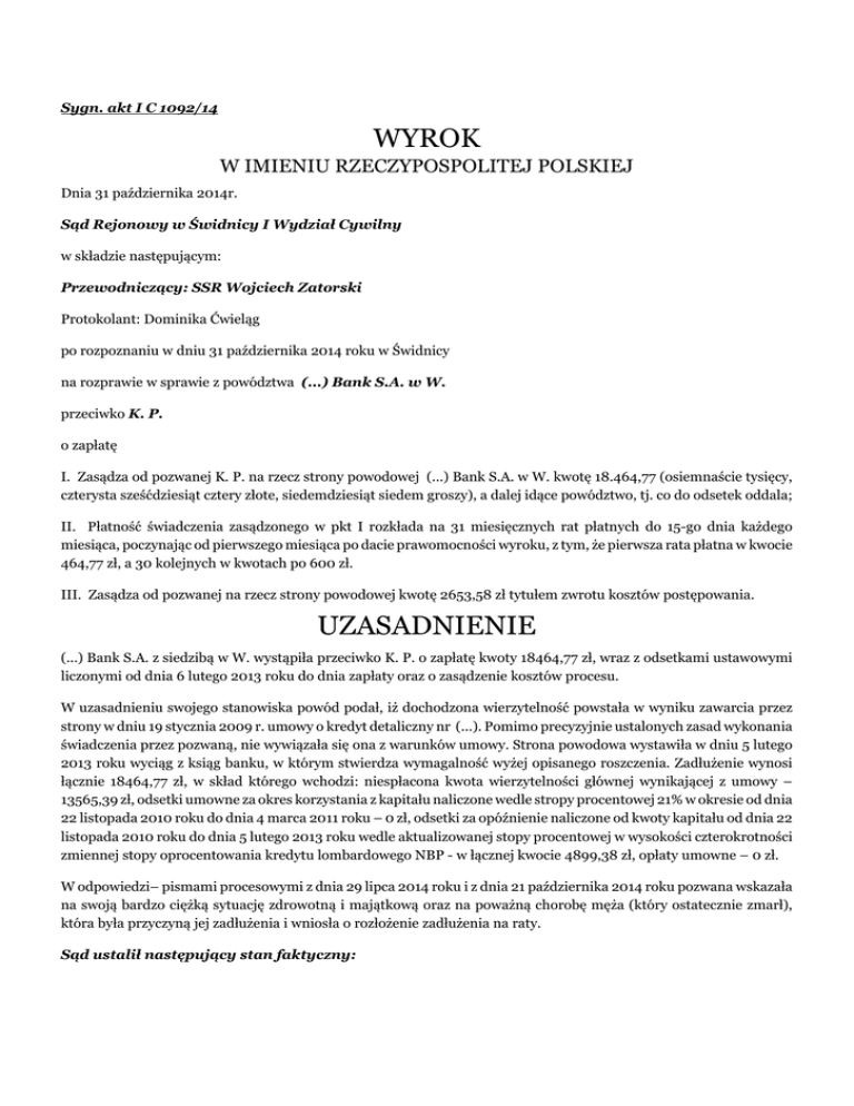 Sygn. akt I C 1092/14 WYROK W IMIENIU RZECZYPOSPOLITEJ POLSKIEJ Dnia 31 października 2014r. Sąd Rejonowy w Świdnicy I Wydział Cywilny w składzie następującym: Przewodniczący: SSR Wojciech Zatorski Protokolant: Dominika Ćwieląg po rozpoznaniu w dniu 31 października 2014 roku w Świdnicy na rozprawie w sprawie z powództwa (...) Bank S.A. w W. przeciwko K. P. o zapłatę I. Zasądza od pozwanej K. P. na rzecz strony powodowej (...) Bank S.A. w W. kwotę 18.464,77 (osiemnaście tysięcy, czterysta sześćdziesiąt cztery złote, siedemdziesiąt siedem groszy), a dalej idące powództwo, tj. co do odsetek oddala; II. Płatność świadczenia zasądzonego w pkt I rozkłada na 31 miesięcznych rat płatnych do 15-go dnia każdego miesiąca, poczynając od pierwszego miesiąca po dacie prawomocności wyroku, z tym, że pierwsza rata płatna w kwocie 464,77 zł, a 30 kolejnych w kwotach po 600 zł. III. Zasądza od pozwanej na rzecz strony powodowej kwotę 2653,58 zł tytułem zwrotu kosztów postępowania. UZASADNIENIE (...) Bank S.A. z siedzibą w W. wystąpiła przeciwko K. P. o zapłatę kwoty 18464,77 zł, wraz z odsetkami ustawowymi liczonymi od dnia 6 lutego 2013 roku do dnia zapłaty oraz o zasądzenie kosztów procesu. W uzasadnieniu swojego stanowiska powód podał, iż dochodzona wierzytelność powstała w wyniku zawarcia przez strony w dniu 19 stycznia 2009 r. umowy o kredyt detaliczny nr (...). Pomimo precyzyjnie ustalonych zasad wykonania świadczenia przez pozwaną, nie wywiązała się ona z warunków umowy. Strona powodowa wystawiła w dniu 5 lutego 2013 roku wyciąg z ksiąg banku, w którym stwierdza wymagalność wyżej opisanego roszczenia. Zadłużenie wynosi łącznie 18464,77 zł, w skład którego wchodzi: niespłacona kwota wierzytelności głównej wynikającej z umowy – 13565,39 zł, odsetki umowne za okres korzystania z kapitału naliczone wedle stropy procentowej 21% w okresie od dnia 22 listopada 2010 roku do dnia 4 marca 2011 roku – 0 zł, odsetki za opóźnienie naliczone od kwoty kapitału od dnia 22 listopada 2010 roku do dnia 5 lutego 2013 roku wedle aktualizowanej stopy procentowej w wysokości czterokrotności zmiennej stopy oprocentowania kredytu lombardowego NBP - w łącznej kwocie 4899,38 zł, opłaty umowne – 0 zł. W odpowiedzi– pismami procesowymi z dnia 29 lipca 2014 roku i z dnia 21 października 2014 roku pozwana wskazała na swoją bardzo ciężką sytuację zdrowotną i majątkową oraz na poważną chorobę męża (który ostatecznie zmarł), która była przyczyną jej zadłużenia i wniosła o rozłożenie zadłużenia na raty. Sąd ustalił następujący stan faktyczny: W dniu 19 stycznia 2009 roku strona powodowa zawarła z pozwaną umowę konsolidacyjnego kredytu gotówkowego nr (...) na kwotę 16658,52 zł , z obowiązkiem ratalnej spłaty kredytu wraz z odsetkami w ratach miesięcznych po 408,73 zł. Kredy został przeznaczony na spłatę 2 innych zobowiązań kredytowych , tj. w kwotach 10235,84 zł i 1843,97 zł, natomiast kwota 2920,19 zł przelana została na rachunek bankowy pozwanej. Dowody: - umowa konsolidacyjnego kredytu gotówkowego – k. 29-34, - dyspozycja uruchomienia konsolidacyjnego kredytu gotówkowego – k. 35, - wniosek o udzielnie konsolidacyjnego kredytu gotówkowego – k. 36, - karta informacyjna kredytobiorcy – k. 37, - oświadczenie o osiągalnych dochodach – k. 40. Ponieważ pozwana nie wywiązywała się z warunków umowy strona powodowa pismem z dnia 18 stycznia 2011 roku wypowiedziała pozwanej umowę kredytu, ze wskazaniem, że całość zadłużenia z tego tytułu staje się wymagalna. Dowód: - wypowiedzenie – k. 38-39. Pismem datowanym na dzień 20 grudnia 2012 roku strona powodowa wezwała pozwaną do dobrowolnej spłaty zobowiązania w terminie 3 dni od dnia otrzymania wezwania, jednakże bezskutecznie. Dowód: - ostateczne przedsądowe wezwanie do zapłaty – k. 28. W dniu 5 lutego 2013 roku strona powodowa wystawiła wyciąg z ksiąg banku o nr (...), w którym stwierdza wymagalność roszczenia na łączną kwotę 18464,77 zł, w tym z tytułu odsetek za opóźnienie, naliczonych od kapitału za okres od22.11.2010 do 05.02.2013. Dowód: - wyciąg z ksiąg z dnia 5 lutego 2013 roku – k. 27. Mąż pozwanej R. P. chorował na raka płaskonabłonkowego rogowaciejącego G-2 dna jamy ustnej. Zmarł w dniu 10 sierpnia 2012 roku. Pozwana ma orzeczony umiarkowany stopień niepełnosprawności; cierpi na dolegliwości oddechowe (płuca), choruje na serce i nerki, obecnie oczekuje na operację serca, utrzymuje się z renty rodzinnej w wysokości 1546 zł miesięcznie. Dowody: - karta informacyjna leczenia szpitalnego pozwanej – k. 48-49, - karta informacyjna leczenia szpitalnego męża pozwanej – k. 50-51, - odpis skrócony aktu zgonu – k. 52, - orzeczenie o stopniu niepełnosprawności – k. 53, - skierowanie do szpitala – k. 54, - zaświadczenie lekarskie – k. 55. Sąd zważył, co następuje: Powództwo co do zasady zasługiwało na uwzględnienie. Zgodnie z art. 69 ust.1 prawa bankowego przez umowę kredytu bank zobowiązuje się oddać do dyspozycji kredytobiorcy na czas oznaczony w umowie kwotę środków pieniężnych z przeznaczeniem na ustalony cel, a kredytobiorca zobowiązuje się do korzystania z niej na warunkach określonych w umowie, zwrotu kwoty wykorzystanego kredytu wraz z odsetkami w oznaczonych terminach spłaty oraz zapłaty prowizji od udzielonego kredytu. Stosownie natomiast do art. 354§1 kc dłużnik powinien wykonać zobowiązanie zgodnie z jego treścią i w sposób odpowiadający jego celowi społeczno-gospodarczemu oraz zasadom współżycia społecznego, a jeżeli istnieją w tym zakresie ustalone zwyczaje - także w sposób odpowiadający tym zwyczajom. Bezsporne w niniejszej sprawie było, że strony zawarły umowę konsolidacyjnego kredytu gotówkowego, a strona powodowa spełniła swe świadczenie stawiając do dyspozycji pozwanej umówio