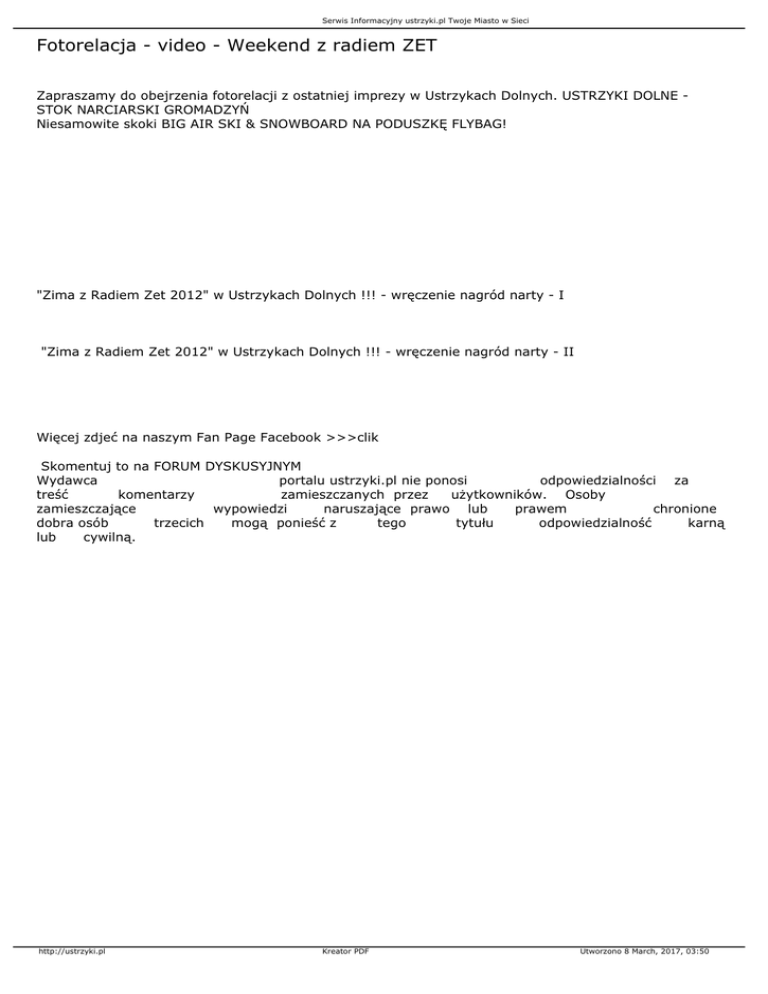 Serwis Informacyjny ustrzyki.pl Twoje Miasto w Sieci Fotorelacja - video - Weekend z radiem ZET Zapraszamy do obejrzenia fotorelacji z ostatniej imprezy w Ustrzykach Dolnych. USTRZYKI DOLNE STOK NARCIARSKI GROMADZYŃ Niesamowite skoki BIG AIR SKI & SNOWBOARD NA PODUSZKĘ FLYBAG! "Zima z Radiem Zet 2012" w Ustrzykach Dolnych !!! - wręczenie nagród narty - I "Zima z Radiem Zet 2012" w Ustrzykach Dolnych !!! - wręczenie nagród narty - II Więcej zdjeć na naszym Fan Page Facebook >>>clik Skomentuj to na FORUM DYSKUSYJNYM Wydawca portalu ustrzyki.pl nie ponosi odpowiedzialności za treść komentarzy zamieszczanych przez użytkowników. Osoby zamieszczające wypowiedzi naruszające prawo lub prawem chronione dobra osób trzecich mogą ponieść z tego tytułu odpowiedzialność karną lub cywilną. http://ustrzyki.pl Kreator PDF Utworzono 8 March, 2017, 03:50