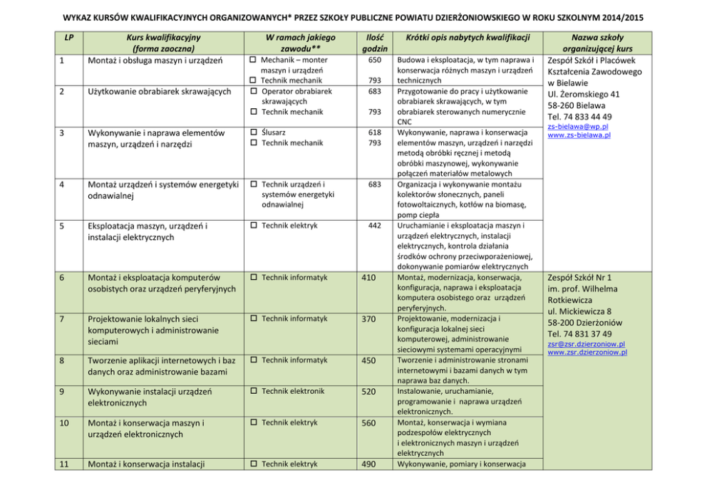 WYKAZ KURSÓW KWALIFIKACYJNYCH ORGANIZOWANYCH* PRZEZ SZKOŁY PUBLICZNE POWIATU DZIERŻONIOWSKIEGO W ROKU SZKOLNYM 2014/2015 LP 1 2 Kurs kwalifikacyjny (forma zaoczna) Montaż i obsługa maszyn i urządzeń Użytkowanie obrabiarek skrawających W ramach jakiego zawodu** Ilość godzin Krótki opis nabytych kwalifikacji Mechanik – monter maszyn i urządzeń Technik mechanik Operator obrabiarek skrawających Technik mechanik 650 Budowa i eksploatacja, w tym naprawa i konserwacja różnych maszyn i urządzeń technicznych Przygotowanie do pracy i użytkowanie obrabiarek skrawających, w tym obrabiarek sterowanych numerycznie CNC Wykonywanie, naprawa i konserwacja elementów maszyn, urządzeń i narzędzi metodą obróbki ręcznej i metodą obróbki maszynowej, wykonywanie połączeń materiałów metalowych Organizacja i wykonywanie montażu kolektorów słonecznych, paneli fotowoltaicznych, kotłów na biomasę, pomp ciepła Uruchamianie i eksploatacja maszyn i urządzeń elektrycznych, instalacji elektrycznych, kontrola działania środków ochrony przeciwporażeniowej, dokonywanie pomiarów elektrycznych Montaż, modernizacja, konserwacja, konfiguracja, naprawa i eksploatacja komputera osobistego oraz urządzeń peryferyjnych. Projektowanie, modernizacja i konfiguracja lokalnej sieci komputerowej, administrowanie sieciowymi systemami operacyjnymi Tworzenie i administrowanie stronami internetowymi i bazami danych w tym naprawa baz danych. Instalowanie, uruchamianie, programowanie i naprawa urządzeń elektronicznych. Montaż, konserwacja i wymiana podzespołów elektrycznych i elektronicznych maszyn i urządzeń elektrycznych Wykonywanie, pomiary i konserwacja 793 683 793 3 Wykonywanie i naprawa elementów maszyn, urządzeń i narzędzi Ślusarz Technik mechanik 618 793 4 Montaż urządzeń i systemów energetyki odnawialnej Technik urządzeń i systemów energetyki odnawialnej 683 5 Eksploatacja maszyn, urządzeń i instalacji elektrycznych Technik elektryk 442 6 Montaż i eksploatacja komputerów osobistych oraz urządzeń peryferyjnych Technik informatyk 410 7 Projektowanie lokalnych sieci komputerowych i administrowanie sieciami Technik informatyk 370 8 Tworzenie aplikacji internetowych i baz danych oraz administrowanie bazami Technik informatyk 450 9 Wykonywanie instalacji urządzeń elektronicznych Technik elektronik 520 10 Montaż i konserwacja maszyn i urządzeń elektronicznych Technik elektryk 560 11 Montaż i konserwacja instalacji Technik elektryk 490 Nazwa szkoły organizującej kurs Zespół Szkół i Placówek Kształcenia Zawodowego w Bielawie Ul. Żeromskiego 41 58-260 Bielawa Tel. 74 833 44 49 [email protected] www.zs-bielawa.pl Zespół Szkół Nr 1 im. prof. Wilhelma Rotkiewicza ul. Mickiewicza 8 58-200 Dzierżoniów Tel. 74 831 37 49 [email protected] www.zsr.dzierzoniow.pl 12 elektrycznych Montaż urządzeń i systemów mechatronicznych Technik mechatronik 640 13 Sporządzanie potraw i napojów Technik żywienia i usług gastronomicznych 754 14 Świadczenie usług opiekuńczowspierających osobie starszej Opiekun osoby starszej 1014 15 Zarządzanie bezpieczeństwem w środowisku pracy Technik bezpieczeństwa i higieny pracy 806 16 Świadczenie usług w zakresie dietetyki Dietetyk 1000 17 Wykonywanie zabiegów fryzjerskich Fryzjer Technik usług fryzjerskich 683 767 18 Prowadzenie sprzedaży Sprzedawca Technik handlowiec 585 19 Organizacja i monitorowanie przepływu zasobów i informacji w procesach produkcji, dystrybucji i magazynowania. Technik logistyk 377 20 Prowadzenie rachunkowości Technik rachunkowości technik ekonomista 438 instalacji elektryczny. Montaż elementów, podzespołów i zespołów mechanicznych, pneumatycznych, hydraulicznych i elektryczno-elektronicznych urządzeń i systemów mechatronicznych. Przyrządzanie i ekspedycja potraw oraz podejmowanie zadań związanych z organizacją i imprez gastronomicznych. Opieka i pomoc seniorowi podczas codziennych czynności, rehabilitacja oraz organizacja czasu wolnego . Ocenianie i kontrolowania stanu bezpieczeństwa w zakładzie pracy, oraz prowadzenie doradztwa w zakresie obowiązujących zasad i przepisów bhp. Prowadzenie i nadzorowanie żywienia indywidualnego i zbiorowego osób zdrowych i chorych oraz udzielania porad dietetycznych. Wykonywanie zabiegów fryzjerskich, takich jak: golenie i strzyżenie włosów i zarostu, mycie i pielęgnowanie włosów, czesanie, trwała ondulacja, rozjaśnianie i farbowanie włosów Organizowanie i sprzedaż towarów, w tym przyjmowanie dostaw, kalkulacja ceny, obsługa urządzeń technicznych, obsługa klientów, sporządzanie dokumentów, przyjmowanie i rozpatrywanie reklamacji, przeprowadzanie inwentaryzacji. Planowanie i organizowanie prac związanych z procesem logistycznym, w tym monitorowanie przepływu zasobów i informacji, zarządzanie zapasami, przygotowanie ładunku do przewozu, sporządzanie dokumentów, stosowanie systemów informatycznych w procesie dystrybucji. Dokumentowanie i ewidencjonowanie operacji gospodarczych, obsługa programów finansowo-księgowych, przeprowadzanie i rozliczanie Zespół Szkół Nr 2 im. prof. Tadeusza Kotarbińskiego ul. Piłsudskiego 24 58-200 Dzierżoniów Tel. 74 831 52 60 [email protected] www.zsz.dzierzoniow.pl Zespół Szkół Nr 3 im. Kombatantów Rzeczypospolitej Polskiej ul. Słowiańska 6 58-200 Dzierżoniów Tel. 74 831 26 18 [email protected] www.zs3.info 21 Rozliczanie wynagrodzeń i danin publicznych Technik rachunkowości 440 22 Planowanie i prowadzenie działalności w organizacji Technik ekonomista 388 23 Obsługa klienta w jednostkach administracji Technik administracji 774 24 Projektowanie, urządzanie i pielęgnacja roślinnych obiektów architektury krajobrazu Technik architektury krajobrazu 445 25 Wykonywanie działań ratowniczych Technik pożarnictwa 700 26 Zarządzanie działaniami ratowniczymi Technik pożarnictwa 800 27 Prowadzenie produkcji rolniczej Technik rolnik Rolnik 650 28 Organizacja i 