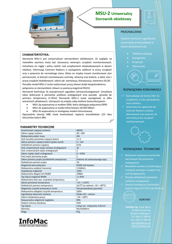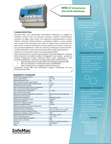 MSU-2 Uniwersalny Sterownik obiektowy PRZEZNACZENIE Systemy kontroli i sygnalizacji automatyki przemysłowej w takich dziedzinach jak: CHARAKTERYSTYKA: Sterownik MSU-2 jest uniwersalnym sterownikiem obiektowym. Ze względu na niewielkie wymiary może być stosowany wewnątrz urządzeń monitorowanych. Umożliwia on ciągły i pełny nadzór nad urządzeniami eksploatowanymi w danym obiekcie, informując Centrum Nadzoru o wystąpieniu zakłóceń w pracy urządzeń oraz o powrocie do normalnego stanu. Może on między innymi monitorować stan pomieszczeń, w których zainstalowano centralę, siłownię oraz baterie, a także stan i pracę urządzeń dodatkowych, takich jak: wentylacja, klimatyzacja, Inwertory DC/AC Ponadto moduł MSU-2 może nadzorować pracę siłowni dzięki bezpośredniemu połączeniu ze sterownikiem siłowni za pomocą magistrali RS232. Sterownik kontroluje 16 zewnętrznych sygnałów cyfrowo/analogowych. Umożliwia także dokonanie 6 pomiarów wielkości analogowych oraz posiada gniazdo do pomiaru temperatury (1-Wire) Sterownik MSU-2 może występować w kilku wariantach układowych, różniących się między sobą medium komunikacyjnym: MSU-2g wyposażony w modem GSM, który obsługuje połączenia GPRS MSU-2e wyposażony w moduł ethernetowy 10/100 Mbit/s MSU-2k wyposażony w analogowy modem komutowany Opcjonalnie (wersja MB) może kontrolować napiecia monobloków 12V dwu łańcuchów baterii 48V. Telekomunikacja Energetyka Przemysł Obronność ROZWIĄZANIA KOMUNIKACJI Komunikacja od strony CSM do urządzenia, w celu sprawdzenia stanu obiektu. Automatyczne zgłaszanie do Centrum Nadzoru stanów alarmowych oraz powrotu do normalnej pracy urządzeń monitorowanych. PARAMETRY TECHNICZNE Znamionowe napięcie zasilania Zakres napięć zasilania Maksymalny pobór mocy Ilość kanałów pomiarów napięcia baterii Zakres pomiaru napięcia baterii (jeden kanał) Dokładność pomiaru napięcia Ilość uniwersalnych wejść cyfrowo-analogowych Ilość uniwersalnych wejść analogowych Zakres napięć wejść analogowych Ilość wejść pomiarów prądu Zakres pomiaru prądu (przekładniki zewnętrzne) Dokładność pomiaru prądu Magistrala komunikacyjna Maksymalna szybkość transmisji Impedancja magistrali Maksymalna długość linii RS485 Typ złącza magistrali RS485 Maksymalna ilość zew. czujników temperatury Zakres pomiarów temperatury Dokładność pomiaru temperatury Magistrala czujnika temperatury 1wire Maksymalna odległość czujnika temperatury Sygnalizacja obecności zasilania Zakres temperatury pracy Dopuszczalna wilgotność względna Stopień ochrony obudowy Typ złącza Wymiary Waga 48VDC 38 ÷ 58V 3W 2x4 0 ÷ 16V 0,5% 16 3 0 ÷ 5VDC 2 Zależnie od zastosowanego typu 1% RS485 (full duplex) 2,5Mbit/s 120Ω 1000m 2 x RJ45 6 –55 ÷ +125ºC ±0,50C (w zakresie –10 ÷ +850C) Dwuprzewodowa (parasite) 100m Dioda LED – zielona –20 ÷ +600C 90% IP20 Listwa zac. rozłączalna 3,81mm 95x70x58mm 87g ROZWIĄZANIA TECHNICZNE Możliwość ustawiania poziomów alarmowych dla pomiarów analogowych. Niewielkie wymiary umożliwiające instalacje wewnątrz urządzeń (np. szaf dostępowych). Wysoka dokładność pomiarów wielkości analogowych. Łatwość konfiguracji sterownika poprzez złącze RS 232C lub Ethernet. KONTAKT InfoMac Sp. z o.o. Sp. k 78-400 Szczecinek Wojska Polskiego 6 Tel. 094 37 288 40 Fax. 094 37 288 48 [email protected] http://infomac.pl/