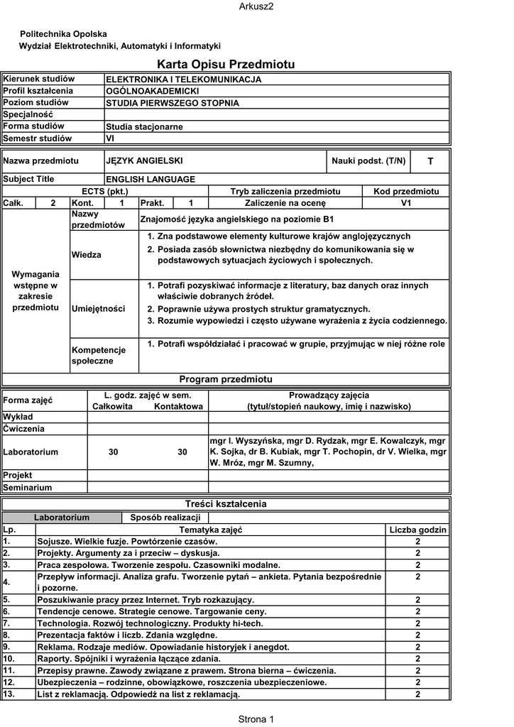 Arkusz2 Politechnika Opolska Wydział Elektrotechniki, Automatyki i Informatyki Karta Opisu Przedmiotu Kierunek studiów Profil kształcenia Poziom studiów Specjalność Forma studiów Semestr studiów ELEKTRONIKA I TELEKOMUNIKACJA OGÓLNOAKADEMICKI STUDIA PIERWSZEGO STOPNIA Nazwa przedmiotu JĘZYK ANGIELSKI Subject Title Całk. 2 Studia stacjonarne VI T ENGLISH LANGUAGE ECTS (pkt.) Tryb zaliczenia przedmiotu Kod przedmiotu Kont. 1 Prakt. 1 Zaliczenie na ocenę V1 Nazwy Znajomość języka angielskiego na poziomie B1 przedmiotów 1. Zna podstawowe elementy kulturowe krajów anglojęzycznych 2. Posiada zasób słownictwa niezbędny do komunikowania się w podstawowych sytuacjach życiowych i społecznych. Wiedza Wymagania wstępne w zakresie przedmiotu Nauki podst. (T/N) Umiejętności Kompetencje społeczne 1. Potrafi pozyskiwać informacje z literatury, baz danych oraz innych właściwie dobranych źródeł. 2. Poprawnie używa prostych struktur gramatycznych. 3. Rozumie wypowiedzi i często używane wyrażenia z życia codziennego. 1. Potrafi współdziałać i pracować w grupie, przyjmując w niej różne role Program przedmiotu Forma zajęć L. godz. zajęć w sem. Całkowita Kontaktowa Prowadzący zajęcia (tytuł/stopień naukowy, imię i nazwisko) Wykład Ćwiczenia Laboratorium 30 30 mgr I. Wyszyńska, mgr D. Rydzak, mgr E. Kowalczyk, mgr K. Sojka, dr B. Kubiak, mgr T. Pochopin, dr V. Wielka, mgr W. Mróz, mgr M. Szumny, Projekt Seminarium Treści kształcenia Laboratorium Lp. 1. 2. 3. 4. 5. 6. 7. 8. 9. 10. 11. 12. 13. Sposób realizacji Tematyka zajęć Liczba godzin Sojusze. Wielkie fuzje. Powtórzenie czasów. 2 Projekty. Argumenty za i przeciw – dyskusja. 2 Praca zespołowa. Tworzenie zespołu. Czasowniki modalne. 2 2 Przepływ informacji. Analiza grafu. Tworzenie pytań – ankieta. Pytania bezpośrednie i pozorne. Poszukiwanie pracy przez Internet. Tryb rozkazujący. 2 Tendencje cenowe. Strategie cenowe. Targowanie ceny. 2 Technologia. Rozwój technologiczny. Produkty hi-tech. 2 Prezentacja faktów i liczb. Zdania względne. 2 Reklama. Rodzaje mediów. Opowiadanie historyjek i anegdot. 2 Raporty. Spójniki i wyrażenia łączące zdania. 2 Przepisy prawne. Zawody związane z prawem. Strona bierna – ćwiczenia. 2 Ubezpieczenia – rodzinne, obowiązkowe, roszczenia ubezpieczeniowe. 2 List z reklamacją. Odpowiedź na list z reklamacją. 2 Strona 1 Arkusz2 14. 15. Prezentacje multimedialne jako forma zaliczenia sprawności mówienia. Zaliczenie przedmiotu. 2 2 L. godz. pracy własnej studenta L. godz. kontaktowych w sem. 30 Sposoby sprawdzenia zamierzonych Prace domowe pisemne i ustne, zaliczenie testów, prezentacje efektów kształcenia tematów 1. Posiada zasób słownictwa niezbędny do komunikowania się w środowisku pracy. Wiedza Efekty kształcenia dla przedmiotu - po zakończonym cyklu kształcenia Umiejętności 1. Rozumie znaczenie standardowych wypowiedzi używanych w sytuacjach biznesowych. 2. Potrafi pozyskiwać informacje, przetwarzać je i interpretować. Kompetencje społeczne 1. Potrafi odpowiednio określić priorytety służące realizacji określonego przez siebie lub innych zadania. 2. Potrafi współdziałać i pracować w grupie. Metody dydaktyczne: Czytanie, mówienie, pisanie, analiza tekstów, praca w grupach, prezentacje nagrań, prezentacje multimedialne Forma i warunki zaliczenia przedmiotu: Obecność na zajęciach, pozytywne oceny cząstkowe z testów, prezentacji i zadań pisemnych. Literatura podstawowa: [1] TRAPPE, T. TULLIS, G.: Intelligent Business. Coursebook. Intermediate. Pearson Longman 2005 [2] ALISON, J. EMMERON. J.: The Business Intermediate, Macmillan 2007 [3] MASCULL B.: The Business Vocabulary in Use, Advanced, Cambridge University Press. [4] TRAPPE, T. TULLIS, G.: Intelligent Business. Coursebook. Upper Intermediate. Pearson Longman 2005 [5] David Cotton, David Falvey, Simon Kent, Market Leader, Pearson Longman. [6] Mark Powell, Simon Clarke, Pete Sharma, In Company, Macmillan. Literatura uzupełniająca: [1] EMMERSON, P. Business Builder Intermediate, Macmillan, 1999 ______________ * niewłaściwe przekreślić ………………………………………………….. ………………………………………………………. (kierownik jednostki organizacyjnej/bezpośredni przełożony: pieczęć/podpis (Dziekan Wydziału pieczęć/podpis) Strona 2 Arkusz2 Strona 3 Arkusz2 Strona 4 Arkusz2 Budownictwa Ekonomii i Zarządzania Elektrotechniki, Automatyki i Informatyki Inżynierii Produkcji i Logistyki Mechaniczny Wychowania Fizycznego i Fizjoterapii Ogólnoakademicki Praktyczny Studia pierwszego stopnia Studia drugiego stopnia Studia stacjonarne Studia niestacjonarne T N I II IV V VI VI VII VIII IX X Egzamin Strona 5