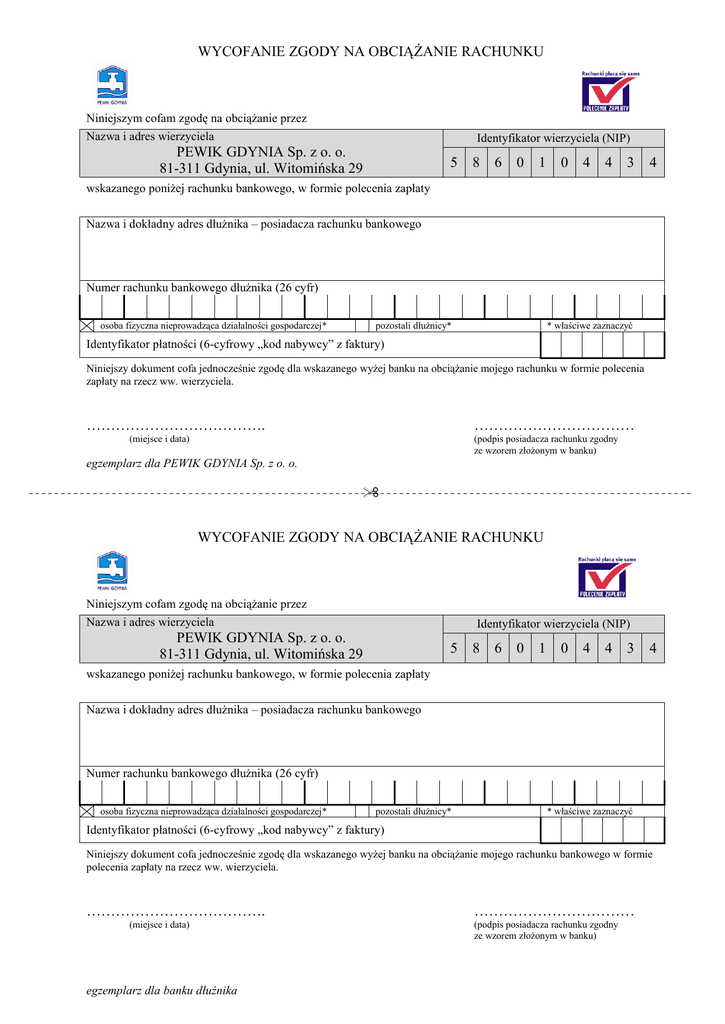 WYCOFANIE ZGODY NA OBCIĄŻANIE RACHUNKU Niniejszym cofam zgodę na obciążanie przez Nazwa i adres wierzyciela Identyfikator wierzyciela (NIP) PEWIK GDYNIA Sp. z o. o. 81-311 Gdynia, ul. Witomińska 29 5 8 6 0 1 0 4 4 3 4 wskazanego poniżej rachunku bankowego, w formie polecenia zapłaty Nazwa i dokładny adres dłużnika – posiadacza rachunku bankowego Numer rachunku bankowego dłużnika (26 cyfr) osoba fizyczna nieprowadząca działalności gospodarczej* pozostali dłużnicy* * właściwe zaznaczyć Identyfikator płatności (6-cyfrowy „kod nabywcy” z faktury) Niniejszy dokument cofa jednocześnie zgodę dla wskazanego wyżej banku na obciążanie mojego rachunku w formie polecenia zapłaty na rzecz ww. wierzyciela. ………………………………. …………………………… (miejsce i data) (podpis posiadacza rachunku zgodny ze wzorem złożonym w banku) egzemplarz dla PEWIK GDYNIA Sp. z o. o. WYCOFANIE ZGODY NA OBCIĄŻANIE RACHUNKU Niniejszym cofam zgodę na obciążanie przez Nazwa i adres wierzyciela Identyfikator wierzyciela (NIP) PEWIK GDYNIA Sp. z o. o. 81-311 Gdynia, ul. Witomińska 29 5 8 6 0 1 0 4 4 3 4 wskazanego poniżej rachunku bankowego, w formie polecenia zapłaty Nazwa i dokładny adres dłużnika – posiadacza rachunku bankowego Numer rachunku bankowego dłużnika (26 cyfr) osoba fizyczna nieprowadząca działalności gospodarczej* pozostali dłużnicy* * właściwe zaznaczyć Identyfikator płatności (6-cyfrowy „kod nabywcy” z faktury) Niniejszy dokument cofa jednocześnie zgodę dla wskazanego wyżej banku na obciążanie mojego rachunku bankowego w formie polecenia zapłaty na rzecz ww. wierzyciela. ………………………………. (miejsce i data) egzemplarz dla banku dłużnika …………………………… (podpis posiadacza rachunku zgodny ze wzorem złożonym w banku)