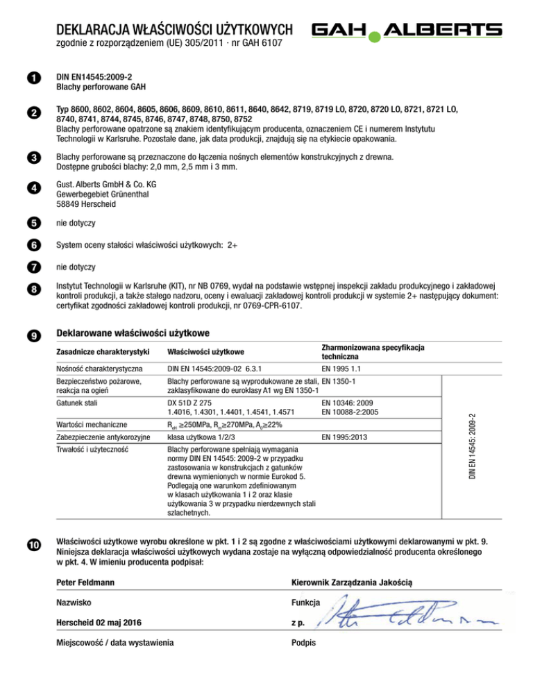DEKLARACJA WŁAŚCIWOŚCI UŻYTKOWYCH zgodnie z rozporządzeniem (UE) 305/2011 · nr GAH 6107 DIN EN14545:2009-2 Blachy perforowane GAH Typ 8600, 8602, 8604, 8605, 8606, 8609, 8610, 8611, 8640, 8642, 8719, 8719 LO, 8720, 8720 LO, 8721, 8721 LO, 8740, 8741, 8744, 8745, 8746, 8747, 8748, 8750, 8752 Blachy perforowane opatrzone są znakiem identyfikującym producenta, oznaczeniem CE i numerem Instytutu Technologii w Karlsruhe. Pozostałe dane, jak data produkcji, znajdują się na etykiecie opakowania. Blachy perforowane są przeznaczone do łączenia nośnych elementów konstrukcyjnych z drewna. Dostępne grubości blachy: 2,0 mm, 2,5 mm i 3 mm. Gust. Alberts GmbH & Co. KG Gewerbegebiet Grünenthal 58849 Herscheid nie dotyczy System oceny stałości właściwości użytkowych: 2+ nie dotyczy Instytut Technologii w Karlsruhe (KIT), nr NB 0769, wydał na podstawie wstępnej inspekcji zakładu produkcyjnego i zakładowej kontroli produkcji, a także stałego nadzoru, oceny i ewaluacji zakładowej kontroli produkcji w systemie 2+ następujący dokument: certyfikat zgodności zakładowej kontroli produkcji, nr 0769-CPR-6107. Zasadnicze charakterystyki Właściwości użytkowe Zharmonizowana specyfikacja techniczna Nośność charakterystyczna DIN EN 14545:2009-02 6.3.1 EN 1995 1.1 Bezpieczeństwo pożarowe, reakcja na ogień Blachy perforowane są wyprodukowane ze stali, EN 1350-1 zaklasyfikowane do euroklasy A1 wg EN 1350-1 Gatunek stali DX 51D Z 275 1.4016, 1.4301, 1.4401, 1.4541, 1.4571 Wartości mechaniczne ReH ≥250MPa, Rm≥270MPa, A0≥22% Zabezpieczenie antykorozyjne klasa użytkowa 1/2/3 Trwałość i użyteczność Blachy perforowane spełniają wymagania normy DIN EN 14545: 2009-2 w przypadku zastosowania w konstrukcjach z gatunków drewna wymienionych w normie Eurokod 5. Podlegają one warunkom zdefiniowanym w klasach użytkowania 1 i 2 oraz klasie użytkowania 3 w przypadku nierdzewnych stali szlachetnych. EN 10346: 2009 EN 10088-2:2005 EN 1995:2013 DIN EN 14545: 2009-2 Deklarowane właściwości użytkowe Właściwości użytkowe wyrobu określone w pkt. 1 i 2 są zgodne z właściwościami użytkowymi deklarowanymi w pkt. 9. Niniejsza deklaracja właściwości użytkowych wydana zostaje na wyłączną odpowiedzialność producenta określonego w pkt. 4. W imieniu producenta podpisał: Peter Feldmann Kierownik Zarządzania Jakością Nazwisko Funkcja Herscheid 02 maj 2016 z p. Miejscowość / data wystawienia Podpis