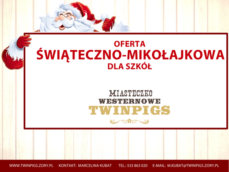 OFERTA ŚWIĄTECZNO-MIKOŁAJKOWA DLA SZKÓŁ WWW.TWINPIGS.ZORY.PL KONTAKT: MARCELINA KUBAT TEL.: 533 863 020 E-MAIL: [email protected] Miasteczko Westernowe Twinpigs w Żorach zaprasza wszystkie dzieci na niezapomniane spotkanie ze Świętym Mikołajem Gości przybyłych do Westernowej Krainy Świętego Mikołaja oczaruje niezwykły klimat nadchodzących Świąt. Przepiękna choinka, tysiące światełek, fabryka zabawek Świętego Mikołaja to tylko namiastka tego, co możecie zobaczyć tej zimy w Miasteczku Westernowym Twinpigs. To właśnie tutaj odkryjesz jak pracują Elfy, zobaczysz Świąteczne Przedstawienie oraz odwiedzisz Świętego Mikołaja, który na pewno znajdzie dla każdego drobny podarunek. WWW.TWINPIGS.ZORY.PL KONTAKT: MARCELINA KUBAT TEL.: 533 863 020 E-MAIL: [email protected] Dodatkowo dla wszystkich gości możliwość skorzystania z atrakcji: Planetarium Tajemnicze podziemie Wesoły zakątek Lucky Luke'a Kino emocji 5D Strzelnica Desperados Pokazy Kowbojskie WWW.TWINPIGS.ZORY.PL KONTAKT: MARCELINA KUBAT TEL.: 533 863 020 E-MAIL: [email protected] CENNIK OFERTY ŚWIĄTECZNO-MIKOŁAJKOWEJ BILET GRUPOWY BILET GRUPOWY FABRYKA ZABAWEK FABRYKA ZABAWEK + ATRAKCJE MIASTECZKA 25,99zł 14,99zł 9,99zł FABRYKA ZABAWEK + ATRAKCJE MIASTECZKA (DZIECI PONIŻEJ 110 CM, NIEPEŁNOSPRAWNI, SENIORZY 60+) DO KAŻDEGO BILETU DROBNY ŚWIĄTECZNY UPOMINEK GRATIS! WWW.TWINPIGS.ZORY.PL KONTAKT: MARCELINA KUBAT TEL.: 533 863 020 E-MAIL: [email protected] MIKOŁAJKOWE PREZENTY DOSTĘPNE SĄ W DWÓCH WARIANTACH CENOWYCH: 20zł Słodycze i mała zabawka 50zł Słodycze, zabawka i gadżety Przy zakupie pakietów prezentowych, rozdawanie przez Św. Mikołaja GRATIS! W przypadku prezentów przygotowywanych we własnym zakresie pobierana jest opłata w wysokości 5 zł/os. PROMOCJA! Przy zakupie pakietów opłata za rozdawanie paczek przez Św. Mikołaja nie będzie pobierana. Istnieje możliwość ustalenia zawartości prezentu. WWW.TWINPIGS.ZORY.PL KONTAKT: MARCELINA KUBAT TEL.: 533 863 020 E-MAIL: [email protected] ZAPRASZAMY! Dane kontaktowe: Marcelina Kubat Kom. 533 863 020 E-mail: [email protected] Przedstawiona oferta cenowa ma charakter informacyjny i jest zaproszeniem do negocjacji, niniejsza oferta nie stanowi oferty handlowej w rozumieniu art. 66 § 1 kodeksu cywilnego oraz innych właściwych przepisów prawnych.