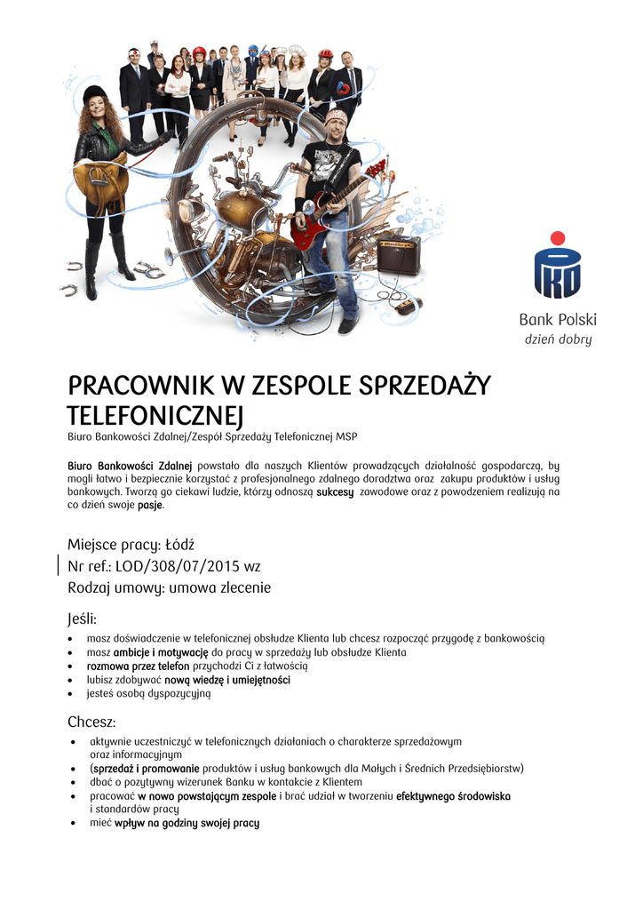 PRACOWNIK W ZESPOLE SPRZEDAŻY TELEFONICZNEJ Biuro Bankowości Zdalnej/Zespół Sprzedaży Telefonicznej MSP Biuro Bankowości Zdalnej powstało dla naszych Klientów prowadzących działalność gospodarczą, by mogli łatwo i bezpiecznie korzystać z profesjonalnego zdalnego doradztwa oraz zakupu produktów i usług bankowych. Tworzą go ciekawi ludzie, którzy odnoszą sukcesy zawodowe oraz z powodzeniem realizują na co dzień swoje pasje. Miejsce pracy: Łódź Nr ref.: LOD/308/07/2015 wz Rodzaj umowy: umowa zlecenie Jeśli: masz doświadczenie w telefonicznej obsłudze Klienta lub chcesz rozpocząć przygodę z bankowością masz ambicje i motywację do pracy w sprzedaży lub obsłudze Klienta rozmowa przez telefon przychodzi Ci z łatwością lubisz zdobywać nową wiedzę i umiejętności jesteś osobą dyspozycyjną Chcesz: aktywnie uczestniczyć w telefonicznych działaniach o charakterze sprzedażowym oraz informacyjnym (sprzedaż i promowanie produktów i usług bankowych dla Małych i Średnich Przedsiębiorstw) dbać o pozytywny wizerunek Banku w kontakcie z Klientem pracować w nowo powstającym zespole i brać udział w tworzeniu efektywnego środowiska i standardów pracy mieć wpływ na godziny swojej pracy Dołącz do Zespołu ludzi z pasją i zostań jednym z nas: zdobądź doświadczenie w największym Banku w Polsce rozwijaj swoje umiejętności sprzedażowe i obsługi Klienta w oparciu o profesjonalne szkolenia i coaching oferujemy konkurencyjne wynagrodzenie stałe plus premię zależną od twoich indywidualnych wyników, im dłużej z nami pracujesz, tym więcej zarabiasz dla najlepszych możliwość zatrudnienia w oparciu o umowę o pracę Zgłoszenia (CV i list motywacyjny) prosimy wysyłać na adres [email protected] z dopiskiem w temacie wiadomości LOD/303/07/2015 wz W nadsyłanych dokumentach prosimy o dopisanie klauzuli: Wyrażam zgodę na przetwarzanie moich danych osobowych do potrzeb niezbędnych do realizacji procesu rekrutacji przez PKO Bank Polski SA i Grupę Kapitałową PKO Banku Polskiego zgodnie z ustawą z dnia 29 sierpnia 1997 r. o ochronie danych osobowych (Dz. U. z 2014 r., poz. 1182 z późn. zm.). Uprzejmie informujemy, że skontaktujemy się jedynie z wybranymi osobami. Prowadzący proces rekrutacji zapewniają poufność.
