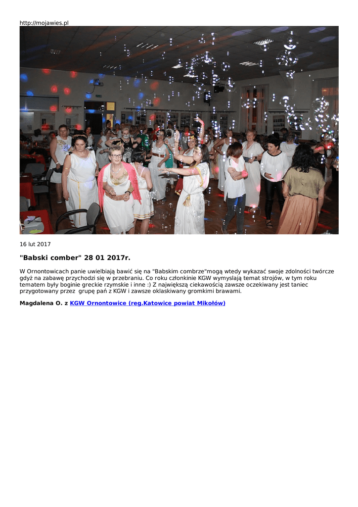 http://mojawies.pl 16 lut 2017 "Babski comber" 28 01 2017r. W Ornontowicach panie uwielbiają bawić się na "Babskim combrze"mogą wtedy wykazać swoje zdolności twórcze gdyż na zabawę przychodzi się w przebraniu. Co roku członkinie KGW wymyslają temat strojów, w tym roku tematem były boginie greckie rzymskie i inne :) Z największą ciekawością zawsze oczekiwany jest taniec przygotowany przez grupę pań z KGW i zawsze oklaskiwany gromkimi brawami. Magdalena O. z KGW Ornontowice (reg.Katowice powiat Mikołów)