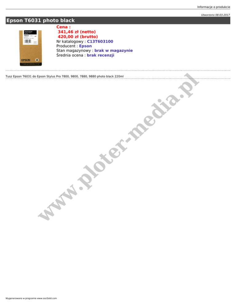 Informacje o produkcie Utworzono 08-03-2017 Epson T6031 photo black Cena : 341,46 zł (netto) 420,00 zł (brutto) Nr katalogowy : C13T603100 Producent : Epson Stan magazynowy : brak w magazynie Średnia ocena : brak recenzji w w w .p lo t er - m ed i a. pl Tusz Epson T6031 do Epson Stylus Pro 7800, 9800, 7880, 9880 photo black 220ml Wygenerowano w programie www.oscGold.com