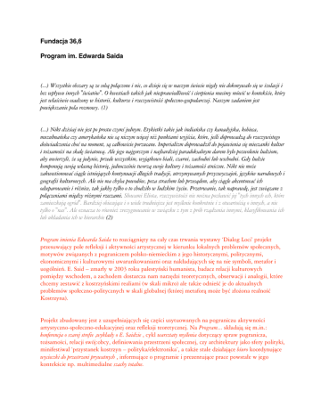 Fundacja 36,6 Program im. Edwarda Saida (...) Wszystkie obszary są ze sobą połączone i nic, co dzieje się w naszym świecie nigdy nie dokonywało się w izolacji i bez wpływu innych "światów". O kwestiach takich jak niesprawiedliwość i cierpienia musimy mówić w kontekście, który jest właściwie osadzony w historii, kulturze i rzeczywistości społeczno-gospodarczej. Naszym zadaniem jest powiększanie pola rozmowy. (1) (...) Nikt dzisiaj nie jest po prostu czymś jednym. Etykietki takie jak indiańska czy kanadyjska, kobieca, muzułmańska czy amerykańska nie są niczym więcej niż punktami wyjścia, które, jeśli doprowadzą do rzeczywistego doświadczenia choć na moment, są całkowicie porzucane. Imperializm doprowadził do pojawienia się mieszanki kultur i tożsamości na skalę światową. Ale jego najgorszym i najbardziej paradoksalnym darem było pozwolenie ludziom, aby uwierzyli, że są jedynie, przede wszystkim, wyjątkowo biali, czarni, zachodni lub wschodni. Gdy ludzie komponują swoją własną historię, jednocześnie tworzą swoje kultury i tożsamości etniczne. Nikt nie może zakwestionować ciągle istniejących kontynuacji długich tradycji, utrzymywanych przyzwyczajeń, języków narodowych i geografii kulturowych. Ale nie ma chyba powodów, poza strachem lub przesądem, aby ciągle akcentować ich odseparowanie i różnice, tak jakby tylko o to chodziło w ludzkim życiu. Przetrwanie, tak naprawdę, jest związane z połączeniami między różnymi rzeczami. Słowami Eliota, rzeczywistości nie można pozbawić jej "tych innych ech, które zamieszkują ogród". Bardziej obiecujące i o wiele trudniejsze jest myślenie konkretnie i z otwartością o innych, a nie tylko o "nas". Ale oznacza to również zrezygnowanie w związku z tym z prób rządzenia innymi, klasyfikowania ich lub układania ich w hierarchie (2) Program imienia Edwarda Saida to rozciągnięty na cały czas trwania wystawy ‘Dialog Loci’ projekt przesuwający pole refleksji i aktywności artystycznej w kierunku lokalnych problemów społecznych, motywów związanych z pograniczem polsko-niemieckim z jego historycznymi, politycznymi, ekonomicznymi i kulturowymi uwarunkowaniami oraz nakładających się na nie symboli, metafor i uogólnień. E. Said – zmarły w 2003 roku palestyński humanista, badacz relacji kulturowych pomiędzy wschodem, a zachodem dostarcza nam narzędzi teoretycznych, obserwacji i analogii, które chcemy zestawić z kostrzyńskimi realiami (w skali mikro) ale także odnieść je do aktualnych problemów społeczno-politycznych w skali globalnej (której metaforą może być złożona realność Kostrzyna). Projekt zbudowany jest z uzupełniających się części usytuowanych na pograniczu aktywności artystyczno-społeczno-edukacyjnej oraz refleksji teoretycznej. Na Program... składają się m.in.: konferencja o szarej strefie ,wykłady o E. Saidzie , cykl warsztaty myślenia dotyczący spraw pogranicza, tożsamości, relacji swój:obcy, definiowania przestrzeni społecznej, czy architektury jako sfery polityki, minifestiwal ‘przystanek kostrzyn – polityka/elektronika’, a także stale działające biuro koordynujące wycieczki do przestrzeni prywatnych , informujące o programie i prezentujące prace powstałe w jego kontekście np. multimedialne szachy totalne. cytaty (źródła i teksty oryginalne) (1) [Edward Said ‘Preface to Orientalism’ in: Al-Ahram Weekly, Cairo, No. 650, 7 - 13 August 2003; tłumaczenie Mariusz Turowski]. (...) Every domain is linked to every other one, and that nothing that goes on in our world has ever been isolated and pure of any outside influence. We need to speak about issues of injustice and suffering within a context that is amply situated in history, culture, and socio- economic reality. Our role is to widen the field of discussion. (2) Edward Said ‘Culture and Imperialism, Speech on York University, Toronto, February 10, 1993; tł. Mariusz Turowski]. (...) No one today is purely one thing. Labels like Indian or Canadian or woman or Muslim or American are no more than starting points which, if followed into actual experience for only a moment, are completely left behind. Imperialism consolidated the mixture of cultures and identities on a world scale. But its worst and most paradoxical gift was to allow people to believe that they were only, mainly, exclusively white or black or Western or Oriental. Just as human beings make their own history, they also make their cultures and ethnic identities. No one can deny the persisting continuities of long traditions, sustained habitations, national languages and cultural geographies. But there seems no reason except fear and prejudice to keep insisting on their separation and distinctiveness, as if that was all human life was about. Survival, in fact, is about the connections between things. In Eliot's phrase, reality cannot be deprived of the "other echoes that inhabit the garden." It is more rewarding and more difficult to think concretely and sympathetically about others than only about "us." But this also means not trying to rule others, not trying to classify them or put them in hierarchies (...)