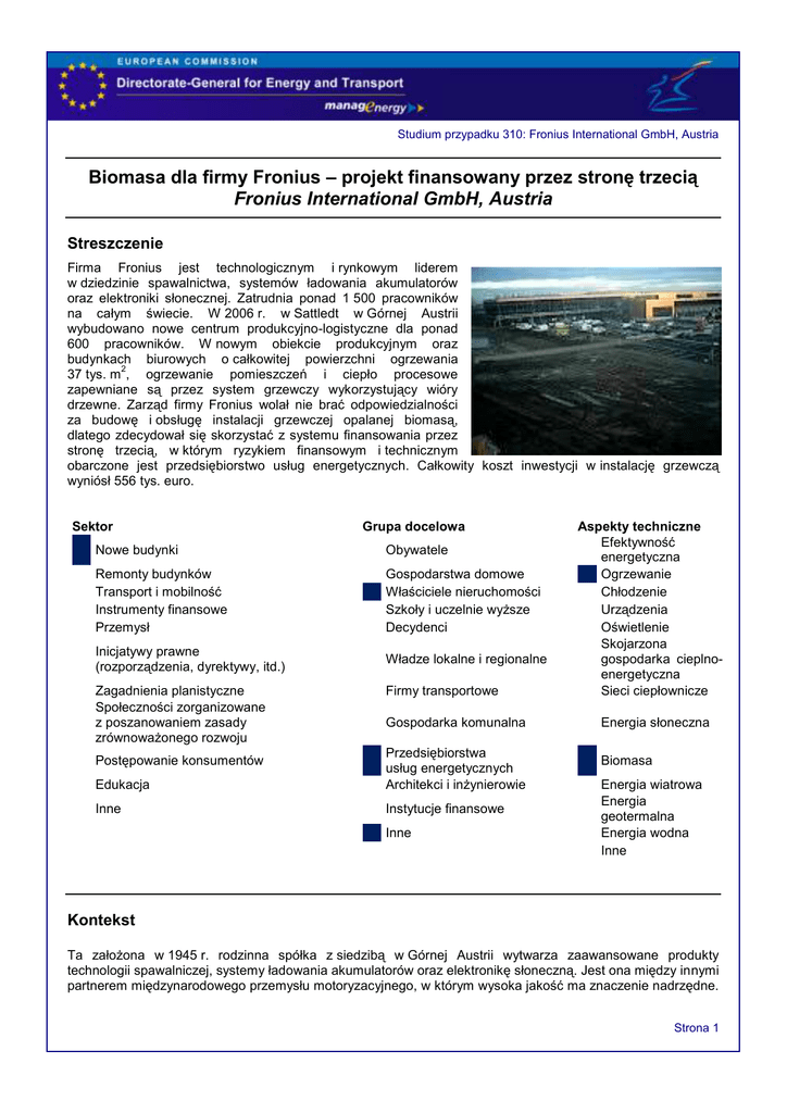 Studium przypadku 310: Fronius International GmbH, Austria Biomasa dla firmy Fronius – projekt finansowany przez stronę trzecią Fronius International GmbH, Austria Streszczenie Firma Fronius jest technologicznym i rynkowym liderem w dziedzinie spawalnictwa, systemów ładowania akumulatorów oraz elektroniki słonecznej. Zatrudnia ponad 1 500 pracowników na całym świecie. W 2006 r. w Sattledt w Górnej Austrii wybudowano nowe centrum produkcyjno-logistyczne dla ponad 600 pracowników. W nowym obiekcie produkcyjnym oraz budynkach biurowych o całkowitej powierzchni ogrzewania 2 37 tys. m , ogrzewanie pomieszczeń i ciepło procesowe zapewniane są przez system grzewczy wykorzystujący wióry drzewne. Zarząd firmy Fronius wolał nie brać odpowiedzialności za budowę i obsługę instalacji grzewczej opalanej biomasą, dlatego zdecydował się skorzystać z systemu finansowania przez stronę trzecią, w którym ryzykiem finansowym i technicznym obarczone jest przedsiębiorstwo usług energetycznych. Całkowity koszt inwestycji w instalację grzewczą wyniósł 556 tys. euro. Sektor Grupa docelowa Nowe budynki Obywatele Remonty budynków Transport i mobilność Instrumenty finansowe Przemysł Gospodarstwa domowe Właściciele nieruchomości Szkoły i uczelnie wyższe Decydenci Inicjatywy prawne (rozporządzenia, dyrektywy, itd.) Władze lokalne i regionalne Zagadnienia planistyczne Społeczności zorganizowane z poszanowaniem zasady zrównoważonego rozwoju Firmy transportowe Gospodarka komunalna Edukacja Przedsiębiorstwa usług energetycznych Architekci i inżynierowie Inne Instytucje finansowe Postępowanie konsumentów Inne Aspekty techniczne Efektywność energetyczna Ogrzewanie Chłodzenie Urządzenia Oświetlenie Skojarzona gospodarka cieplnoenergetyczna Sieci ciepłownicze Energia słoneczna Biomasa Energia wiatrowa Energia geotermalna Energia wodna Inne Kontekst Ta założona w 1945 r. rodzinna spółka z siedzibą w Górnej Austrii wytwarza zaawansowane produkty technologii spawalniczej, systemy ładowania akumulatorów oraz elektronikę słoneczną. Jest ona między innymi partnerem międzynarodowego przemysłu motoryzacyjnego, w którym wysoka jakość ma znaczenie nadrzędne. Strona 1 Studium przypadku 310: Fronius International GmbH, Austria W dziedzinie elektroniki słonecznej, a zwłaszcza inwerterów solarnych, firma Fronius jest numerem 2 w Europie. Ze względu na gwałtowny rozwój firma Fronius podjęła decyzję o budowie w Sattledt w Górnej Austrii nowego centrum produkcyjno-logistycznego. Początek produkcji zaplanowano na początek rok 2007. Ciepło do ogrzewania pomieszczeń oraz ciepło procesowe dostarczane jest przez system grzewczy wykorzystujący wióry drzewne. System ten został zaprojektowany, sfinansowany i jest obsługiwany w ramach planu finansowania przez stronę trzecią. Energia dostarczana do zakładu pochodzi z zespołu fotoelektrycznego o mocy 600 kW. Cele Celem projektu było zaopatrzenie nowego zakładu produkcyjno-logistycznego w oszczędny i przyjazny dla środowiska system ogrzewania, który wykorzystywałby dostępną lokalnie biomasę do ogrzewania pomieszczeń i procesów. Zarząd firmy zadecydował, że budowa i obsługa instalacji grzewczej opalanej biomasą nie zostanie zrealizowana przez firmę. Zamiast tego skorzystano z systemu finansowania przez stronę trzecią, w którym całą odpowiedzialność finansową i techniczną ponosi przedsiębiorstwo usług energetycznych. Dostarczanie do nowego centrum produkcyjno-logistycznego ciepła do ogrzewania pomieszczeń i ciepła procesowego, Wykorzystanie dostępnej lokalnie biomasy, Decyzja o zastosowaniu wiórów drzewnych ze względu na oszczędność i regionalną wartość dodaną, Brak ryzyka technicznego i finansowego, Przewidywalne koszty energii przez okres 15 lat. Proces Ze względu na niedobór przestrzeni we wszystkich austriackich zakładach produkcyjnych firma Fronius zdecydowała się zbudować w Sattledt w Austrii nowe centrum produkcyjno-logistyczne. W 2000 r. firma 2 Fronius zakupiła działkę gruntową o powierzchni ok. 100 tys. m , na której zaplanowano budowę budynku 2 o całkowitej powierzchni ogrzewania 37 tys. m . Na wczesnym etapie projektu rozważano zastosowanie systemu ogrzewania gazem naturalnym, jednak szybko firma Fronius wybrała opcję ogrzewania dostępną lokalnie biomasą, jednakże tylko w ramach projektu finansowanie przez stroną trzecią (TPF). „Nasza wiedza i doświadczenie dotyczą technologii spawalniczych, systemów ładowania akumulatorów oraz elektroniki słonecznej, natomiast do budowy i obsługi instalacji grzewczej opalanej biomasą potrzebujemy specjalistów”, mówi Herbert Mühlböck z firmy Fronius. Dlatego wybrane zostało przedsiębiorstwo usług energetycznych, które wzięło odpowiedzialność za planowanie, finansowanie, budowę i obsługę instalacji. Oficjalnie projekt budowy instalacji grzewczej opalanej biomasą rozpoczął się w listopadzie 2005 r., natomiast etap budowy trwał od marca do lipca 2006 r. W sierpniu 2006 r. instalacja została uruchomiona. W nowym zakładzie Fronius instalację grzewczą opalaną biomasą zaplanowało, sfinansowało i zbudowało przedsiębiorstwo usług energetycznych Ing. Aigner Wasser-Wärme-Umwelt GmbH. W skład instalacji wchodzą dwa kotły, jeden o mocy 1 200 kW przeznaczony do użytku zimą oraz drugi o mocy 350 kW wykorzystywany latem. Instalacja obejmuje także zapasowy kocioł gazowy o mocy 1 300 kW na wypadek obciążeń szczytowych w nowym zakładzie firmy Fronius. Instalacja grzewcza obejmuje system zasilania w paliwo, system odprowadzający spaliny, system oczyszczania spalin, mechanizm bezpieczeństwa, systemy kontrolne i zdalnego sterowania. Całkowita długość mikrosieci dostaw ciepła wynosi 80 m, natomiast roczne zapotrzebowanie na ciepło wynosi około 5 000 MWh. Przedsiębiorstwo usług energetycznych skupuje wióry drzewne bezpośrednio od lokalnych rolników