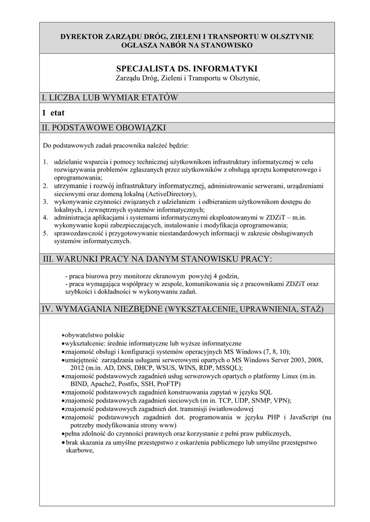 DYREKTOR ZARZĄDU DRÓG, ZIELENI I TRANSPORTU W OLSZTYNIE OGŁASZA NABÓR NA STANOWISKO SPECJALISTA DS. INFORMATYKI Zarządu Dróg, Zieleni i Transportu w Olsztynie, I. LICZBA LUB WYMIAR ETATÓW 1 etat II. PODSTAWOWE OBOWIĄZKI Do podstawowych zadań pracownika należeć będzie: 1. udzielanie wsparcia i pomocy technicznej użytkownikom infrastruktury informatycznej w celu rozwiązywania problemów zgłaszanych przez użytkowników z obsługą sprzętu komputerowego i oprogramowania; 2. utrzymanie i rozwój infrastruktury informatycznej, administrowanie serwerami, urządzeniami sieciowymi oraz domeną lokalną (ActiveDirectory), 3. wykonywanie czynności związanych z udzielaniem i odbieraniem użytkownikom dostępu do lokalnych, i zewnętrznych systemów informatycznych; 4. administracja aplikacjami i systemami informatycznymi eksploatowanymi w ZDZiT – m.in. wykonywanie kopii zabezpieczających, instalowanie i modyfikacja oprogramowania; 5. sprawozdawczość i przygotowywanie niestandardowych informacji w zakresie obsługiwanych systemów informatycznych. III. WARUNKI PRACY NA DANYM STANOWISKU PRACY: - praca biurowa przy monitorze ekranowym powyżej 4 godzin, - praca wymagająca współpracy w zespole, komunikowania się z pracownikami ZDZiT oraz szybkości i dokładności w wykonywaniu zadań. IV. WYMAGANIA NIEZBĘDNE (WYKSZTAŁCENIE, UPRAWNIENIA, STAŻ) obywatelstwo polskie wykształcenie: średnie informatyczne lub wyższe informatyczne znajomość obsługi i konfiguracji systemów operacyjnych MS Windows (7, 8, 10); umiejętność zarządzania usługami serwerowymi opartych o MS Windows Server 2003, 2008, 2012 (m.in. AD, DNS, DHCP, WSUS, WINS, RDP, MSSQL); znajomość podstawowych zagadnień usług serwerowych opartych o platformy Linux (m.in. BIND, Apache2, Postfix, SSH, ProFTP) znajomość podstawowych zagadnień konstruowania zapytań w języku SQL znajomość podstawowych zagadnień sieciowych (m in. TCP, UDP, SNMP, VPN); znajomość podstawowych zagadnień dot. transmisji światłowodowej znajomość podstawowych zagadnień dot. programowania w języku PHP i JavaScript (na potrzeby modyfikowania strony www) pełna zdolność do czynności prawnych oraz korzystanie z pełni praw publicznych, brak skazania za umyślne przestępstwo z oskarżenia publicznego lub umyślne przestępstwo skarbowe, V. KWALIFIKACJE DODATKOWE umiejętność obsługi i konfiguracji systemów operacyjnych Linux (Debian, Ubuntu Server); umiejętność tworzenia skryptów automatyzujących (bash, Powershell); znajomość środowisk wirtualizacyjnych (VMware, HyperV); umiejętność zarządzania urządzeniami sieci LAN (switche zarządzalne, routery, serwery); znajomość języka angielskiego w stopniu umożliwiającym czytanie dokumentacji informatycznej; umiejętność zarządzania systemem zarządzania relacyjnymi bazami danych ORACLE i/lub DB/2 umiejętność zarządzania siecią bezprzewodową opartą na kontrolerach Wi-Fi i autoryzacji WPA2 Enterprise + RADIUS umiejętność zarządzania sieciowymi macierzami dyskowymi tj.: konfiguracja udziałów sieciowych, przyznawanie do nich praw dostępu, tworzenie kopii zapasowych udziałów, itp (QNAP, NetApp) umiejętność modyfikowania raportów (m in. FastReports, Crystal Reports) VI.UMIEJĘTNOŚCI dyspozycyjność komunikatywność, dobra organizacja pracy, wnikliwość, umiejętność pracy w zespole, odporność na stres, cierpliwość, tolerancja, samodzielność. VII. WYMAGANE DOKUMENTY I OŚWIADCZENIA list motywacyjny, CV, kserokopia dokumentu potwierdzającego wykształcenie, oświadczenie o wyrażeniu zgody na przetwarzanie danych osobowych do celów rekrutacji, oświadczenie o posiadaniu pełnej zdolności do czynności prawnych oraz korzystaniu z pełni praw publicznych, oświadczenie, że kandydat nie był prawomocnie skazany za przestępstwo przeciwko mieniu, przeciwko obrotowi gospodarczemu, przeciwko działalności instytucji państwowych oraz samorządu terytorialnego, przeciwko wiarygodności dokumentów lub za przestępstwo skarbowe, oświadczenie o braku przeciwwskazań zdrowotnych do zajmowania stanowiska specjalisty ds. informatyki kwestionariusz osobowy dla osoby ubiegającej się o zatrudnienie VIII.TERMIN I MIEJSCE SKŁADANIA DOKUMENTÓW Dokumenty należy składać osobiście w sekretariacie Zarządu Dróg, Zieleni i Transportu w Olsztynie (pok.nr 101) lub przesłać pocztą w zamkniętych kopertach do dnia 06 listopada 2015 r. na adres: Zarząd Dróg, Zieleni i Transportu w Olsztynie 10-015 Olsztyn ul. Knosały 3/5B z dopiskiem „Nabór na stanowisko specjalisty ds. informatyki”. Dokumenty, które wpłyną po tym dniu nie będą rozpatrywane. IX.INNE INFORMACJE Wskaźnik zatrudnienia osób niepełnosprawnych w ZDZiT w Olsztynie w miesiącu poprzedzającym datę upublicznienia ogłoszenia o naborze kształtuje się na poziomie powyżej 6%. Dodatkowe informacje można uzyskać w kadrach ul. Knosały 3/5B tel. 89-544-31-07 Dopuszcza się zatrudnienie na czas określony. W terminie 2 tygodni po ogłoszeniu wyniku naboru należy odebrać złożone dokumenty. Po upływie tego terminu dokumenty, które nie będą odebrane zostaną zniszczone komisyjnie. Dyrektor Zarządu Dróg, Zieleni i Transportu w Olsztynie Jerzy Roman