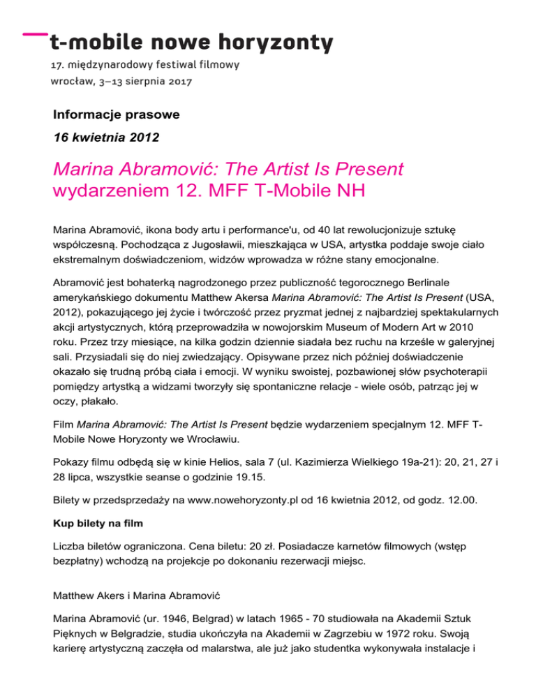 Informacje prasowe 16 kwietnia 2012 Marina Abramović: The Artist Is Present wydarzeniem 12. MFF T-Mobile NH Marina Abramović, ikona body artu i performance'u, od 40 lat rewolucjonizuje sztukę współczesną. Pochodząca z Jugosławii, mieszkająca w USA, artystka poddaje swoje ciało ekstremalnym doświadczeniom, widzów wprowadza w różne stany emocjonalne. Abramović jest bohaterką nagrodzonego przez publiczność tegorocznego Berlinale amerykańskiego dokumentu Matthew Akersa Marina Abramović: The Artist Is Present (USA, 2012), pokazującego jej życie i twórczość przez pryzmat jednej z najbardziej spektakularnych akcji artystycznych, którą przeprowadziła w nowojorskim Museum of Modern Art w 2010 roku. Przez trzy miesiące, na kilka godzin dziennie siadała bez ruchu na krześle w galeryjnej sali. Przysiadali się do niej zwiedzający. Opisywane przez nich później doświadczenie okazało się trudną próbą ciała i emocji. W wyniku swoistej, pozbawionej słów psychoterapii pomiędzy artystką a widzami tworzyły się spontaniczne relacje - wiele osób, patrząc jej w oczy, płakało. Film Marina Abramović: The Artist Is Present będzie wydarzeniem specjalnym 12. MFF TMobile Nowe Horyzonty we Wrocławiu. Pokazy filmu odbędą się w kinie Helios, sala 7 (ul. Kazimierza Wielkiego 19a-21): 20, 21, 27 i 28 lipca, wszystkie seanse o godzinie 19.15. Bilety w przedsprzedaży na www.nowehoryzonty.pl od 16 kwietnia 2012, od godz. 12.00. Kup bilety na film Liczba biletów ograniczona. Cena biletu: 20 zł. Posiadacze karnetów filmowych (wstęp bezpłatny) wchodzą na projekcje po dokonaniu rezerwacji miejsc. Matthew Akers i Marina Abramović Marina Abramović (ur. 1946, Belgrad) w latach 1965 - 70 studiowała na Akademii Sztuk Pięknych w Belgradzie, studia ukończyła na Akademii w Zagrzebiu w 1972 roku. Swoją karierę artystyczną zaczęła od malarstwa, ale już jako studentka wykonywała instalacje i pierwsze prowokacyjne performance. W latach 1973 - 75 przeprowadzała artystyczne eksperymenty na własnym ciele związane z bólem, obrzydzeniem, reakcjami na ingerencje fizyczne (Art Must Be Beautiful/Artist Must Be Beautiful,1975). W 1975 Marina Abramović spotkała w Amsterdamie niemieckiego artystę Ulaya, z którym przez dwanaście lat dzieliła życie i pracę. Oboje zrezygnowali z kontynuowania swoich indywidualnych doświadczeń ze sztuką. Tematem ich wspólnych działań stało się badanie komunikowania, relacji międzyludzkich, a najczęstszą formą ekspresji - otwarty na przypadek performance. Badanie to nie miało charakteru spekulacji intelektualnej, lecz stawiało artystów w aranżowanych przez nich realnych, konkretnych sytuacjach. Od 1977 roku w ich pracy pojawia się element kontemplacji, wielogodzinnego medytowania w bezruchu. Roczny pobyt w Australii wśród pierwotnych plemion stanowił silną inspirację dla dalszej twórczości w tym duchu. Po 1980 powstał Night Sea Crossing, w którym Marina i Ulay siedzieli przy jednym stole naprzeciw siebie w ciszy, najpierw przez siedem godzin, potem przez trzy dni, następnie przez prawie dwa tygodnie. W 1988 przemierzali Chiński Mur - on z zachodu, ona ze wschodu (The Lovers / The Great Wall). Kiedy po dziewięćdziesięciu dniach spotkali się w połowie drogi, zdecydowali się na rozstanie. Od 1989 roku Marina Abramović najczęściej pracuje sama, jej najbardziej znane prace to: Cleaning the mirror, The onion, Cleaning the house, Delusional. We współpracy z Charlesem Atlas artystka zdecydowała się stworzyć swoją biografię. Biography to wielki otwarty spektakl, ciągle aktualizowany w relacji z dziejącymi się wydarzeniami. W 1997 roku zrealizowała Balkan Baroque (Złoty Lew na weneckim biennale), który podobnie jak Cleaning the house i Delusional był inspirowany wojną w Jugosławii, w Bernie zorganizowała pokazywaną później w całej Europie wystawę Marina Abramović Artist Body - Public Body. W 2004 roku powstał Warrior and Virgin Mary, performance z udziałem Jana Fabre. W 2010 roku nowojorska MoMA zorganizowała jej retrospektywną wystawę Marina Abramović: The Artist Is Present. Więcej o wystawie Marina Abramović na planie