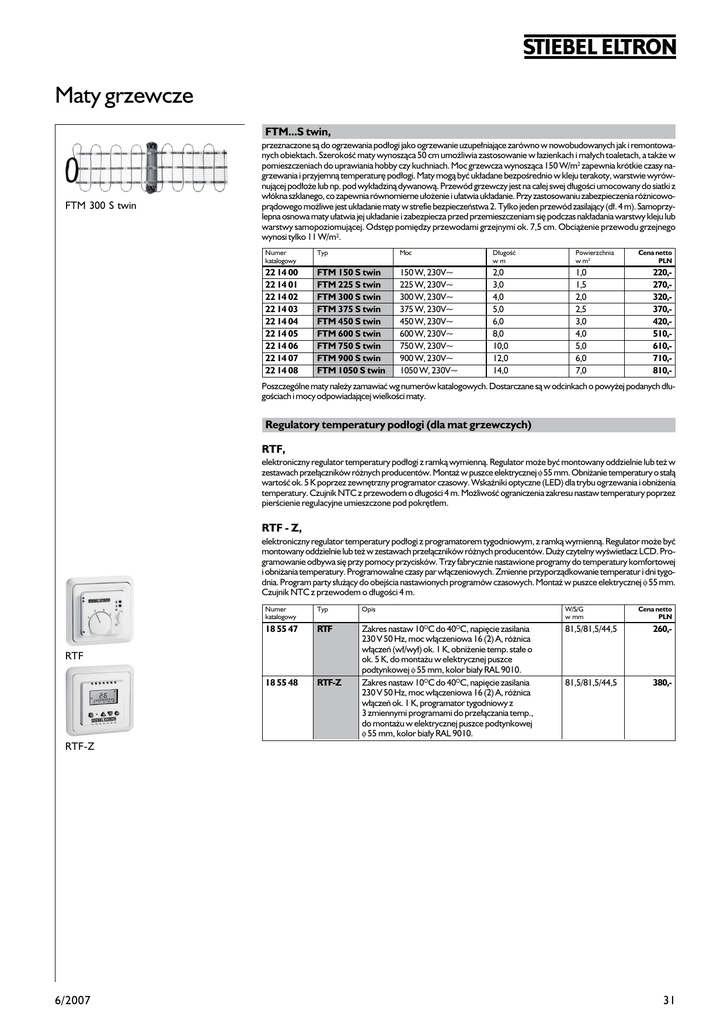 Maty grzewcze FTM...S twin, FTM 300 S twin przeznaczone są do ogrzewania podłogi jako ogrzewanie uzupełniające zarówno w nowobudowanych jak i remontowanych obiektach. Szerokość maty wynosząca 50 cm umożliwia zastosowanie w łazienkach i małych toaletach, a także w pomieszczeniach do uprawiania hobby czy kuchniach. Moc grzewcza wynosząca 150 W/m2 zapewnia krótkie czasy nagrzewania i przyjemną temperaturę podłogi. Maty mogą być układane bezpośrednio w kleju terakoty, warstwie wyrównującej podłoże lub np. pod wykładziną dywanową. Przewód grzewczy jest na całej swej długości umocowany do siatki z włókna szklanego, co zapewnia równomierne ułożenie i ułatwia układanie. Przy zastosowaniu zabezpieczenia różnicowoprądowego możliwe jest układanie maty w strefie bezpieczeństwa 2. Tylko jeden przewód zasilający (dł. 4 m). Samoprzylepna osnowa maty ułatwia jej układanie i zabezpiecza przed przemieszczeniam się podczas nakładania warstwy kleju lub warstwy samopoziomującej. Odstęp pomiędzy przewodami grzejnymi ok. 7,5 cm. Obciążenie przewodu grzejnego wynosi tylko 11 W/m2. Numer katalogowy Typ Moc Długość wm Powierzchnia w m2 22 14 00 22 14 01 22 14 02 22 14 03 22 14 04 22 14 05 22 14 06 22 14 07 22 14 08 FTM 150 S twin FTM 225 S twin FTM 300 S twin FTM 375 S twin FTM 450 S twin FTM 600 S twin FTM 750 S twin FTM 900 S twin FTM 1050 S twin 150 W, 230V~ 225 W, 230V~ 300 W, 230V~ 375 W, 230V~ 450 W, 230V~ 600 W, 230V~ 750 W, 230V~ 900 W, 230V~ 1050 W, 230V~ 2,0 3,0 4,0 5,0 6,0 8,0 10,0 12,0 14,0 1,0 1,5 2,0 2,5 3,0 4,0 5,0 6,0 7,0 Cena netto PLN 220,270,320,370,420,510,610,710,810,- Poszczególne maty należy zamawiać wg numerów katalogowych. Dostarczane są w odcinkach o powyżej podanych długościach i mocy odpowiadającej wielkości maty. Regulatory temperatury podłogi (dla mat grzewczych) RTF, elektroniczny regulator temperatury podłogi z ramką wymienną. Regulator może być montowany oddzielnie lub też w zestawach przełączników różnych producentów. Montaż w puszce elektrycznej φ 55 mm. Obniżanie temperatury o stałą wartość ok. 5 K poprzez zewnętrzny programator czasowy. Wskaźniki optyczne (LED) dla trybu ogrzewania i obniżenia temperatury. Czujnik NTC z przewodem o długości 4 m. Możliwość ograniczenia zakresu nastaw temperatury poprzez pierścienie regulacyjne umieszczone pod pokrętłem. RTF - Z, elektroniczny regulator temperatury podłogi z programatorem tygodniowym, z ramką wymienną. Regulator może być montowany oddzielnie lub też w zestawach przełączników różnych producentów. Duży czytelny wyświetlacz LCD. Programowanie odbywa się przy pomocy przycisków. Trzy fabrycznie nastawione programy do temperatury komfortowej i obniżania temperatury. Programowalne czasy par włączeniowych. Zmienne przyporządkowanie temperatur i dni tygodnia. Program party służący do obejścia nastawionych programów czasowych. Montaż w puszce elektrycznej φ 55 mm. Czujnik NTC z przewodem o długości 4 m. Numer katalogowy Typ Opis W/S/G w mm 18 55 47 RTF Zakres nastaw 10OC do 40OC, napięcie zasilania 230 V 50 Hz, moc włączeniowa 16 (2) A, różnica włączeń (wł/wył) ok. 1 K, obniżenie temp. stałe o ok. 5 K, do montażu w elektrycznej puszce podtynkowej φ 55 mm, kolor biały RAL 9010. 81,5/81,5/44,5 260,- 18 55 48 RTF-Z Zakres nastaw 10OC do 40OC, napięcie zasilania 230 V 50 Hz, moc włączeniowa 16 (2) A, różnica włączeń ok. 1 K, programator tygodniowy z 3 zmiennymi programami do przełączania temp., do montażu w elektrycznej puszce podtynkowej φ 55 mm, kolor biały RAL 9010. 81,5/81,5/44,5 380,- RTF Cena netto PLN RTF-Z 6/2007 31 Maty grzewcze Osprzęt Zestawy montażowe do mat grzewczych, zawierają materiały niezbędne do elektrycznego podłączenia mat grzewczych. FT-S zestaw z elektronicznym regulatorem temperatury podłogi RTF FT-C zestaw z elektronicznym regulatorem temperatury podłogi RTF-Z z programatorem tygodniowym Numer katalogowy Typ Opis 18 56 04 FT-S 18 56 05 FT-C Zestaw standardowy zawierający: elektroniczny regulator temp. podłogi RTF z ramką wymienną, 3,0 m elastycznej rurki z tworzywa sztucznego, do ułożenia czujnika temp., czujnik temp., kolanko 90O do rurki czujnika, 2,0 m rurki do przewodu zimnego, kolanko 90O do przewodu zimnego, 2 szt. puszki elektryczne φ 55 mm. Zestaw standardowy zawierający: elektroniczny regulator temp. podłogi RTF-Z z programatorem tygodniowym z ramką wymienną, 3,0 m elastycznej rurki z tworzywa sztucznego, do ułożenia czujnika temp., czujnik temp., kolanko 90O do rurki czujnika, 2,0 m rurki do przewodu zimnego, kolanko 90O do przewodu zimnego, 2 szt. puszki elektryczne φ 55 mm. FT-S Cena netto PLN 340,- 440,- FT-C 32 6/2007