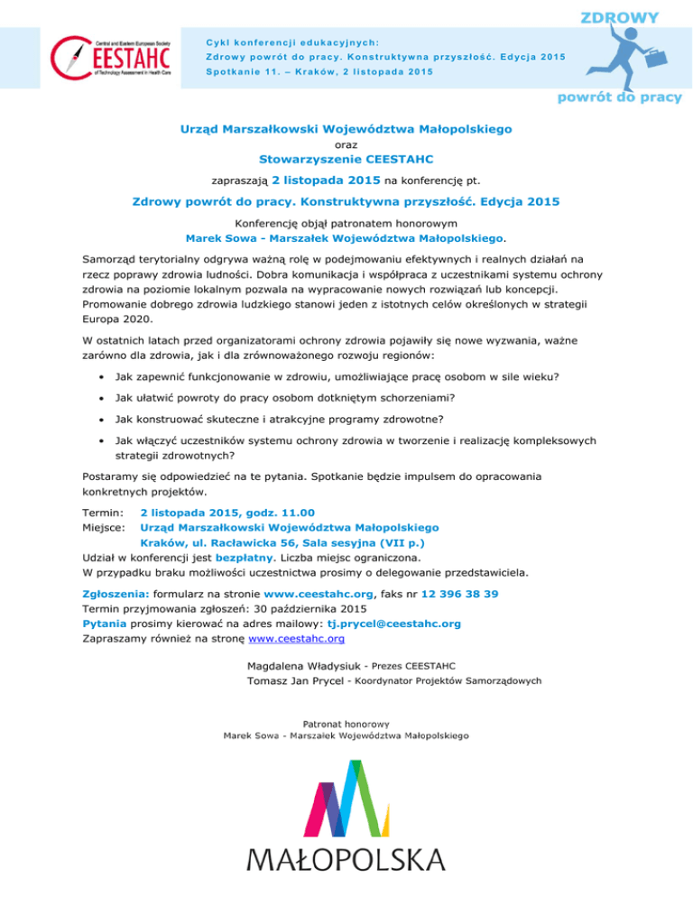 Cykl konferencji edukacyjnych: Z d r o w y p o w r ó t d o p r a c y . K o n s t r u k t yw n a p r z y s z ł o ś ć . E d y c j a 2 0 1 5 Spotkanie 11. – Kraków , 2 listopada 2015 Urząd Marszałkowski Województwa Małopolskiego oraz Stowarzyszenie CEESTAHC zapraszają 2 listopada 2015 na konferencję pt. Zdrowy powrót do pracy. Konstruktywna przyszłość. Edycja 2015 Konferencję objął patronatem honorowym Marek Sowa - Marszałek Województwa Małopolskiego. Samorząd terytorialny odgrywa ważną rolę w podejmowaniu efektywnych i realnych działań na rzecz poprawy zdrowia ludności. Dobra komunikacja i współpraca z uczestnikami systemu ochrony zdrowia na poziomie lokalnym pozwala na wypracowanie nowych rozwiązań lub koncepcji. Promowanie dobrego zdrowia ludzkiego stanowi jeden z istotnych celów określonych w strategii Europa 2020. W ostatnich latach przed organizatorami ochrony zdrowia pojawiły się nowe wyzwania, ważne zarówno dla zdrowia, jak i dla zrównoważonego rozwoju regionów: Jak zapewnić funkcjonowanie w zdrowiu, umożliwiające pracę osobom w sile wieku? Jak ułatwić powroty do pracy osobom dotkniętym schorzeniami? Jak konstruować skuteczne i atrakcyjne programy zdrowotne? Jak włączyć uczestników systemu ochrony zdrowia w tworzenie i realizację kompleksowych strategii zdrowotnych? Postaramy się odpowiedzieć na te pytania. Spotkanie będzie impulsem do opracowania konkretnych projektów. Termin: 2 listopada 2015, godz. 11.00 Miejsce: Urząd Marszałkowski Województwa Małopolskiego Kraków, ul. Racławicka 56, Sala sesyjna (VII p.) Udział w konferencji jest bezpłatny. Liczba miejsc ograniczona. W przypadku braku możliwości uczestnictwa prosimy o delegowanie przedstawiciela. Zgłoszenia: formularz na stronie www.ceestahc.org, faks nr 12 396 38 39 Termin przyjmowania zgłoszeń: 30 października 2015 Pytania prosimy kierować na adres mailowy: [email protected] Zapraszamy również na stronę www.ceestahc.org Magdalena Władysiuk - Prezes CEESTAHC Tomasz Jan Prycel - Koordynator Projektów Samorządowych Cykl konferencji edukacyjnych: Z d r o w y p o w r ó t d o p r a c y . K o n s t r u k t yw n a p r z y s z ł o ś ć . E d y c j a 2 0 1 5 Spotkanie 11. – Kraków , 2 listopada 2015 Termin: 2 listopada 2015, godz. 11.00 Miejsce: Urząd Marszałkowski Województwa Małopolskiego Kraków, ul. Racławicka 56, Sala sesyjna (VII p.) Agenda spotkania Otwarcie Konferencji Czas 11:00 /15 min. Dariusz Madera - Dyrektor Departamentu Zdrowia i Polityki Społecznej Urząd Marszałkowski Województwa Małopolskiego Magdalena Władysiuk - Prezes Stowarzyszenia CEESTAHC Wnioski z pierwszej edycji cyklu „Zdrowy powrót do pracy” 10 min. Magdalena Władysiuk - Prezes Stowarzyszenia CEESTAHC Tomasz Jan Prycel – Dyrektor Zarządzający Stowarzyszenia CEESTAHC Raport „Konstruktywni. Zdrowi – Aktywni – Konstruktywni” 20 min. Jakub Gołąb - Fundacja na rzecz Zdrowego Starzenia się Wczesna diagnostyka oraz kompleksowa specjalistyczna opieka reumatologiczna gwarantem sukcesu populacyjnego 20 min. dr n. med. Bogdan Batko - konsultant wojewódzki w dziedzinie reumatologii, Ordynator Oddziału Reumatologii SS im. J. Dietla w Krakowie Ścieżka szybkiej diagnostyki i leczenia zapalenia stawów - jak to się robi w Śląskim Centrum Reumatologii * 15 min. dr n. med. Aleksandra Zoń-Giebel - Przewodnicząca Oddziału Śląskiego Polskiego Towarzystwa Reumatologicznego Koszty w reumatologii – perspektywa płatnik * 15 min. Przedstawiciel Małopolskiego OW NFZ Czasowa niezdolność do pracy, prewencja rentowa oraz świadczenia rentowe spowodowane chorobami układu kostnostawowego, mięśniowego i tkanki łącznej jako problem Funduszu Ubezpieczeń Społecznych * dr n. med. Jerzy Podhorecki – z-ca Głównego Orzecznika Oddziału ZUS w Krakowie 10 min. Cykl konferencji edukacyjnych: Z d r o w y p o w r ó t d o p r a c y . K o n s t r u k t yw n a p r z y s z ł o ś ć . E d y c j a 2 0 1 5 Spotkanie 11. – Kraków , 2 listopada 2015 Agenda spotkania Rola Agencji Oceny Technologii Medycznych i Taryfikacji w systemie ochrony zdrowia * Czas 15 min. Elżbieta Krajewska - Główny Specjalista w Wydziale Taryfikacji AOTMiT Poczęstunek 13.00 / 15 min. Debata dziennika „Rzeczpospolita” nt. możliwych rozwiązań i działań w regionie 13.15 / 60 min. wczesna diagnostyka samoświadomość pacjentów terapia i rehabilitacja rola samorządów i innych instytucji publicznych i organizacji pozarządowych rola ubezpieczyciela możliwości aplikowania o fundusze unijne Planowany łączny czas trwania konferencji: ok. 3 godz. 15 minut * w trakcie uzgadniania Cykl konferencji edukacyjnych: Z d r o w y p o w r ó t d o p r a c y . K o n s t r u k t yw n a p r z y s z ł o ś ć . E d y c j a 2 0 1 5 Spotkanie 11. – Kraków , 2 listopada 2015 FORMULARZ ZGŁOSZENIOWY na konferencję Zdrowy powrót do pracy. Konstruktywna przyszłość. Edycja 2015 Spotkanie 11. – Kraków, 2 listopada 2015 Zgłoszenia można dokonać na dwa sposoby: 1. wypełnić formularz elektroniczny na stronie www.ceestahc.org 2. przesłać faksem zamieszczony poniżej formularz na nr faks: 12 396 38 39 Termin przyjmowania zgłoszeń: 30 października 2015 PROSIMY O CZYTELNE WYPEŁNIENIE PONIŻSZEGO FORMULARZA DANE OSOBOWE Imię i nazwisko Stanowisko / Funkcja Reprezentowana instytucja Adres instytucji Telefon kontaktowy Adres e-mail Wypełniając niniejszy formularz zgłaszam chęć udziału w spotkaniu edukacyjnym "Zdrowy powrót do pracy", organizowanym przez Stowarzyszenie CEESTAHC w dniu 2 listopada 2015 w Krakowie. Oświadczam, że zapoznałem się z warunkami udziału w tym spotkaniu oraz wyrażam zgodę na przetwarzanie moich danych osobowych niezbędnych do realizacji prac nad Sympozjum EBHC zgodnie z Ustawą z dnia 29 sierpnia 1997 o ochronie danych osobowych (Dz. U. 1997 r. Nr 133 poz. 833).
