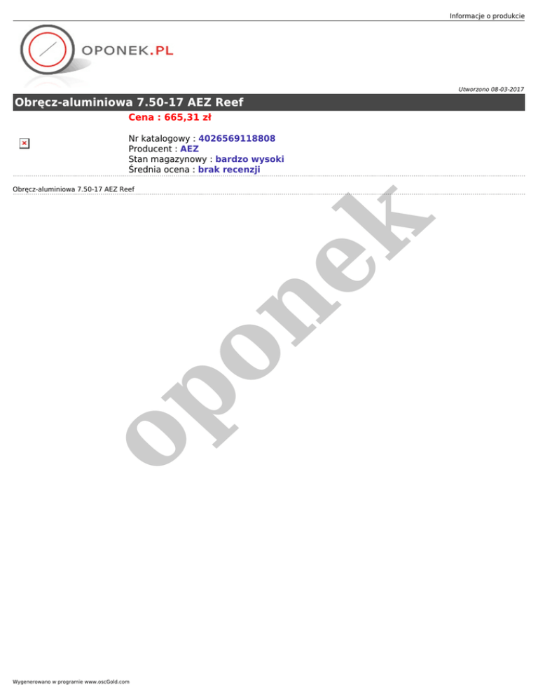 Informacje o produkcie Utworzono 08-03-2017 Obręcz-aluminiowa 7.50-17 AEZ Reef Cena : 665,31 zł Nr katalogowy : 4026569118808 Producent : AEZ Stan magazynowy : bardzo wysoki Średnia ocena : brak recenzji op on ek Obręcz-aluminiowa 7.50-17 AEZ Reef Wygenerowano w programie www.oscGold.com