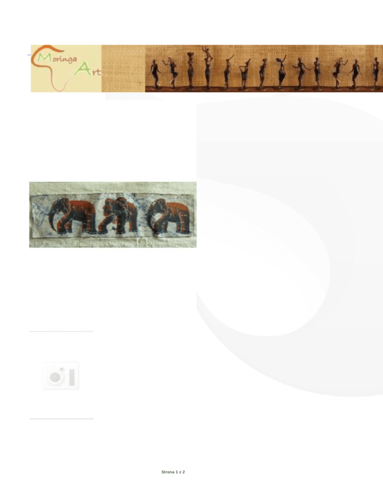 Strona 1 z 2 Niepowtarzalny batik przedstawiający słonie afrykańskie. Wykonany na płótnie (100 % bawełny) przez artystę z pracowni Sekou Diarra. Wymiary: 82 cm x 23 cm, Batik pochodzi z Burkiny Faso. Batik jest to technika polegająca na kolejnym nakładaniu wosku i kąpieli tkaniny w barwniku, który farbuje jedynie miejsca nie zamaskowane warstwą wosku. Proces woskowania i farbowania można, dla uzyskania specjalnych efektów, powtarzać wielokrotnie. Nie da się zrobić dwóch identycznych prac. Wosk ma zawsze trochę inną temperaturę (co sprawia, że inaczej wsiąka w płótno), barwniki nieco inne stężenie i odcień, płótno schnie po ufarbowaniu z różną szybkością. Jednak to krakelura, czyli kolorowe „żyłki” powstające wskutek wnikania barwnika w spękania w wosku, jest tym, po czym rozpoznaje się batik. Dzięki niej każda praca jest niepowtarzalna. Strona 2 z 2