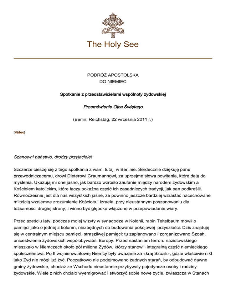 The Holy See PODRÓŻ APOSTOLSKA DO NIEMIEC Spotkanie z przedstawicielami wspólnoty żydowskiej Przemówienie Ojca Świętego (Berlin, Reichstag, 22 września 2011 r.) [Video] Szanowni państwo, drodzy przyjaciele! Szczerze cieszę się z tego spotkania z wami tutaj, w Berlinie. Serdecznie dziękuję panu przewodniczącemu, drowi Dieterowi Graumannowi, za uprzejme słowa powitania, które dają do myślenia. Ukazują mi one jasno, jak bardzo wzrosło zaufanie między narodem żydowskim a Kościołem katolickim, które łączy pokaźna część ich zasadniczych tradycji, jak pan podkreślił. Równocześnie jest dla nas wszystkich jasne, że powinno jeszcze bardziej wzrastać nacechowane miłością wzajemne zrozumienie Kościoła i Izraela, przy nieustannym poszanowaniu dla tożsamości drugiej strony, i winno być głęboko włączone w przepowiadanie wiary. Przed sześciu laty, podczas mojej wizyty w synagodze w Kolonii, rabin Teitelbaum mówił o pamięci jako o jednej z kolumn, niezbędnych do budowania pokojowej przyszłości. Dziś znajduję się w centralnym miejscu pamięci, straszliwej pamięci: tu zaplanowano i zorganizowano Szoah, unicestwienie żydowskich współobywateli Europy. Przed nastaniem terroru nazistowskiego mieszkało w Niemczech około pół miliona Żydów, którzy stanowili integralną część niemieckiego społeczeństwa. Po II wojnie światowej Niemcy były uważane za «kraj Szoah», gdzie właściwie nikt jako Żyd nie mógł już żyć. Początkowo nie podejmowano żadnych starań, by odbudować dawne gminy żydowskie, chociaż ze Wschodu nieustannie przybywały pojedyncze osoby i rodziny żydowskie. Wiele z nich chciało wyemigrować i stworzyć sobie nowe życie, zwłaszcza w Stanach 2 Zjednoczonych lub Izraelu. W tym miejscu należy także wspomnieć o «nocy kryształowej» z 9 na 10 listopada 1938 r. Pełny zasięg tego aktu pogardy dla człowieka dostrzegli jedynie nieliczni, jak proboszcz berlińskiej katedry, Bernhard Lichtenberg, który z ambony katedry św. Jadwigi wołał do wiernych: «Na zewnątrz płonie świątynia — ona także jest domem Bożym». Narodowosocjalistyczny reżim terroru budowany był na micie rasistowskim, którego częścią było odrzucenie Boga Abrahama, Izaaka i Jakuba, Boga Jezusa Chrystusa, a także ludzi, którzy w Niego wierzą. «Wszechmocny», o którym mówił Adolf Hitler, był pogańskim bożkiem, który chciał zastąpić biblijnego Boga, Stwórcę i Ojca wszystkich ludzi. Gdy odmawia się szacunku temu jedynemu Bogu, traci się także szacunek dla godności człowieka. Do czego zdolny jest człowiek odrzucający Boga i jakie oblicze może przybrać naród, który mówi temu Bogu «nie», pokazały pod koniec wojny straszne obrazy z obozów koncentracyjnych. W świetle tych wspomnień z wdzięcznością należy stwierdzić, że od kilkudziesięciu lat widoczny jest nowy rozwój, tak iż można wręcz mówić o rozkwicie życia żydowskiego w Niemczech. Należy podkreślić, że w tym okresie społeczność żydowska zasłużyła się szczególnie w dziedzinie integracji imigrantów z Europy Wschodniej. Z wdzięcznością chciałbym też zwrócić uwagę na pogłębiający się dialog między Kościołem katolickim i judaizmem. Kościół czuje się bardzo bliski narodowi żydowskiemu. Dzięki deklaracji Nostra aetate Soboru Watykańskiego II wstąpiono «w sposób nieodwołalny na drogę dialogu, braterstwa i przyjaźni» (por. przemówienie w synagodze w Rzymie, 17 stycznia 2010 r.). Odnosi się to do całego Kościoła katolickiego, w którym na tej nowej drodze szczególnie intensywnie angażował się błogosławiony papież Jan Paweł II. Dotyczy to oczywiście także Kościoła katolickiego w Niemczech, który jest w pełni świadomy swej szczególnej odpowiedzialności w tej dziedzinie. W sferze publicznej należy odnotować przede wszystkim «Tydzień braterstwa», organizowany co roku w pierwszym tygodniu marca przez lokalne stowarzyszenia współpracy chrześcijańsko-żydowskiej. Strona katolicka prowadzi ponadto doroczne spotkania biskupów i rabinów, a także zorganizowane rozmowy strukturalne z Centralną Radą Żydów. Już w latach siedemdziesiątych Centralny Komitet Katolików Niemieckich (ZdK) stworzył grupę dyskusyjną «Żydzi i chrześcijanie», która na przestrzeni lat wydała wiele wartościowych i użytecznych dokumentów. Nie chciałbym też pominąć historycznego spotkania, które odbyło się w marcu 2006 r., poświęconego dialogowi żydowsko-chrześcijańskiemu, z udziałem kard. Waltera Kaspera. Ta współpraca przynosi owoce. Sądzę, że oprócz tych ważnych inicjatyw my, chrześcijanie, powinniśmy również coraz bardziej zdawać sobie sprawę z naszego głębokiego pokrewieństwa z judaizmem, o czym pan mówił. Dla chrześcijan nie może być mowy o rozłamie w wydarzeniu zbawczym. Zbawienie bierze początek od Żydów (por. J 4, 22). Tam gdzie konflikt między Jezusem a judaizmem Jego czasów 3 postrzegany jest w sposób powierzchowny, jako oderwanie się od Starego Przymierza, zostaje on sprowadzony do idei wyzwolenia, błędnie interpretującej Torę jedynie jako niewolnicze przestrzeganie rytuałów i nakazów zewnętrznych. Faktycznie jednak Kazanie na Górze nie znosi prawa Mojżeszowego, lecz odsłania jego ukryte możliwości i ukazuje nowe wymagania; odwołuje się do najgłębszego fundamentu ludzkiego działania, do serca, gdzie człowiek wybiera między tym, co czyste, a nieczystym, gdzie rozkwita wiara, nadzieja i miłość. Orędzie nadziei, które przekazują księgi Biblii hebrajskiej i chrześcijańskiego Starego Testamentu, zostało przyjęte i rozwinięte w różny sposób przez chrześcijan i Żydów. «Po wiekach konfrontacji za nasze zadanie uważamy przyczynianie się do tego, żeby te dwa sposoby nowej lektury pism biblijnych — chrześcijański i żydowski — zaczęły prowadzić ze sobą dialog, dopomagający do poprawnego rozumienia woli 