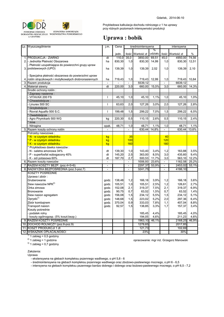 Gdańsk, 2014-06-10 Przykładowa kalkulacja dochodu rolniczego z 1 ha uprawy przy różnych poziomach intensywności produkcji Uprawa : bobik Lp. Wyszczególnienie 1. PRODUKCJA - ZIARNO 2. - Jednolita Płatność Obszarowa - Płatność uzupełniająca do powierzchni grupy upraw 3. podstawowych (UPO) - Specjalna płatność obszarowa do powierzchni upraw 4. roślin strączkowych i motylkowatych drobnonasiennych 3. Razem produkcja 4. Materiał siewny Środki ochrony roślin : * Zaprawy nasienne : - VITAVAX 200 FS * Chwastobójcze : - Linurex 500 SC * Grzybobójcze : - Rovral Aquaflo 500 S.C. * Owadobójcze : - Agro Pirymikarb 500 WG * Inne - Nitragina 5. Razem koszty ochrony roślin Potrzeby nawozowe : * N - w czystym składniku * P - w czystym składniku * K - w czystym składniku * Przykładowa dawka nawozów : - N - saletra amonowa 34% - P - superfosfat wzbogacony 40% - K - sól potasowa 60% 6. Razem koszty nawozów 7. RAZEM KOSZTY BEZP. (poz.4+5+6) 8. NADWYŻKA BEZPOŚREDNIA (poz.3-poz.7) KOSZTY POŚREDNIE Uprawa i zbiór : Gruberowanie Siew nawozów NPK2) Orka zimowa Bronowanie Siew nasion agregatem Opryski1) Zbiór kombajnem Transport nasion Koszty pośrednie - podatek rolny - koszty ogólnogosp. (5% koszt.bezp.) 9. RAZEM KOSZTY POŚREDNIE 10. DOCHÓD ROLNICZY (poz.8-poz.9) 11. KOSZT PRODUKCJI 1 dt 12. WSKAŹNIK OPŁACALNOŚCI 1) 1 zabieg = 0,5 godziny 2) 1 zabieg = 1 godzina 3) 1 zabieg = 0,7 godziny j.m. Cena dt ha średniointensywna intensywna % jedn. Ilość Wartość zł udziału Ilość Wartość zł % 110,0 35,0 3850,00 69,51 45,0 4950,00 74,56 830,30 1,0 830,30 14,99 1,0 830,30 12,51 ha 139,39 1,0 ha dt 719,43 220,00 1,0 3,0 l 45,10 1,0 45,10 1,1% 1,0 45,10 1,0% l 63,63 2,0 127,26 3,0% 2,0 127,26 2,8% l 199,48 1,5 299,22 7,0% 1,5 299,22 6,5% kg 220,30 0,5 110,15 2,6% 0,5 110,15 2,4% opak. - 48,71 1,0 - 48,71 1,1% 630,44 14,8% 1,0 - 48,71 1,1% 630,44 13,6% kg kg kg 139,39 2,52 719,43 12,99 5539,12 660,00 15,5% 35 100 160 dt dt dt - 139,30 145,20 187,70 1,0 2,5 2,7 - godz. godz. godz. godz. godz. godz. godz. godz. 138,48 105,51 152,08 90,75 156,08 148,68 370,04 92,57 1,2 1,0 2,1 0,7 1,5 1,5 0,9 1,5 1,0 1,0 3,0 139,39 2,10 719,43 10,84 6639,12 660,00 14,3% 40 120 180 143,40 3,4% 363,00 8,5% 500,53 11,7% 1006,93 23,6% 2297,37 53,9% 3241,75 166,18 105,51 319,37 63,52 234,12 223,02 333,03 138,85 3,9% 2,5% 7,5% 1,5% 5,5% 5,2% 7,8% 3,3% 185,45 4,4% 194,05 4,6% 1963,10 46,1% 1278,65 121,73 23% 1,2 3,0 3,0 - 1,2 1,2 2,1 0,7 1,5 2,0 1,1 1,7 163,88 3,5% 435,60 9,4% 563,10 12,2% 1162,58 25,2% 2453,02 53,1% 4186,10 166,18 126,61 319,37 63,52 234,12 297,36 407,04 157,37 3,6% 2,7% 6,9% 1,4% 5,1% 6,4% 8,8% 3,4% 185,45 4,0% 211,23 4,6% 2168,25 46,9% 2017,85 102,69 30% opracowanie: mgr inż. Grzegorz Manowski Założenia: Uprawa - ekstensywna na glebach kompleksu pszennego wadliwego, o pH 5,8 - 6 - średniointensywna na glebach kompleksu pszennego wadliwego oraz zbożowo-pastewnego mocnego, o pH 6 - 6,5 - intensywna na glebach kompleksu pszennego bardzo dobrego i dobrego oraz bożowo-pastewnego mocnego, o pH 6,5 - 7,2
