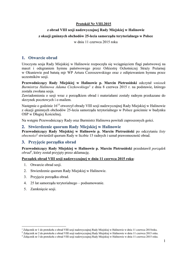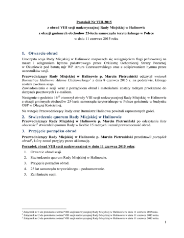 Protokół Nr VIII.2015 z obrad VIII sesji nadzwyczajnej Rady Miejskiej w Halinowie z okazji gminnych obchodów 25-lecia samorządu terytorialnego w Polsce w dniu 11 czerwca 2015 roku 1. Otwarcie obrad Uroczysta sesja Rady Miejskiej w Halinowie rozpoczęła się wciągnięciem flagi państwowej na maszt i odegraniem hymnu państwowego przez Orkiestrę Ochotniczej Straży Pożarnej w Okuniewie pod batutą mjr WP Artura Czereszewskiego oraz z odśpiewaniem hymnu przez uczestników sesji. Przewodniczący Rady Miejskiej w Halinowie p. Marcin Pietrusiński odczytał wniosek Burmistrza Halinowa Adama Ciszkowskiego1 z dnia 8 czerwca 2015 r. na podstawie, którego została zwołana sesja. Zawiadomienia o sesji wraz z porządkiem obrad i materiałami zostały radnym przekazane do skrzynek pocztowych i e-mailem. Następnie o godzinie 1615 otworzył obrady VIII sesji nadzwyczajnej Rady Miejskiej w Halinowie z okazji gminnych obchodów 25-lecia samorządu terytorialnego w Polsce gościnnie w budynku OSP w Długiej Kościelnej. Na wstępie Przewodniczący Rady oraz Burmistrz Halinowa powitali zaproszonych gości. 2. Stwierdzenie quorum Rady Miejskiej w Halinowie Przewodniczący Rady Miejskiej w Halinowie p. Marcin Pietrusiński po odczytaniu listy obecności2 stwierdził quorum Rady w liczbie 15 radnych i uznał prawomocność obrad. 3. Przyjęcie porządku obrad Przewodniczący Rady Miejskiej w Halinowie p. Marcin Pietrusiński przedstawił porządek obrad3, który został przyjęty przez aklamację. Porządek obrad VIII sesji nadzwyczajnej w dniu 11 czerwca 2015 roku: 1. Otwarcie obrad sesji. 2. Stwierdzenie quorum Rady Miejskiej w Halinowie. 3. Przyjęcie porządku obrad. 4. 25 lat samorządu terytorialnego – podsumowanie. 5. Zamknięcie sesji. Załącznik nr 1 do protokołu z obrad VIII sesji nadzwyczajnej Rady Miejskiej w Halinowie w dniu 11 czerwca 2015roku. Załącznik nr 2 do protokołu z obrad VIII sesji nadzwyczajnej Rady Miejskiej w Halinowie w dniu 11 czerwca 2015 roku. 3 Załącznik nr 3 do protokołu z obrad VIII sesji nadzwyczajnej Rady Miejskiej w Halinowie w dniu 11 czerwca 2015 roku. 1 2 1 4. 25 lat samorządu terytorialnego – podsumowanie Podsumowanie 25-lecia samorządności w gminie Halinów przedstawili w formie prezentacji multimedialnej4 i omówili Burmistrz Halinowa p. Adam Ciszkowski oraz Przewodniczący Rady Miejskiej w Halinowie p. Marcin Pietrusiński. Poseł na Sejm RP p. Grzegorz Woźniak odczytał list5 dla Mieszkańców Gminy Halinów od Prezydenta elekta RP p. Andrzeja Dudy. Następnie poseł wyraził szacunek za budowę budynku OSP w Długiej Kościelnej. Na koniec swojego wystąpienia poseł wręczył statuetkę z okazji 25lecia samorządu terytorialnego w Polsce. P. Hanna Kosowska reprezentantka posłanki do Parlamentu Europejskiego p. Julii Pitery odczytała list6 od europosłanki p. Julii Pitery z okazji gminnych obchodów 25-lecia samorządu terytorialnego w Polsce mówiący m.in. o współpracy z Gminą oraz deklaracji wsparcia przy trudnych sprawach dla Gminy Halinów. Przewodniczący Rady Miejskiej w Halinowie p. Marcin Pietrusiński złożył podziękowania dla europoseł p. Julii Pitery za osobiste zaangażowanie w sprawy gminy Halinów, za podjęcie sprawy budowy wysypiska odpadów tuż przy granicy z gminą Halinów (uchylenie pozwolenia na budowę). Wicemarszałek Województwa Mazowieckiego p. Janina Ewa Orzełowska w swoim wystąpieniu odniosła się m.in. do zmian zachodzących w gminie Halinów oraz realizacji dużych inwestycji w ciągu 25-lat. Wicestarosta Powiatu Mińskiego p. Krzysztof Płochocki podziękował za owocną współpracę Gminy Halinów z Powiatem Mińskim. Następnie Wicestarosta wręczył Burmistrzowi Halinowa pamiątkową tarczę z okazji gminnych obchodów 25-lecia samorządu terytorialnego w Polsce. Przewodniczący Rady Powiatu Mińskiego p. Daniel George Milewski w swojej wypowiedzi odniósł się do 30 rocznicy przyjęcia przez Radę Europy Europejskiej Karty Samorządu Lokalnego. Powyższa Karta definiuje samorząd, jako prawo i zdolność społeczności lokalnych, w granicach określonych prawem, do kierowania i zarządzania zasadniczą częścią spraw publicznych na ich własną odpowiedzialność i w interesie ich mieszkańców. Następnie przewodniczący życzył, aby samorządowcy z gminy Halinów wykorzystywani wszystkie swoje zdolności, aby mieszkańcy wykorzystywali wszystkie zdolności samorządowców. Poseł na Sejm RP p. Krzysztof Borkowski w swoim wystąpieniu odniósł się do inwestowania w infrastrukturę, szkoły, kulturę, aby miejscowości na terenie gminy Halinów się rozwijały. Następnie poseł podziękował za współpracę oraz złożył życzenia z okazji 25-lecia samorządu terytorialnego w Polsce. Obecni na uroczystej sesji wysłuchali koncert mieszkańca gminy Halinów p. Mirosława Borczyńskiego z repertuaru Jacka Kaczmarskiego. Burmistrz Halinowa p. Adam Ciszkowski przedstawił historię powstania samorządu terytorialnego w gminie Halinów. Następnie Burmistrz Halinowa przedstawił w formie prezentacji7 multimedialnej wyniki wyborów radnych, wójtów, burmistrzów w latach 1990-2014. Załącznik nr 4 do protokołu z obrad VIII sesji nadzwyczajnej Rady Miejskiej w Halinowie w dniu 11 czerwca 2015 roku. Załącznik nr 5 do protokołu z obrad VIII sesji nadzwyczajnej Rady Miejskiej w Halinowie w dniu 11 czerwca 2015 roku. 6 Załącznik nr 6 do protokołu z obrad VIII sesji nadzwyczajnej Rady Miejskiej w Halinowie w dniu 11 czerwca 2015 roku. 7 Załącznik nr 7 do protokołu z obrad VIII sesji nadzwyczajnej Rady Miejskiej w Halinowie w dniu 11 czerwca 2015 roku. 4 5 2 W dalszej części uroczystości Burmistrz Halinowa p. Adam Ciszkowski oraz Przewodniczący Rady Miejskiej w Halinowie p. Marcin Pietrusiński wręczyli pamiątkowe podziękowania za współpracę byłym pracownikom Urzędu Miejskiego w Halinowie: p. Henryce Pazio, p. Aleftinie Kowalczyk, p. Wiesławie Świerczyńskiej, p. Ha