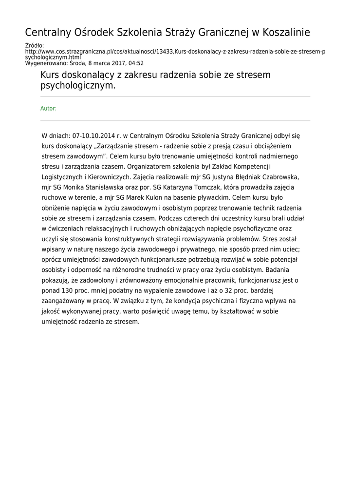 Centralny Ośrodek Szkolenia Straży Granicznej w Koszalinie Źródło: http://www.cos.strazgraniczna.pl/cos/aktualnosci/13433,Kurs-doskonalacy-z-zakresu-radzenia-sobie-ze-stresem-p sychologicznym.html Wygenerowano: Środa, 8 marca 2017, 04:52 Kurs doskonalący z zakresu radzenia sobie ze stresem psychologicznym. Autor: W dniach: 07-10.10.2014 r. w Centralnym Ośrodku Szkolenia Straży Granicznej odbył się kurs doskonalący „Zarządzanie stresem - radzenie sobie z presją czasu i obciążeniem stresem zawodowym”. Celem kursu było trenowanie umiejętności kontroli nadmiernego stresu i zarządzania czasem. Organizatorem szkolenia był Zakład Kompetencji Logistycznych i Kierowniczych. Zajęcia realizowali: mjr SG Justyna Błędniak Czabrowska, mjr SG Monika Stanisławska oraz por. SG Katarzyna Tomczak, która prowadziła zajęcia ruchowe w terenie, a mjr SG Marek Kulon na basenie pływackim. Celem kursu było obniżenie napięcia w życiu zawodowym i osobistym poprzez trenowanie technik radzenia sobie ze stresem i zarządzania czasem. Podczas czterech dni uczestnicy kursu brali udział w ćwiczeniach relaksacyjnych i ruchowych obniżających napięcie psychofizyczne oraz uczyli się stosowania konstruktywnych strategii rozwiązywania problemów. Stres został wpisany w naturę naszego życia zawodowego i prywatnego, nie sposób przed nim uciec; oprócz umiejętności zawodowych funkcjonariusze potrzebują rozwijać w sobie potencjał osobisty i odporność na różnorodne trudności w pracy oraz życiu osobistym. Badania pokazują, że zadowolony i zrównoważony emocjonalnie pracownik, funkcjonariusz jest o ponad 130 proc. mniej podatny na wypalenie zawodowe i aż o 32 proc. bardziej zaangażowany w pracę. W związku z tym, że kondycja psychiczna i fizyczna wpływa na jakość wykonywanej pracy, warto poświęcić uwagę temu, by kształtować w sobie umiejętność radzenia ze stresem. 2014/10/20141013.jpg