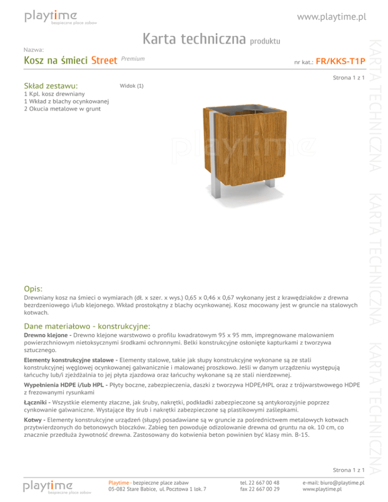 playtime www.playtime.pl bezpieczne place zabaw Kosz na śmieci Street Premium Skład zestawu: Widok (1) nr kat.: FR/KKS-T1P Strona 1 z 1 1 Kpl. kosz drewniany 1 Wkład z blachy ocynkowanej 2 Okucia metalowe w grunt Drewniany kosz na śmieci o wymiarach (dł. x szer. x wys.) 0,65 x 0,46 x 0,67 wykonany jest z krawędziaków z drewna bezrdzeniowego i/lub klejonego. Wkład prostokątny z blachy ocynkowanej. Kosz mocowany jest w gruncie na stalowych kotwach. Dane materiałowo - konstrukcyjne: Elementy konstrukcyjne stalowe - Elementy stalowe, takie jak słupy konstrukcyjne wykonane są ze stali konstrukcyjnej węglowej ocynkowanej galwanicznie i malowanej proszkowo. Jeśli w danym urządzeniu występują łańcuchy lub/i zjeżdżalnia to jej płyta zjazdowa oraz łańcuchy wykonane są ze stali nierdzewnej. Wypełnienia HDPE i/lub HPL - Płyty boczne, zabezpieczenia, daszki z tworzywa HDPE/HPL oraz z trójwarstwowego HDPE z frezowanymi rysunkami Łączniki - Wszystkie elementy złaczne, jak śruby, nakrętki, podkładki zabezpieczone są antykorozyjnie poprzez cynkowanie galwaniczne. Wystające łby śrub i nakrętki zabezpieczone są plastikowymi zaślepkami. Kotwy - Elementy konstrukcyjne urządzeń (słupy) posadawiane są w gruncie za pośrednictwem metalowych kotwach przytwierdzonych do betonowych bloczków. Zabieg ten powoduje odizolowanie drewna od gruntu na ok. 10 cm, co znacznie przedłuża żywotność drewna. Zastosowany do kotwienia beton powinien być klasy min. B-15. Strona 1 z 1 playtime bezpieczne place zabaw Powered by TCPDF (www.tcpdf.org) Playtime - bezpieczne place zabaw 05-082 Stare Babice, ul. Pocztowa 1 lok. 7 tel. 22 667 00 48 fax 22 667 00 29 e-mail: [email protected] www.playtime.pl KARTA TECHNICZNA Drewno klejone - Drewno klejone warstwowo o profilu kwadratowym 95 x 95 mm, impregnowane malowaniem powierzchniowym nietoksycznymi środkami ochronnymi. Belki konstrukcyjne osłonięte kapturkami z tworzywa sztucznego. KARTA TECHNICZNA Opis: KARTA TECHNICZNA Karta techniczna produktu Nazwa: