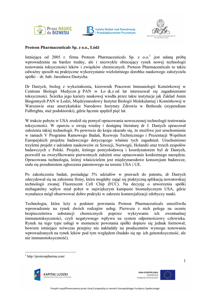 Proteon Pharmaceuticals Sp. z o.o., Łódź Istniejąca od 2005 r. firma Proteon Pharmaceuticals Sp. z o.o. 1 jest udaną próbą wprowadzenia na bardzo trudny, ale i niezwykle obiecujący rynek nowej technologii testowania toksyczności leków i związków chemicznych. Proteon Pharmaceuticals to także odważny sposób na praktyczne wykorzystanie wieloletniego dorobku naukowego założyciela spółki – dr. hab. Jarosława Dastycha. Dr Dastych, biolog z wykształcenia, kierownik Pracowni Immunologii Komórkowej w Centrum Biologii Medyczn je PAN w Ło di, z od lat interesował się zagadnieniami toksyczności. Ścieżka jego kariery naukowej wiodła przez takie instytucje jak Zakład Amin Biogennych PAN w Łodzi, Międzynarodowy Instytut Biologii Molekularnej i Komórkowej w Warszawie oraz amerykańskie Narodowe Instytuty Zdrowia w Bethesda (stypendium Fulbrighta, staż podoktorski), gdzie łącznie spędził pięć lat. W trakcie pobytu w USA zrodził się pomysł opracowania nowoczesnej technologii testowania toksyczności. W oparciu o swoją wiedzę i dostępną literaturę dr J. Dastych opracował założenia takiej technologii. Po powrocie do kraju okazało się, że możliwe jest uruchomienie w ramach V Programu Ramowego Badań, Rozwoju Technicznego i Prezentacji Wspólnot Europejskich projektu badawczego dotyczącego właśnie tych zagadnień. Uruchomiono trzyletni projekt z udziałem naukowców ze Szwecji, Norwegii, Holandii oraz trzech zespołów badawczych z Polski. Projekt, którego pomysłodawcą i koordynatorem był dr Dastych, pozwolił na zweryfikowanie pierwotnych założeń oraz opracowanie konkretnego narzędzia. Opracowana technologia, której właścicielem jest międzynarodowe konsorcjum badawcze, stała się przedmiotem zgłoszenia patentowego na terenie USA i UE. Po zakończeniu badań, posiadając 5% udziałów w prawach do patentu, dr Dastych zdecydował się na założenie firmy, która mogłaby zająć się praktyczną aplikacją nowatorskiej technologii zwanej Fluorescent Cell Chip (FCC). Na decyzję o utworzeniu spółki niebagatelny wpływ miał pobyt w największym kampusie biomedycznym USA, gdzie wynalazca mógł obserwować dobre praktyki w zakresie komercjalizacji zdobyczy nauki. Technologia, która leży u podstaw powstania Proteon Pharmaceuticals umożliwiła wprowadzenie na rynek dwóch rodzajów usług. Pierwsza z nich polega na ocenie bezpieczeństwa substancji chemicznych poprzez wykrywanie ich ewentualnej immunotoksyczności, czyli negatywnego wpływu na system odpornościowy człowieka. Rynek na tego typu usługi w momencie powstania spółki dopiero się jednak formował, bowiem istniejące wówczas przepisy nie nakładały na producentów wymogu testowania wprowadzanych na rynek leków pod tym względem (badało się np. ich genotoksyczność, ale nie immunotoksyczność). 1 http://proteonpharma.com/ 1 Pewnym rozwiązaniem dla Proteonu było więc świadczenie usług na rzecz koncernów farmaceutycznych. Koncerny, które chciały testować bezpieczeństwo swoich leków pod względem immunotoksyczności w zakresie większym niż wymagany przez przepisy, mogły wykorzystać to w walce konkurencyjnej. Po pierwsze zyskiwały przewagę nad ofertą koncernów nietestujących swoich produktów, a po drugie dzięki testom zmniejszały ryzyko wycofania leku z rynku już po jego wprowadzeniu. Drugim obszarem aktywności Proteonu jest usługa polegająca na przeszukiwaniu tzw. bibliotek chemicznych, jakie posiadają koncerny farmaceutyczne, w poszukiwaniu nowych substancji chemicznych (tzw. substancji czynnych) o określonym działaniu immunomodulującym, czyli zamierzonym oddziaływaniu na system odpornościowy. Pozwala to na opracowywanie znacznie efektywniejszych i bezpieczniejszych leków. Poszukiwania takie prowadzone są w fazie tzw. badań przedklinicznych, a to oznacza rynek o wartości co najmniej kilkuset milionów dolarów. Pierwsze próbne przeszukiwanie biblioteki chemicznej jednej z krajowych firm farmaceutycznych potwierdziło skuteczność technologii, jej znaczną wydajność i niskie koszty. Według szacunkowych obliczeń potrzeby inwestycyjne spółki na najbliższe 2-3 lata to maksimum 2,5 mln zł. Środki te miałyby być zaangażowane w uzyskanie dostępu do biblioteki chemicznej lub pozyskanie partnera z dostępem do takiej biblioteki, prace testowe i laboratoryjne oraz niezbędny sprzęt. 2 Spółka jak na razie nie zatrudnia pracowników, podzlecając niezbędne prace. Od 2007 r. firma jest lokatorem Miniinkubatora Firm Biotechnologicznych, który mieści się na terenie kampusu PAN w Łodzi, w budynku Instytutu Biologii Medycznej. Dzięki temu może korzystać z zaplecza technicznego oraz powierzchni biurowej tej jednostki. Sam projekt Mikroinkubatora jest w ocenie władz miasta Łodzi oraz środowiska akademickiego wielkim krokiem w kierunku rozwoju współpracy biznesu i nauki w zakresie innowacji. W przyszłości na bazie Miniinkubatora dla firm biotechnologicznych oraz trzech jednostek PAN zostanie otwarte Regionalne Centrum Badań i Rozwoju w zakresie Nauk Chemicznych, Biologicznych i Medycznych PAN w Łodzi. 3 Źródeł sukcesu firmy Proteon należy upatrywać w konsekwentnej realizacji strategii rozwoju, a także umiejętności dostosowania się do nie zawsze sprzyjających warunków rynkowych. Dzięki kontaktom dr. Dastycha w środowisku naukowym i biznesowym, a także za sprawą regularnego uczestnictwa w targach, konferencjach i spotkaniach ze studentami, firmie udało się wziąć udział w wielu prestiżowych projektach, co z kolei znacząco wpłynęło na poszerzenie know-how firmy. Jeżeli chodzi o stronę finansową przedsięwzięcia, kamieniem milowym było przejęcie 80% udziałów przez polski fundusz kapitału zalążkowego w 2008 r. 2 Tamowicz P., Przedsiębiorczość Akademicka. Spółki Spinn-off w Polsce, Polska Agencja Rozwoju Przedsiębiorczości, Warszawa, 2006. 3 http://www.klasterlodzki.pl/aktualnosci