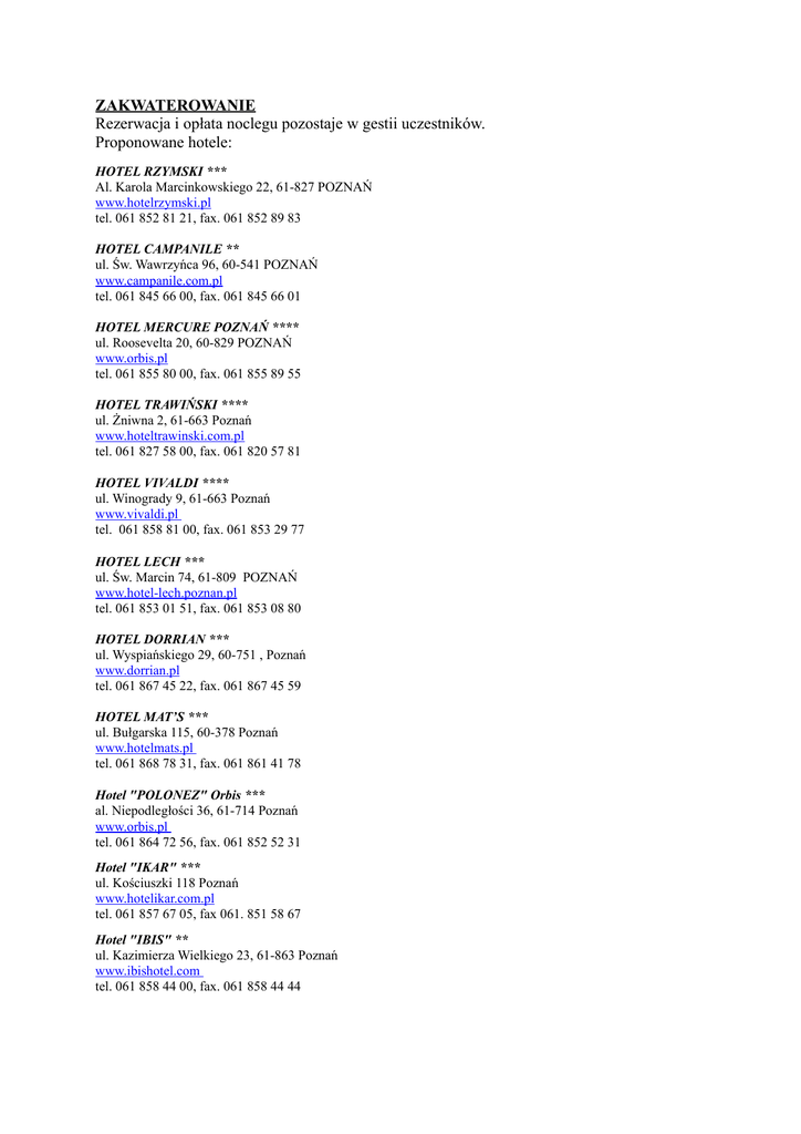 ZAKWATEROWANIE Rezerwacja i opłata noclegu pozostaje w gestii uczestników. Proponowane hotele: HOTEL RZYMSKI *** Al. Karola Marcinkowskiego 22, 61-827 POZNAŃ www.hotelrzymski.pl tel. 061 852 81 21, fax. 061 852 89 83 HOTEL CAMPANILE ** ul. Św. Wawrzyńca 96, 60-541 POZNAŃ www.campanile.com.pl tel. 061 845 66 00, fax. 061 845 66 01 HOTEL MERCURE POZNAŃ **** ul. Roosevelta 20, 60-829 POZNAŃ www.orbis.pl tel. 061 855 80 00, fax. 061 855 89 55 HOTEL TRAWIŃSKI **** ul. Żniwna 2, 61-663 Poznań www.hoteltrawinski.com.pl tel. 061 827 58 00, fax. 061 820 57 81 HOTEL VIVALDI **** ul. Winogrady 9, 61-663 Poznań www.vivaldi.pl tel. 061 858 81 00, fax. 061 853 29 77 HOTEL LECH *** ul. Św. Marcin 74, 61-809 POZNAŃ www.hotel-lech.poznan.pl tel. 061 853 01 51, fax. 061 853 08 80 HOTEL DORRIAN *** ul. Wyspiańskiego 29, 60-751 , Poznań www.dorrian.pl tel. 061 867 45 22, fax. 061 867 45 59 HOTEL MAT’S *** ul. Bułgarska 115, 60-378 Poznań www.hotelmats.pl tel. 061 868 78 31, fax. 061 861 41 78 Hotel "POLONEZ" Orbis *** al. Niepodległości 36, 61-714 Poznań www.orbis.pl tel. 061 864 72 56, fax. 061 852 52 31 Hotel "IKAR" *** ul. Kościuszki 118 Poznań www.hotelikar.com.pl tel. 061 857 67 05, fax 061. 851 58 67 Hotel "IBIS" ** ul. Kazimierza Wielkiego 23, 61-863 Poznań www.ibishotel.com tel. 061 858 44 00, fax. 061 858 44 44