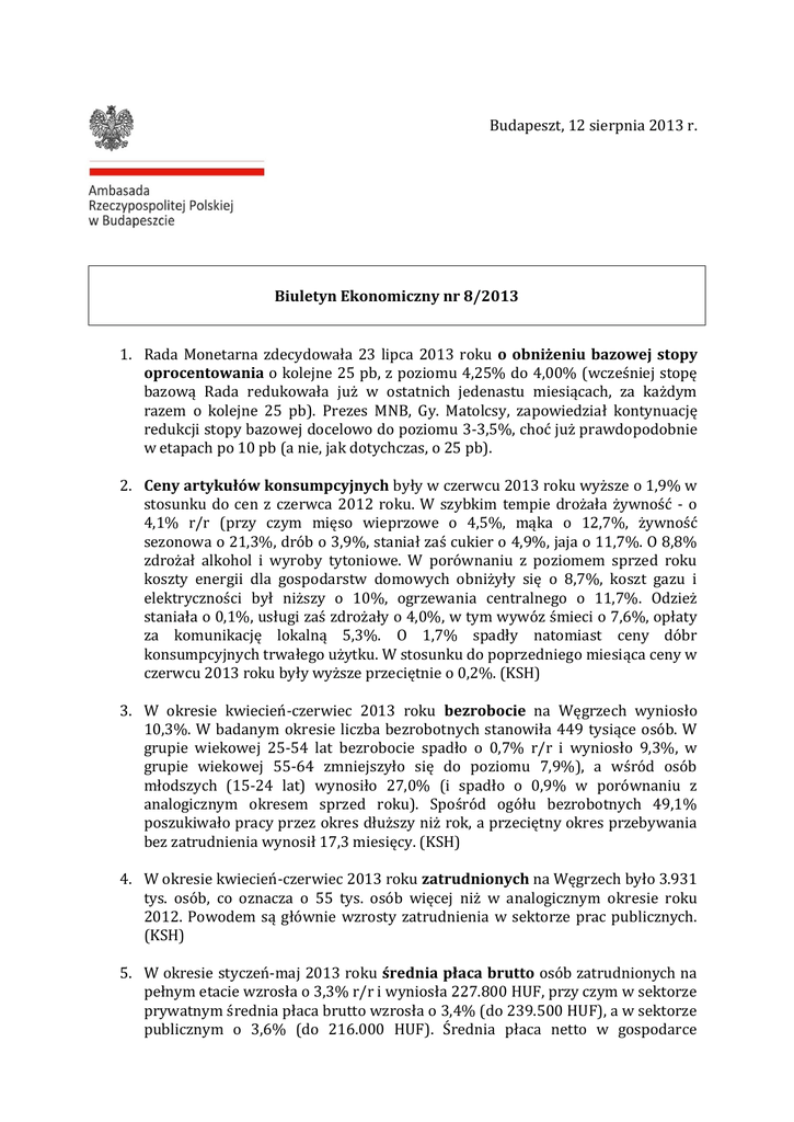 Budapeszt, 12 sierpnia 2013 r. Biuletyn Ekonomiczny nr 8/2013 1. Rada Monetarna zdecydowała 23 lipca 2013 roku o obniżeniu bazowej stopy oprocentowania o kolejne 25 pb, z poziomu 4,25% do 4,00% (wcześniej stopę bazową Rada redukowała już w ostatnich jedenastu miesiącach, za każdym razem o kolejne 25 pb). Prezes MNB, Gy. Matolcsy, zapowiedział kontynuację redukcji stopy bazowej docelowo do poziomu 3-3,5%, choć już prawdopodobnie w etapach po 10 pb (a nie, jak dotychczas, o 25 pb). 2. Ceny artykułów konsumpcyjnych były w czerwcu 2013 roku wyższe o 1,9% w stosunku do cen z czerwca 2012 roku. W szybkim tempie drożała żywność - o 4,1% r/r (przy czym mięso wieprzowe o 4,5%, mąka o 12,7%, żywność sezonowa o 21,3%, drób o 3,9%, staniał zaś cukier o 4,9%, jaja o 11,7%. O 8,8% zdrożał alkohol i wyroby tytoniowe. W porównaniu z poziomem sprzed roku koszty energii dla gospodarstw domowych obniżyły się o 8,7%, koszt gazu i elektryczności był niższy o 10%, ogrzewania centralnego o 11,7%. Odzież staniała o 0,1%, usługi zaś zdrożały o 4,0%, w tym wywóz śmieci o 7,6%, opłaty za komunikację lokalną 5,3%. O 1,7% spadły natomiast ceny dóbr konsumpcyjnych trwałego użytku. W stosunku do poprzedniego miesiąca ceny w czerwcu 2013 roku były wyższe przeciętnie o 0,2%. (KSH) 3. W okresie kwiecień-czerwiec 2013 roku bezrobocie na Węgrzech wyniosło 10,3%. W badanym okresie liczba bezrobotnych stanowiła 449 tysiące osób. W grupie wiekowej 25-54 lat bezrobocie spadło o 0,7% r/r i wyniosło 9,3%, w grupie wiekowej 55-64 zmniejszyło się do poziomu 7,9%), a wśród osób młodszych (15-24 lat) wynosiło 27,0% (i spadło o 0,9% w porównaniu z analogicznym okresem sprzed roku). Spośród ogółu bezrobotnych 49,1% poszukiwało pracy przez okres dłuższy niż rok, a przeciętny okres przebywania bez zatrudnienia wynosił 17,3 miesięcy. (KSH) 4. W okresie kwiecień-czerwiec 2013 roku zatrudnionych na Węgrzech było 3.931 tys. osób, co oznacza o 55 tys. osób więcej niż w analogicznym okresie roku 2012. Powodem są głównie wzrosty zatrudnienia w sektorze prac publicznych. (KSH) 5. W okresie styczeń-maj 2013 roku średnia płaca brutto osób zatrudnionych na pełnym etacie wzrosła o 3,3% r/r i wyniosła 227.800 HUF, przy czym w sektorze prywatnym średnia płaca brutto wzrosła o 3,4% (do 239.500 HUF), a w sektorze publicznym o 3,6% (do 216.000 HUF). Średnia płaca netto w gospodarce narodowej (liczona bez ulg rodzinnych) wzrosła w badanym okresie o 4,6% r/r i wyniosła 149.200 HUF. (KSH) 6. W maju 2013 roku produkcja przemysłowa w relacji r/r odnotowała spadek na poziomie 2,1% (po wyeliminowaniu czynników kalendarzowych wykazywała ten sam poziom). W stosunku do kwietnia br., po wyeliminowaniu czynników sezonowych i kalendarzowych, wskaźnik zmniejszył się w maju 2013 roku o 1,3%. Eksport produktów przemysłowych wzrósł w maju 2013 roku o 0,4% r/r. Sprzedaż krajowa produktów przemysłowych w maju 2013 roku skurczyła się o 3,2% r/r. (KSH) 7. W maju 2013 roku ceny produkcji sprzedanej przemysłu były niższe o 1,3% w stosunku do maja 2012 roku, a w stosunku do poprzedniego miesiąca ceny obniżyły się o 1,2%, przy czym ceny sprzedaży krajowej skurczyły się w maju o 1,5% r/r, a sprzedaży na eksport skurczyły się o 1,2% r/r. (KSH) 8. Węgierski przemysł budowlany odnotował w maju 2013 roku wzrost o11,2% w porównaniu z majem 2012 roku, przy czym produkcja budynków wzrosła o 10,3% r/r, zaś wykonanie robót budowlanych innego typu było wyższe o 12,0% r/r. W stosunku do maja 2012 roku w maju 2013 roku portfel nowych zamówień na roboty budowlane był wyższy o 5,1%, a skumulowana liczba zamówień była wyższa o 10,4%. (KSH) 9. W maju 2013 roku wartość węgierskiego eksportu wyniosła 6 909,0 mln EUR (spadek o 1,9% w stosunku do maja 2012 roku), a importu 6 267,6 mln EUR (spadek o 0,7% r/r), co oznacza, że - dodatnie dla Węgier - saldo obrotów handlowych ukształtowało się na poziomie 641,4 mln EUR. (KSH) 10. W maju 2013 roku wolumen obrotów handlu detalicznego wzrósł się o 2,5% r/r. W stosunku do poprzedniego miesiąca, po wyeliminowaniu czynników sezonowych i kalendarzowych, wolumen obrotów handlu detalicznego skurczył się o 0,2%. Wartość obrotów handlu detalicznego (w tym również internetowego i wysyłkowego) w maju 2013 roku wyniosła 690,1 mld HUF. (KSH) 11. W stosunku do maja 2012 roku ceny produktów rolnych wzrosły w maju 2013 roku o 9,2%, przy czym ceny upraw roślinnych wzrosły o 12,4% r/r, zwierząt żywych i produktów pochodzenia zwierzęcego o 3,2%. (KSH) 12. Bardzo wysoki deficyt budżetowy w lipcu. Wyniósł 129,5 mld HUF, a w pierwszych siedmiu miesiącach br. łącznie 879,8 mld HUF, co stanowi 97% założonego na cały rok deficytu. W poprzednich latach budżet państwa w lipcu zwykle wykazywał nadwyżkę. Wg resortu gospodarki dochody państwa w pierwszych siedmiu miesiącach br. były wyższe o 275 mld HUF od wpływów w roku 2012, ale wydatki były jednocześnie wyższe o 826 mld HUF. Tłumaczone jest to przez ministerstwo przejęciem przez państwo od samorządów finansowania szkół, przychodni lekarskich, szpitali, podwyżką wynagrodzeń lekarzy i nauczycieli, w stosunku do poprzedniego roku wyższe są też jednostkowe i normatywne dotacje, w tym na publiczne media, na budowę mieszkań, dopłaty do poręczeń, wydatki związane z majątkiem państwa. Niższe są natomiast wydatki na obsługę zadłużenia (o 33,3 mld HUF r/r), a olbrzymią 2 nadwyżkę wykazały odrębne fundusze (emerytalne i zdrowia ponad 180 mld HUF). 13. Rezerwy międzynarodowe węgierskiego banku centralnego MNB wyniosły na koniec czerwca 2013 roku 34.329,2 mln EUR (w analogicznym okresie 2012 roku rezerwy wynosiły 35.575,0 mln EUR). W lipcu br. międzynarodowe rezerwy dewizowe zmniejszyły się o 595 mln EUR, co oznacza, że na koniec lipca wyniosły 33,734 mld EUR (jeszcze w kwietniu br. był to p